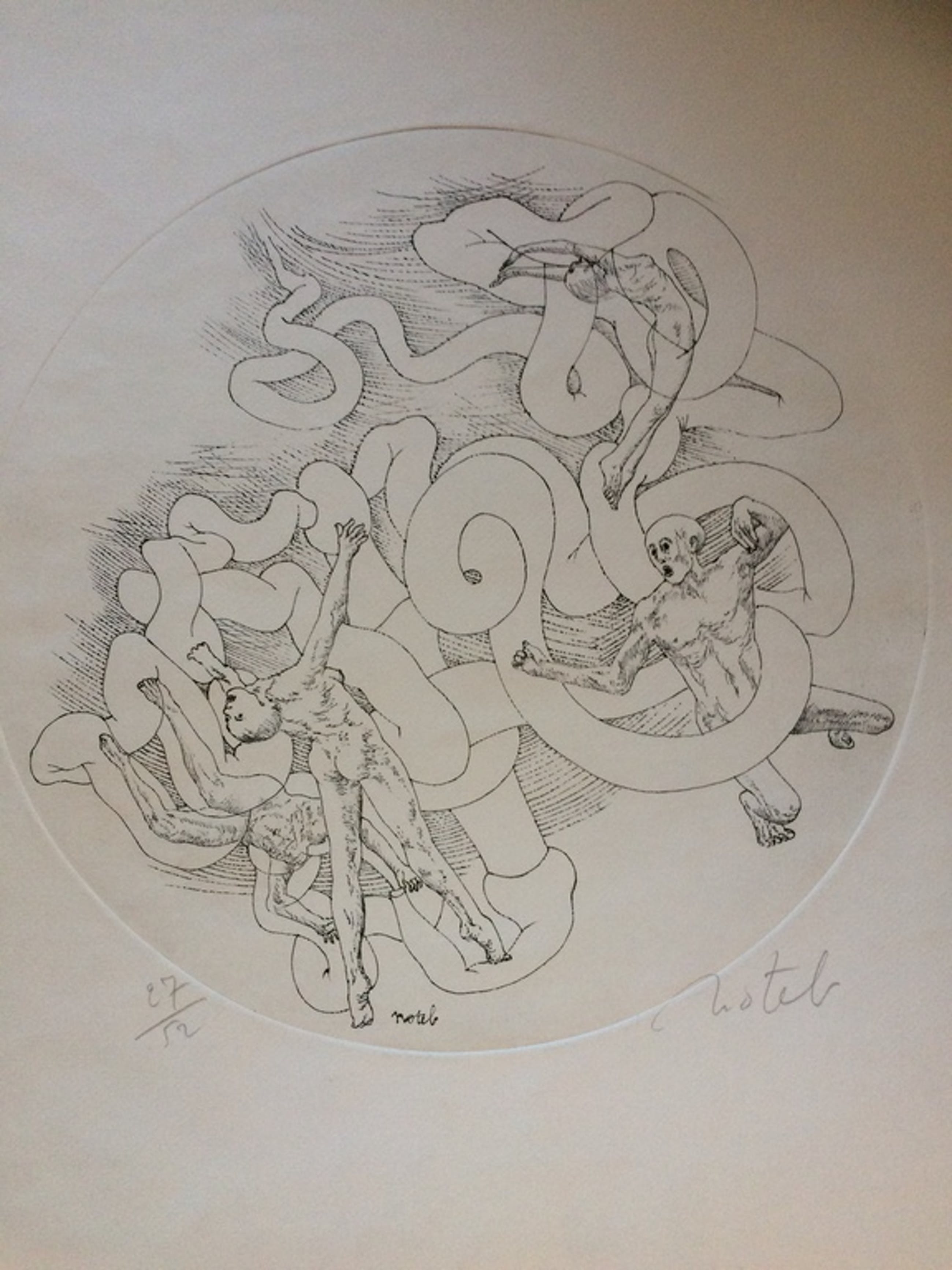 De Friese kunstenaar Gauke Notebomer ( Sneek 1947 - 2009 - zie ook Jacobs / Tableau maart 1996 ) verwerkte deze bijzondere symbolische afbeelding in een ronde ets. Daarvan werden er totaal 52 gemaakt, waarvan dit nr. 27 is (27/52). Het beeld laat een scène zien die kan worden aangeduid als “ Carroussel van het Leven “ Diameter van de cirkel, tevens de beeldmaat is 36 cm. De ets is zowel binnen als buiten de afbeelding gesigneerd met de afkorting ‘ Noteb’. De totale maat in cm is 50 x 66. Verzending per PostNL (k.k.)