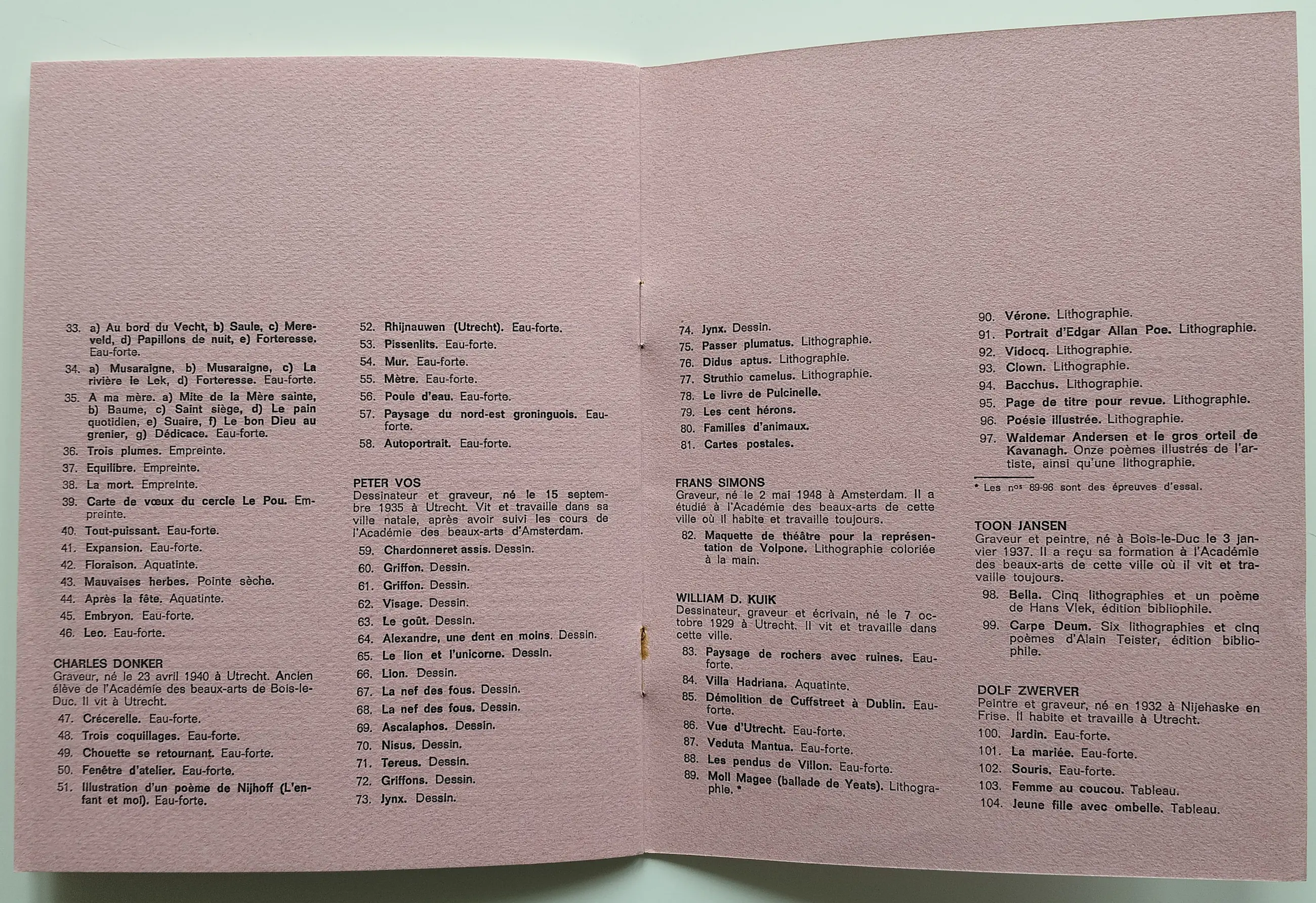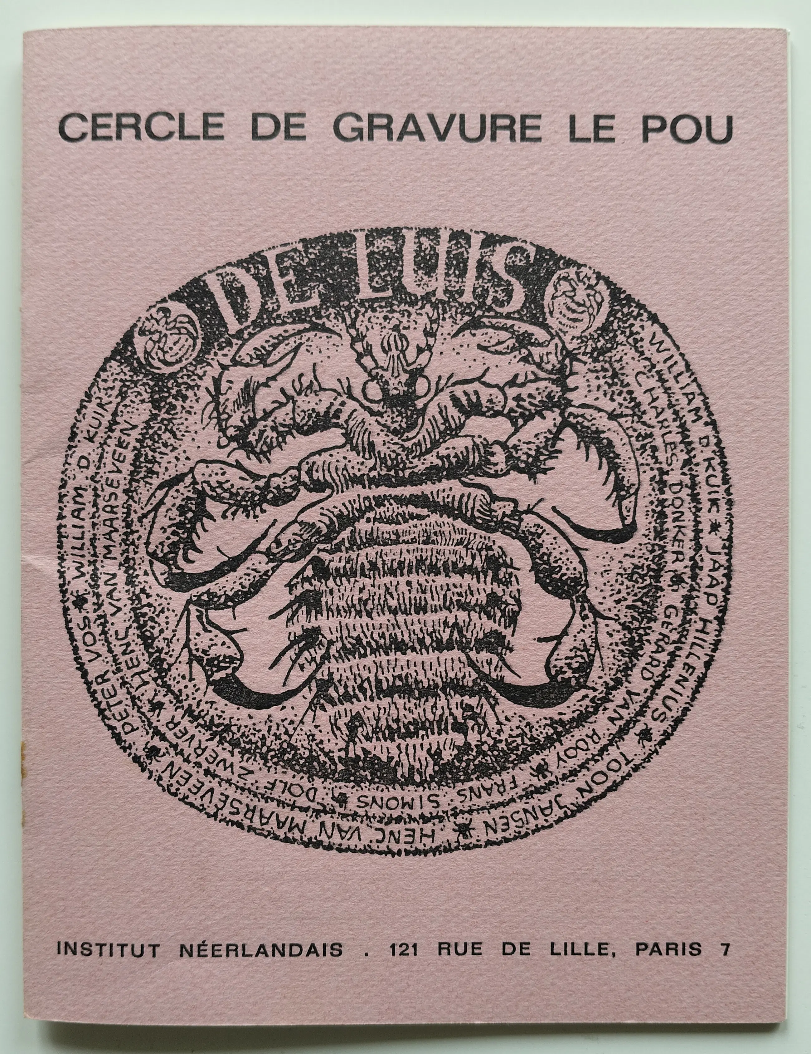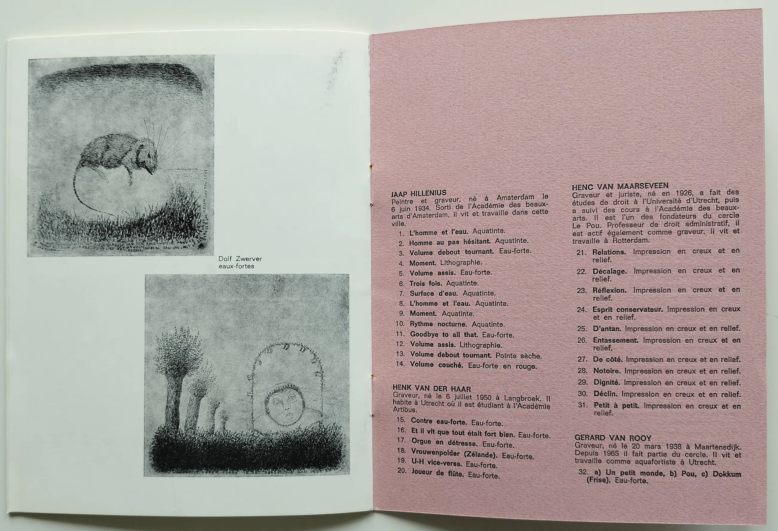 Catalogus Cercle De Gravure Le Pou Paris 1973 met afbeeldingen van Gerard van Rooy, Toon Jansen, Henc van Maarseveen, Henk van der Haar, William D. Kuik, Peter Vos, Charles Donker, Jaap Hilliens en Dolf Zwerver Afmeting 20x15 cm (hxb) Nietjes zijn verroest en er zit op een aantal plaatsen een vlekje, verder goed.