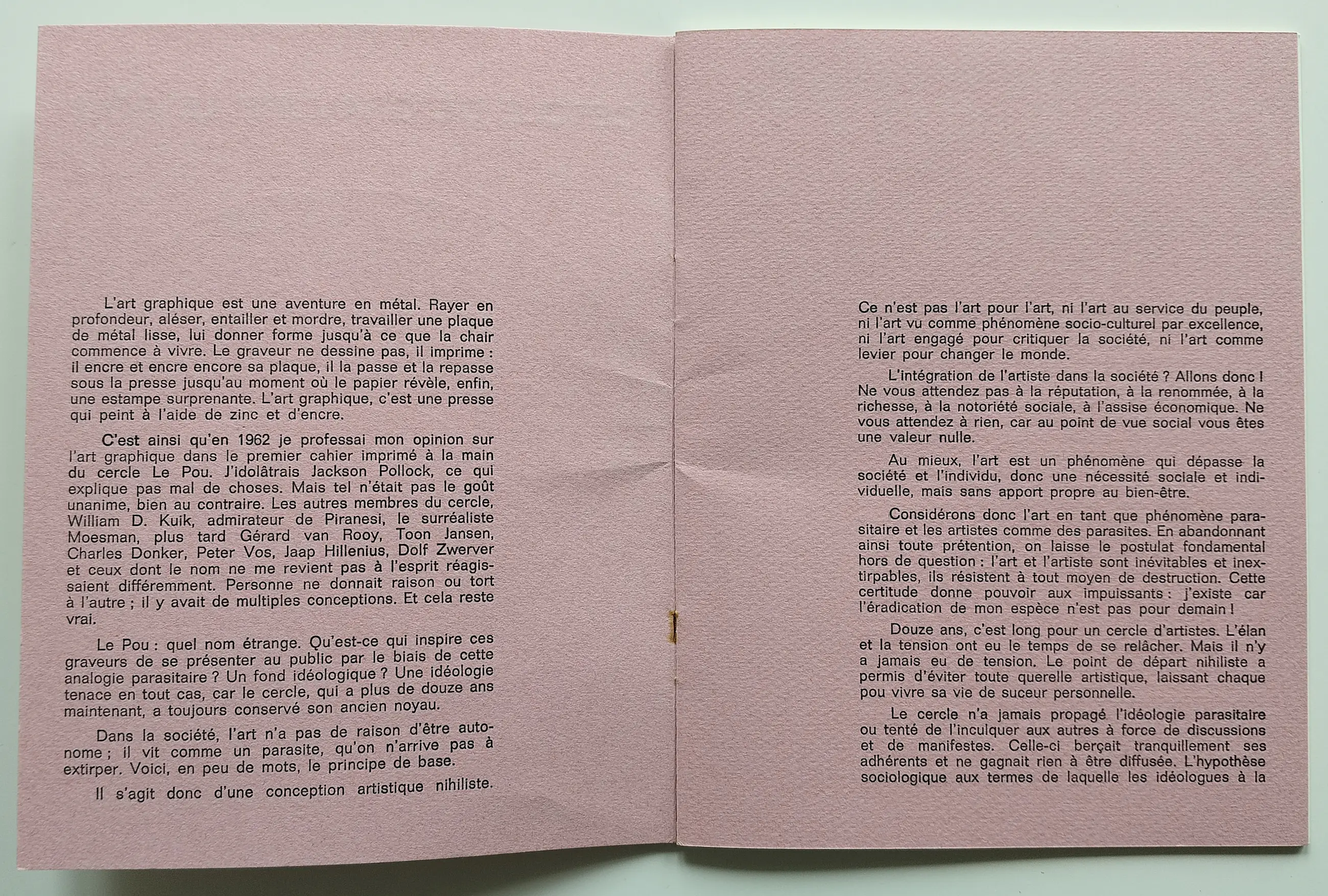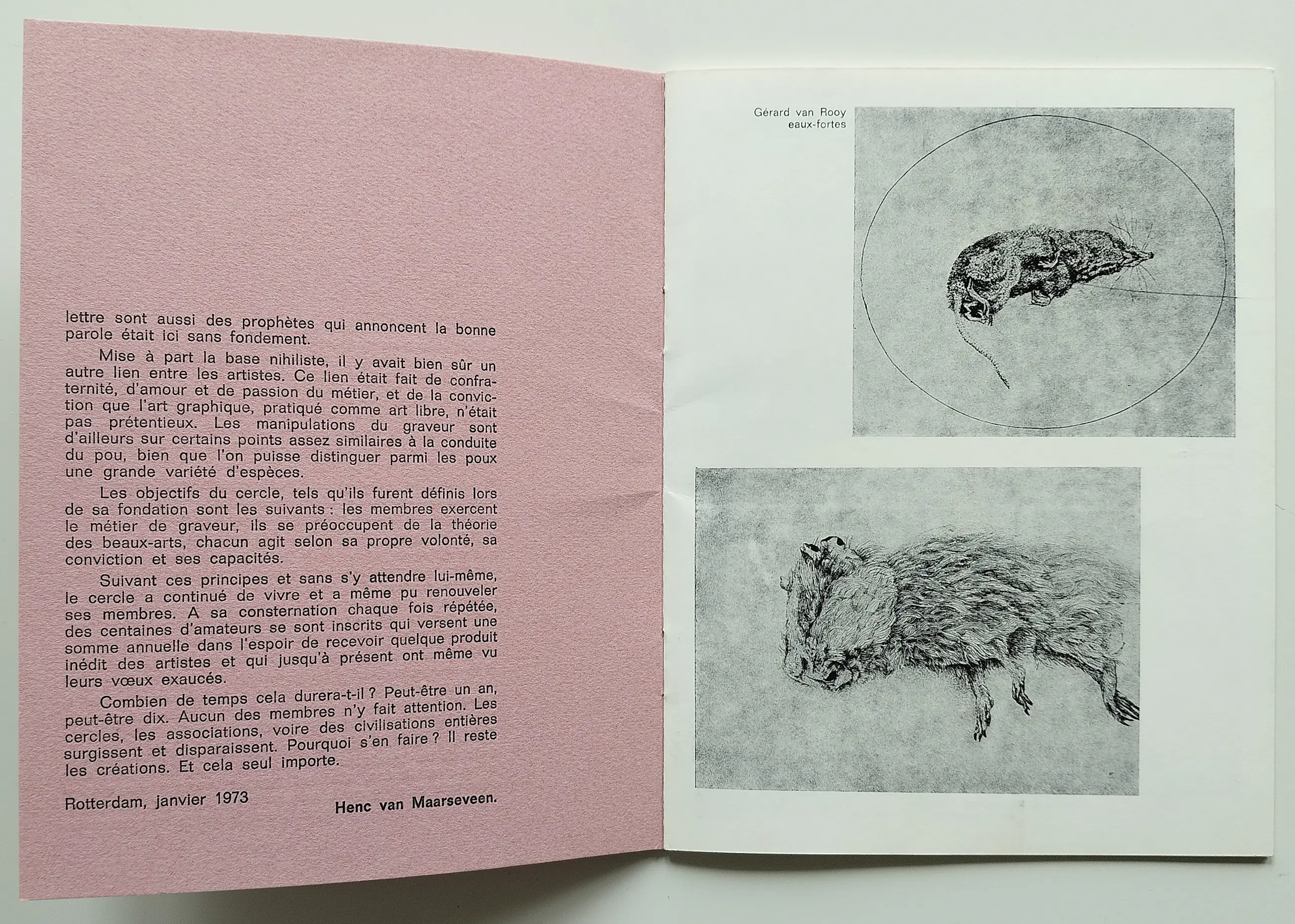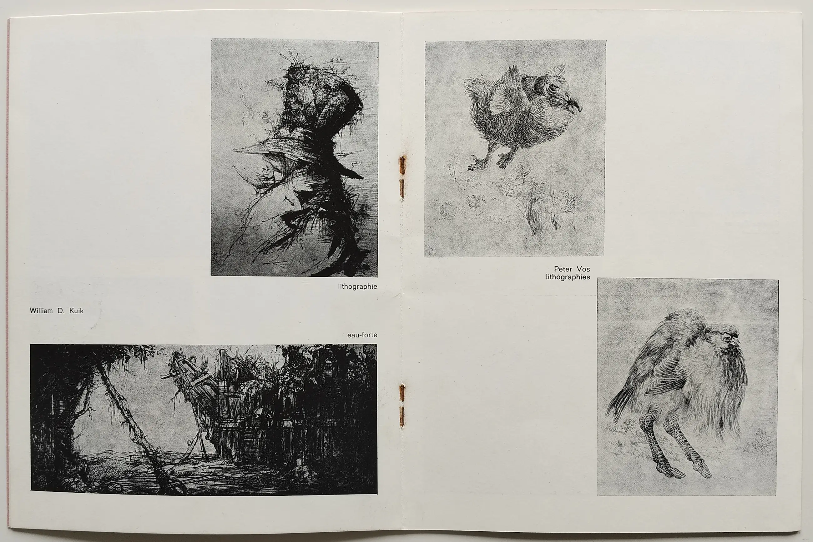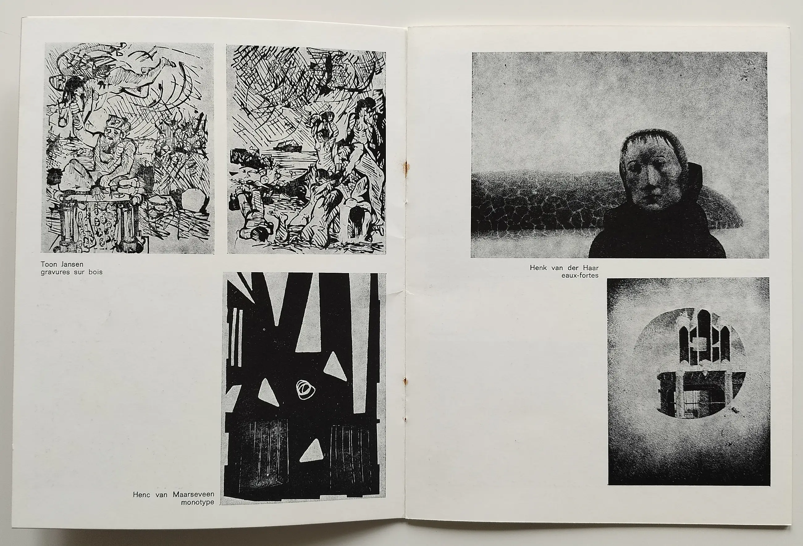 Catalogus Cercle De Gravure Le Pou Paris 1973 met afbeeldingen van Gerard van Rooy, Toon Jansen, Henc van Maarseveen, Henk van der Haar, William D. Kuik, Peter Vos, Charles Donker, Jaap Hilliens en Dolf Zwerver Afmeting 20x15 cm (hxb) Nietjes zijn verroest en er zit op een aantal plaatsen een vlekje, verder goed.