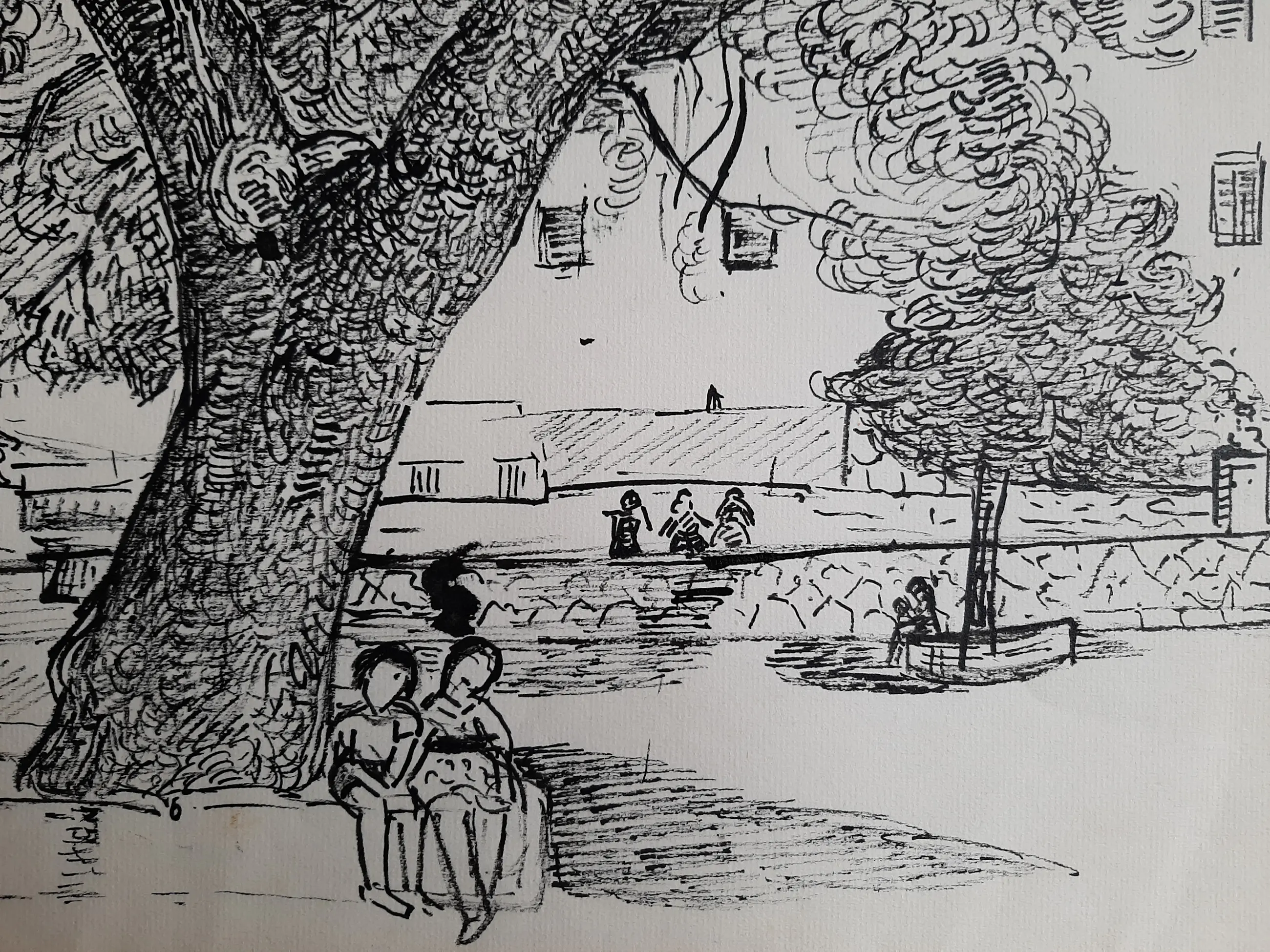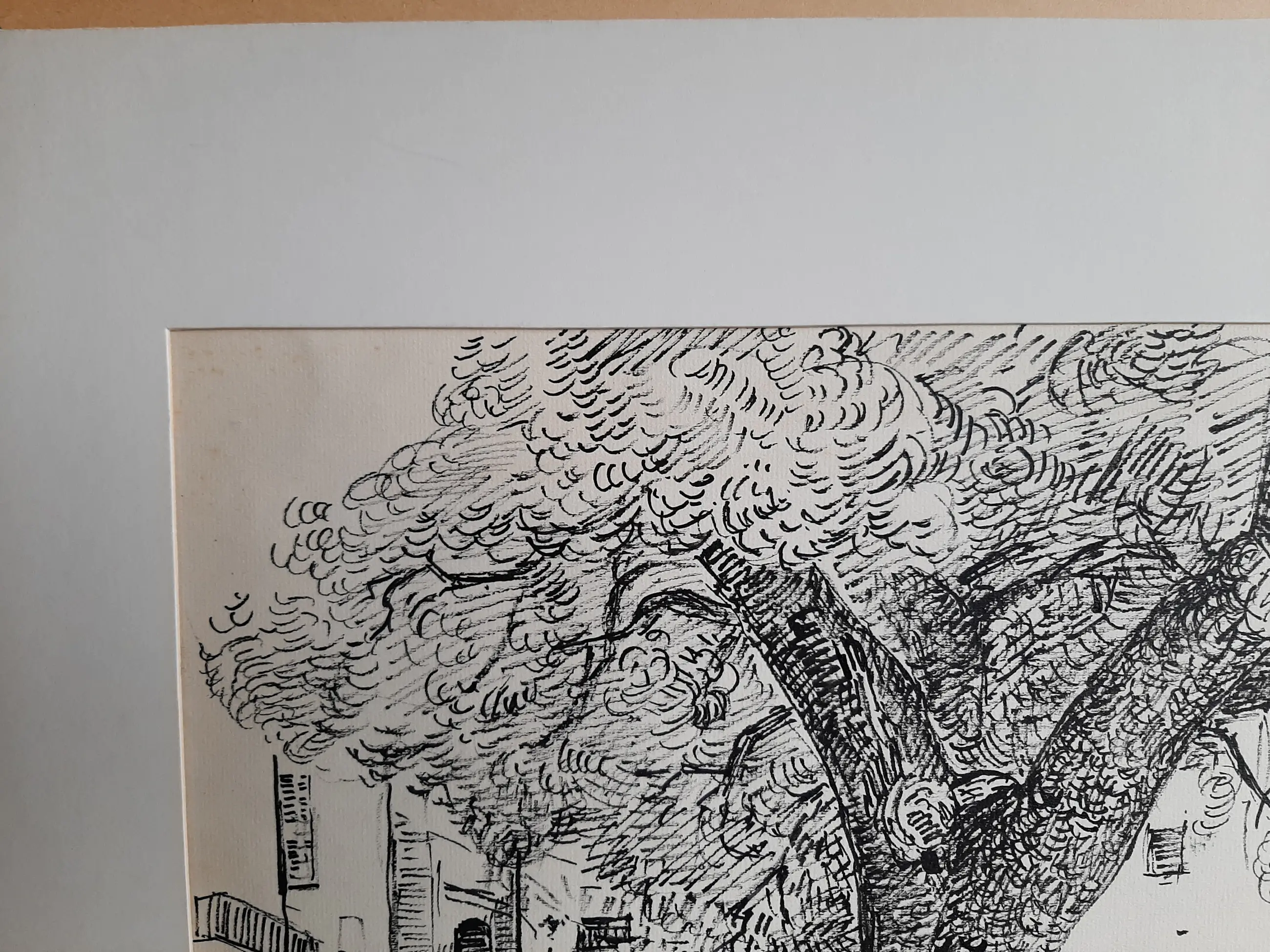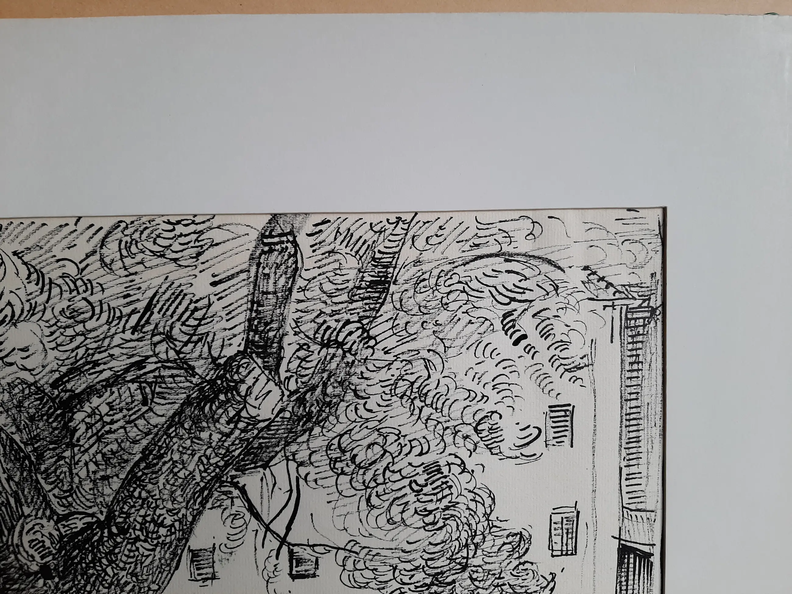 Lichte kreuken aan de randen van het veld, maar deze zijn waarschijnlijk goed glad te strijken. Bruine vlekjes of viezigheid aan de marges.