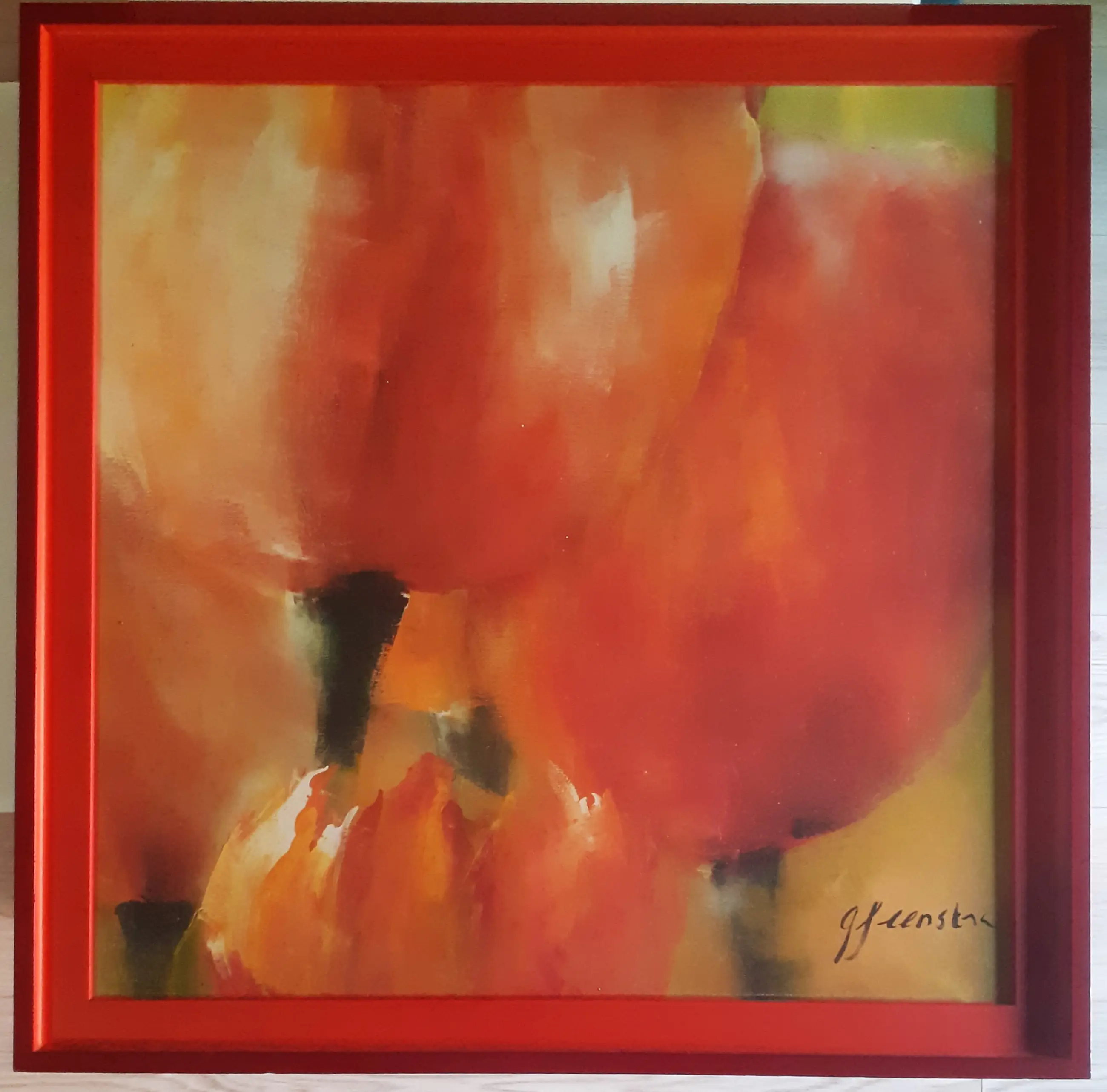 Werk is passend ingelijst in een houten lijst in de kleuren van het werk.