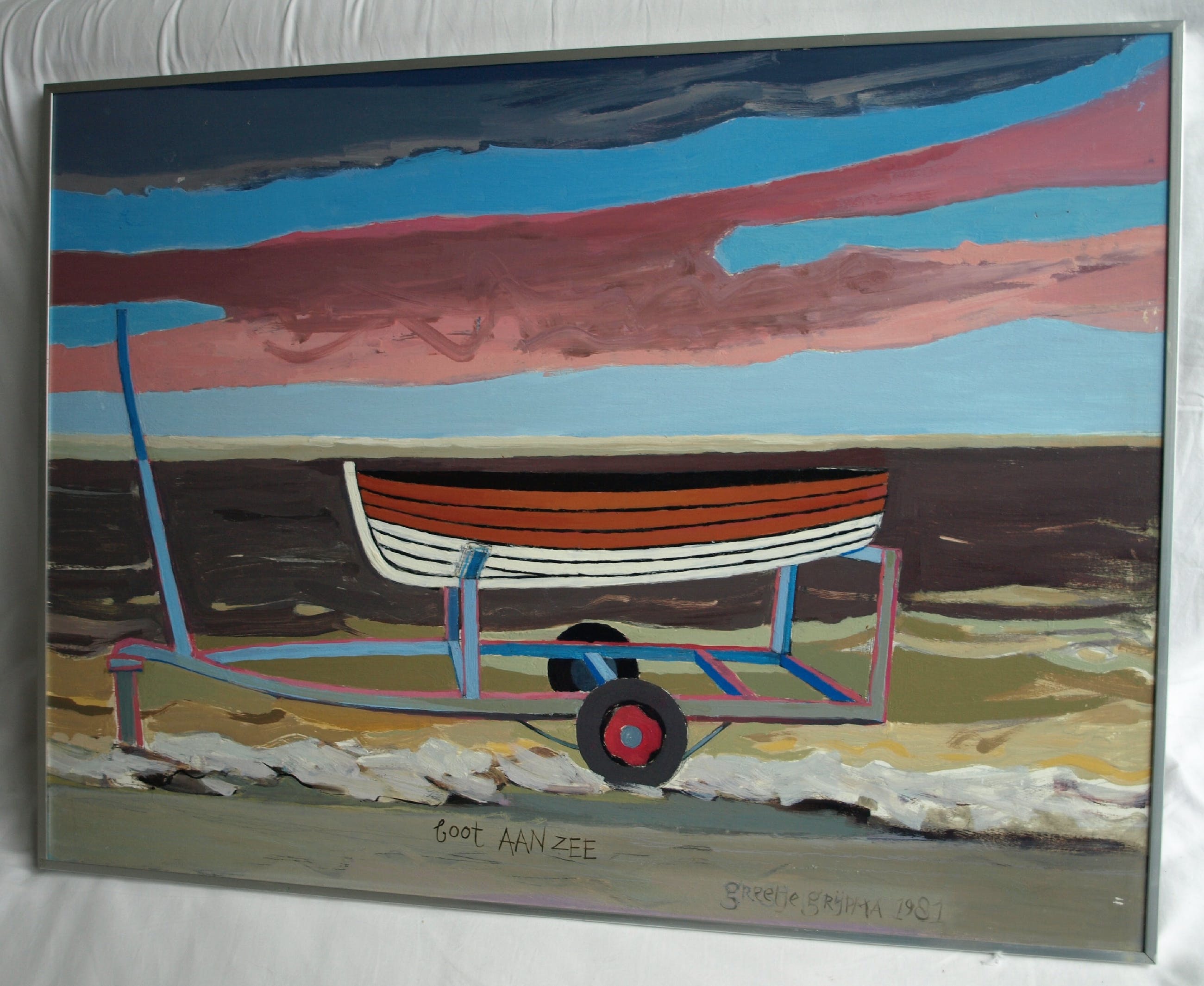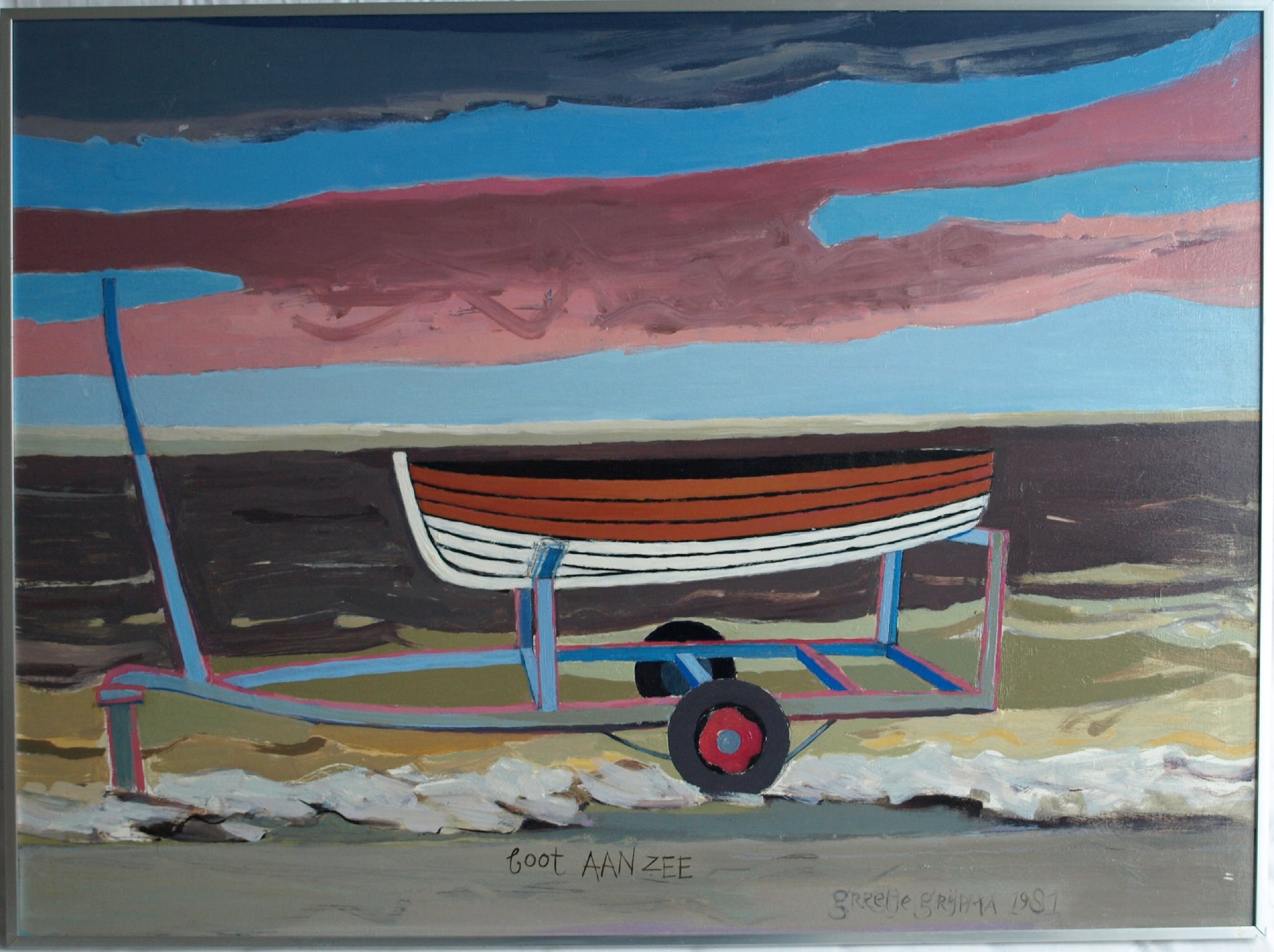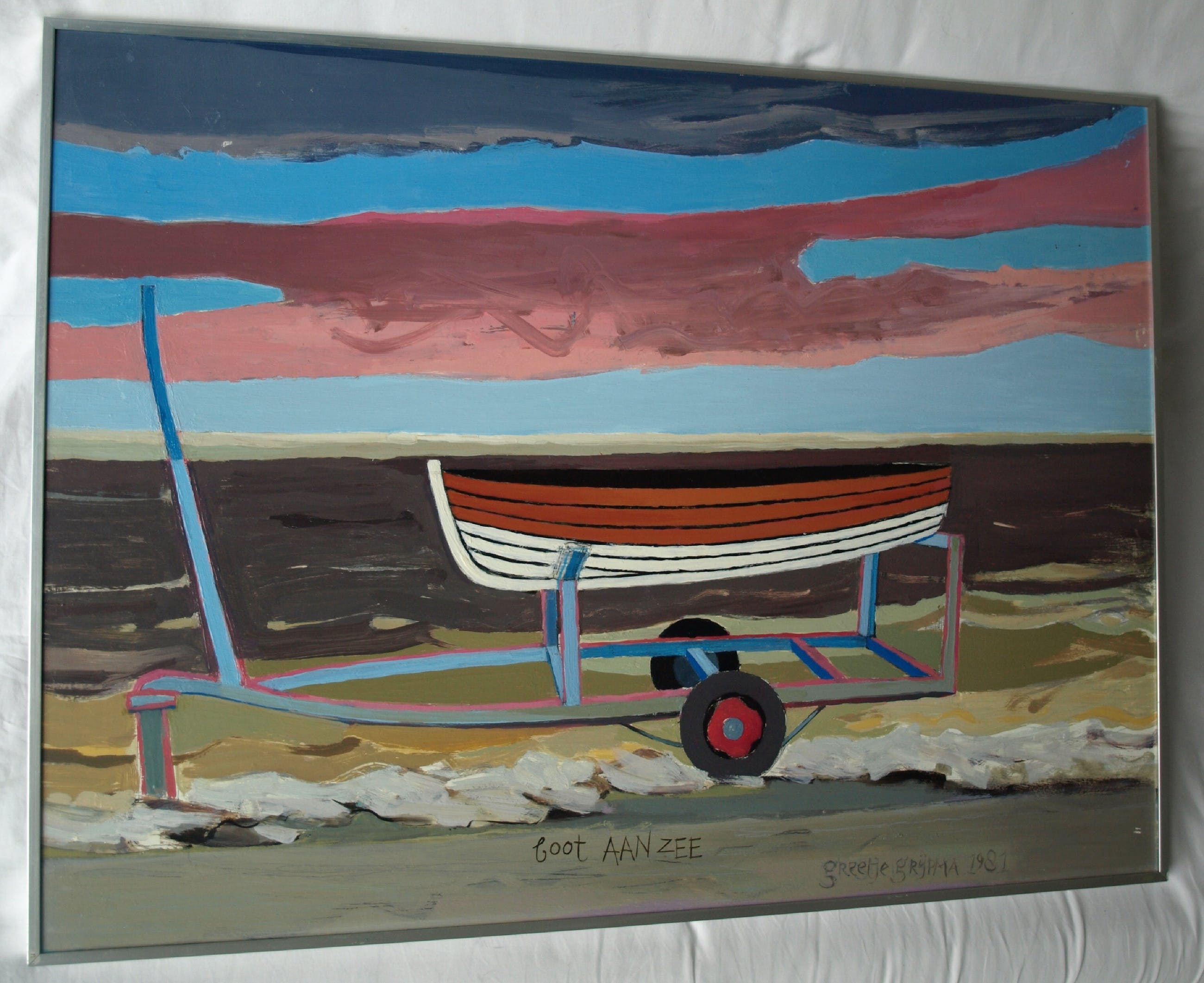 Een schilderij uit 1981 van de Nederlandse kunstenares Greetje Grijpma (1931-2013), getiteld: “boot aan zee”.