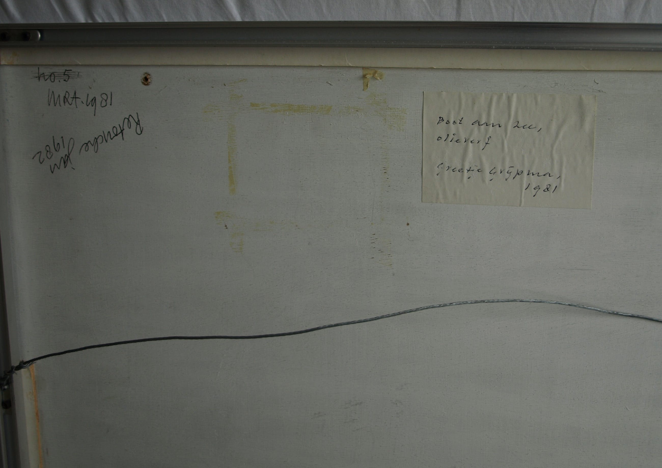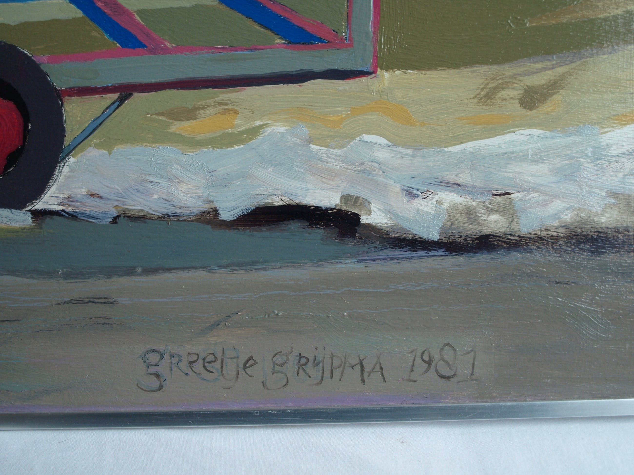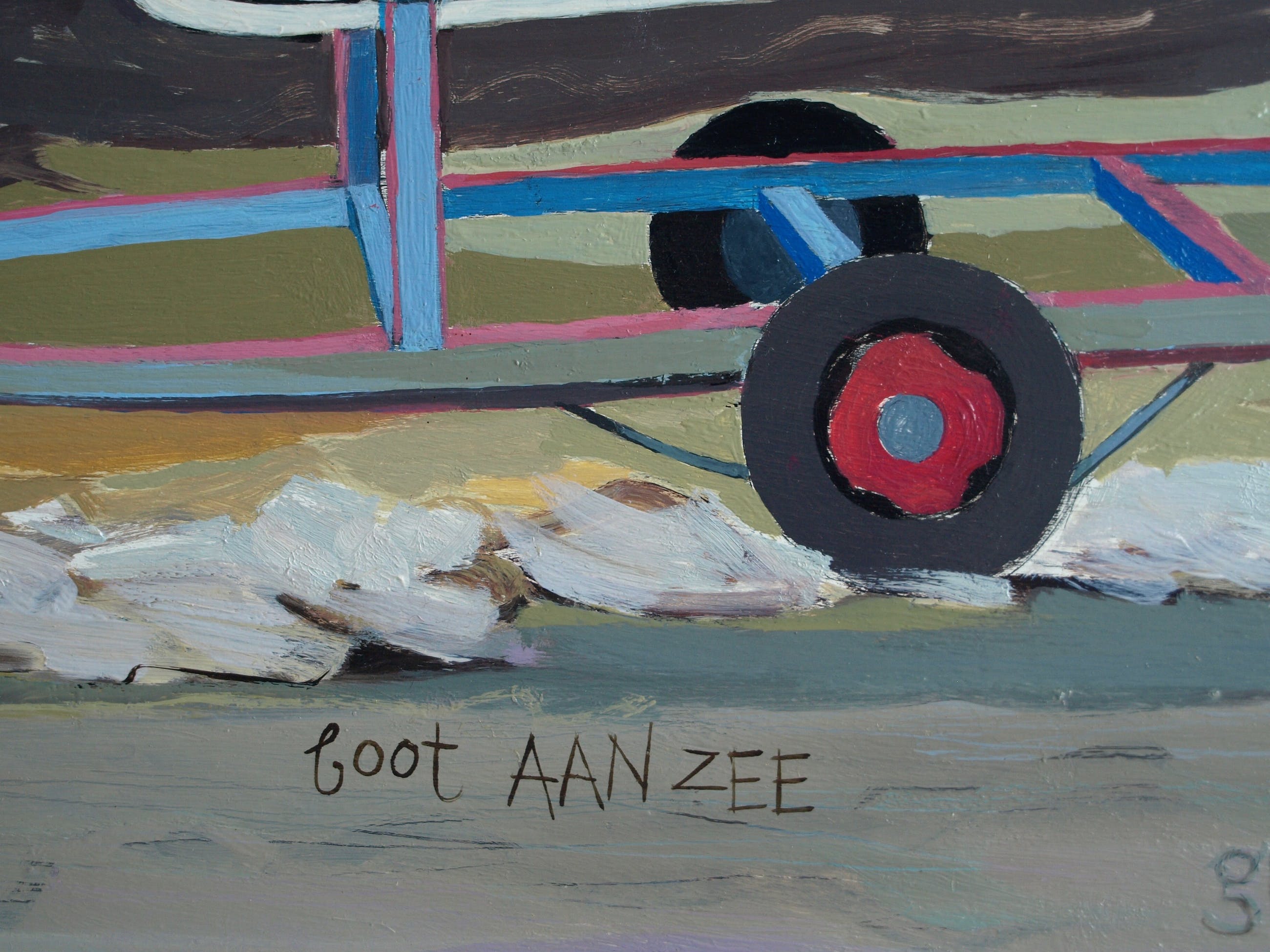Een schilderij uit 1981 van de Nederlandse kunstenares Greetje Grijpma (1931-2013), getiteld: “boot aan zee”.