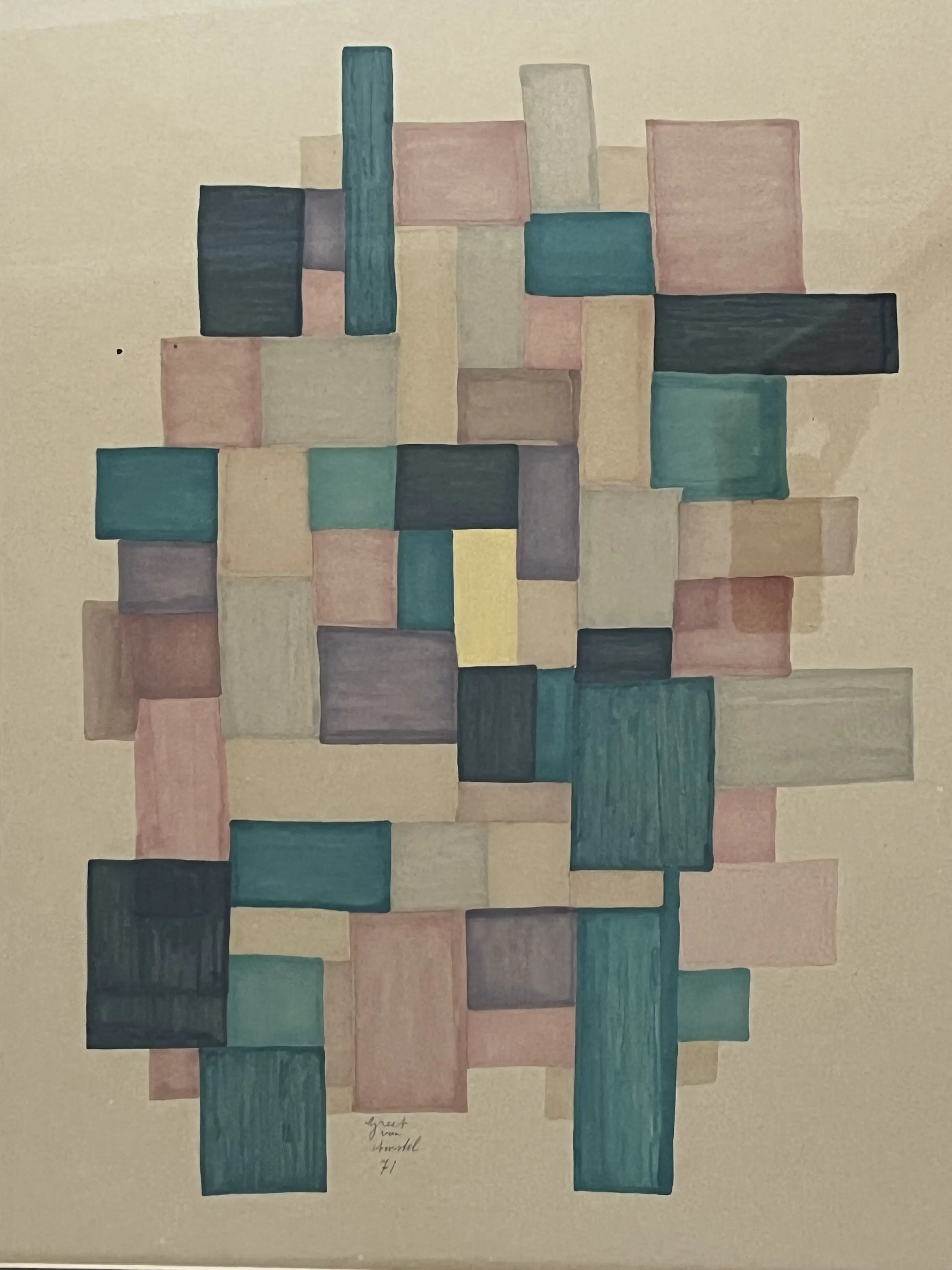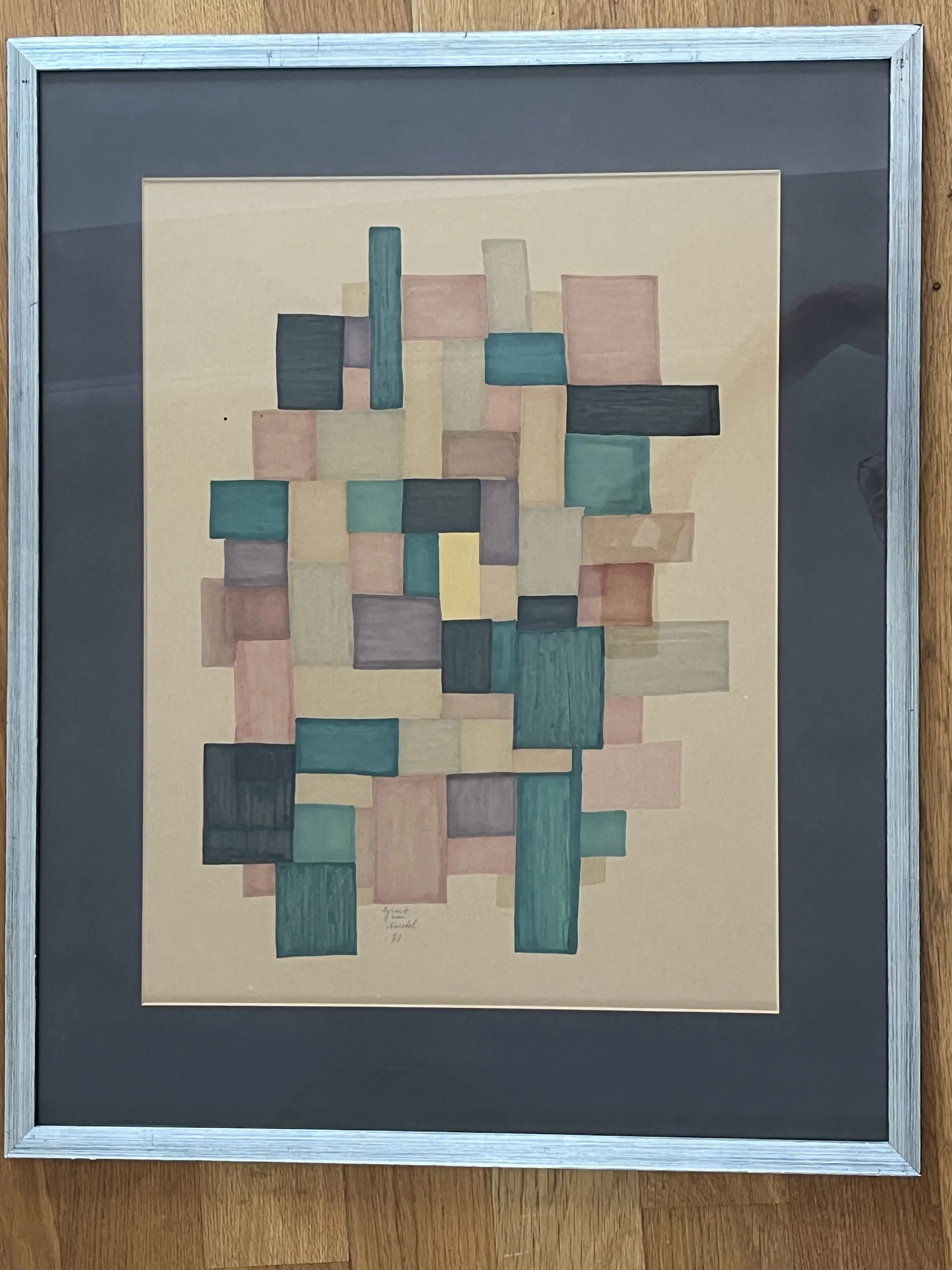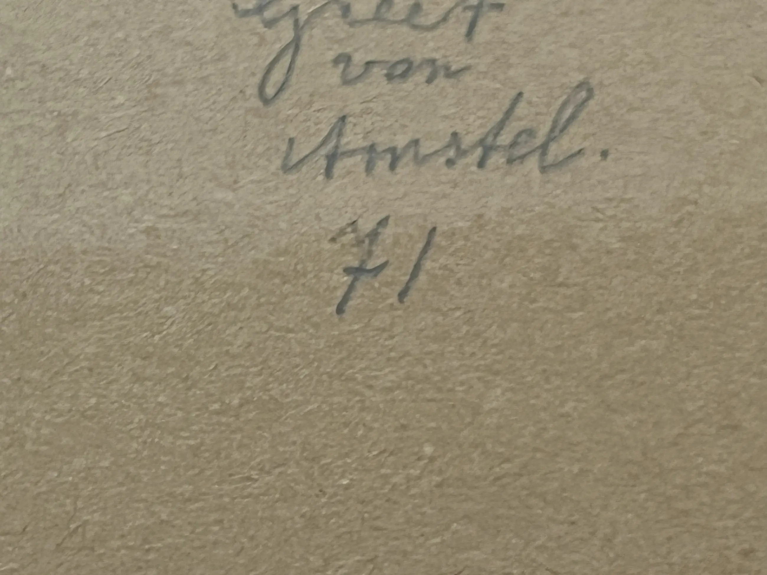 Aquarel uit 1971. Papier is nogal donker en lijkt verkleurd. Papier is DONKERDER als afgebeeld op de foto's.!!!! Werk is gelijst in houten zilverkleurige lijst met zichtbare gebruikssporen. (Detailfoto’s) Afmeting blad 50 x 39 cm. Inclusief lijst 69 x 56 cm.