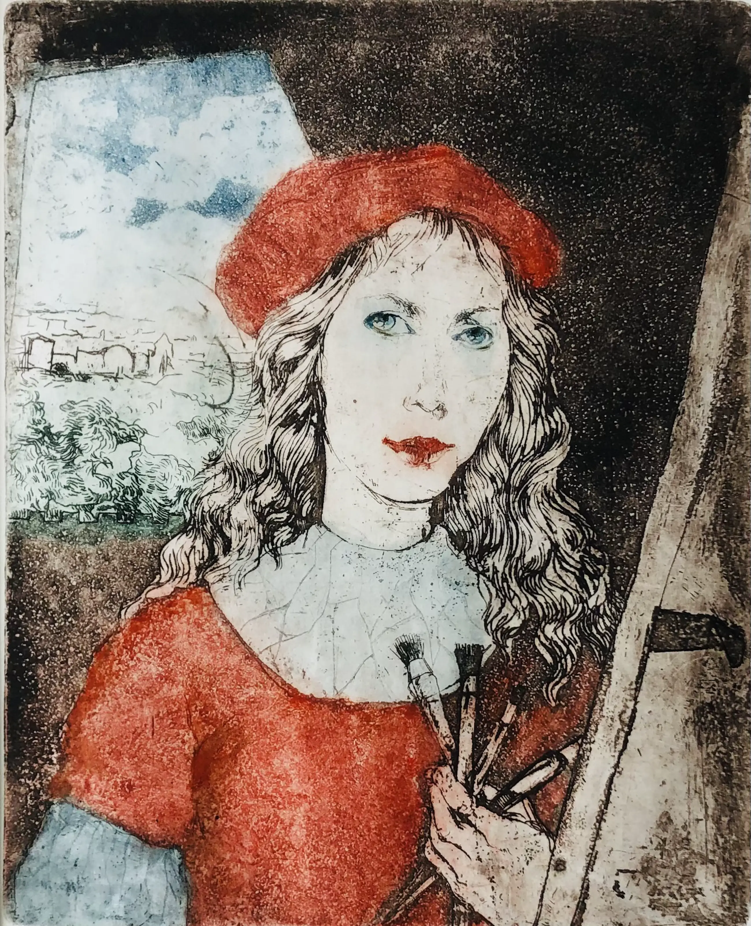 Fraaie ets van Gretty Rubinstein (1947)). Werk in goede staat. Passe partout is erg oud.