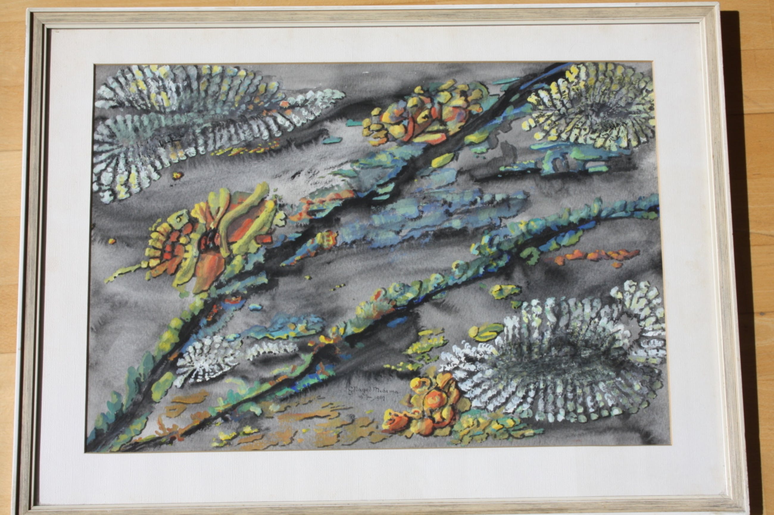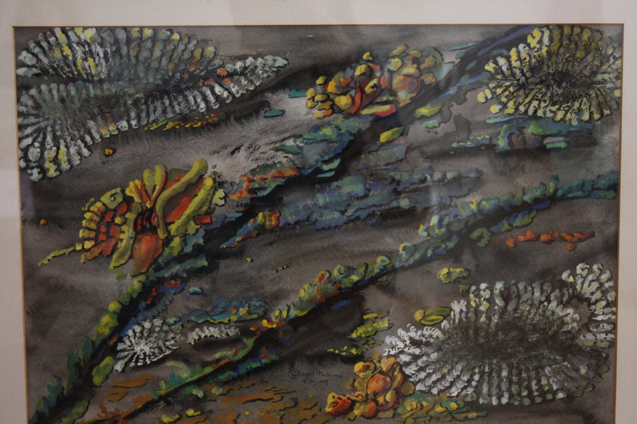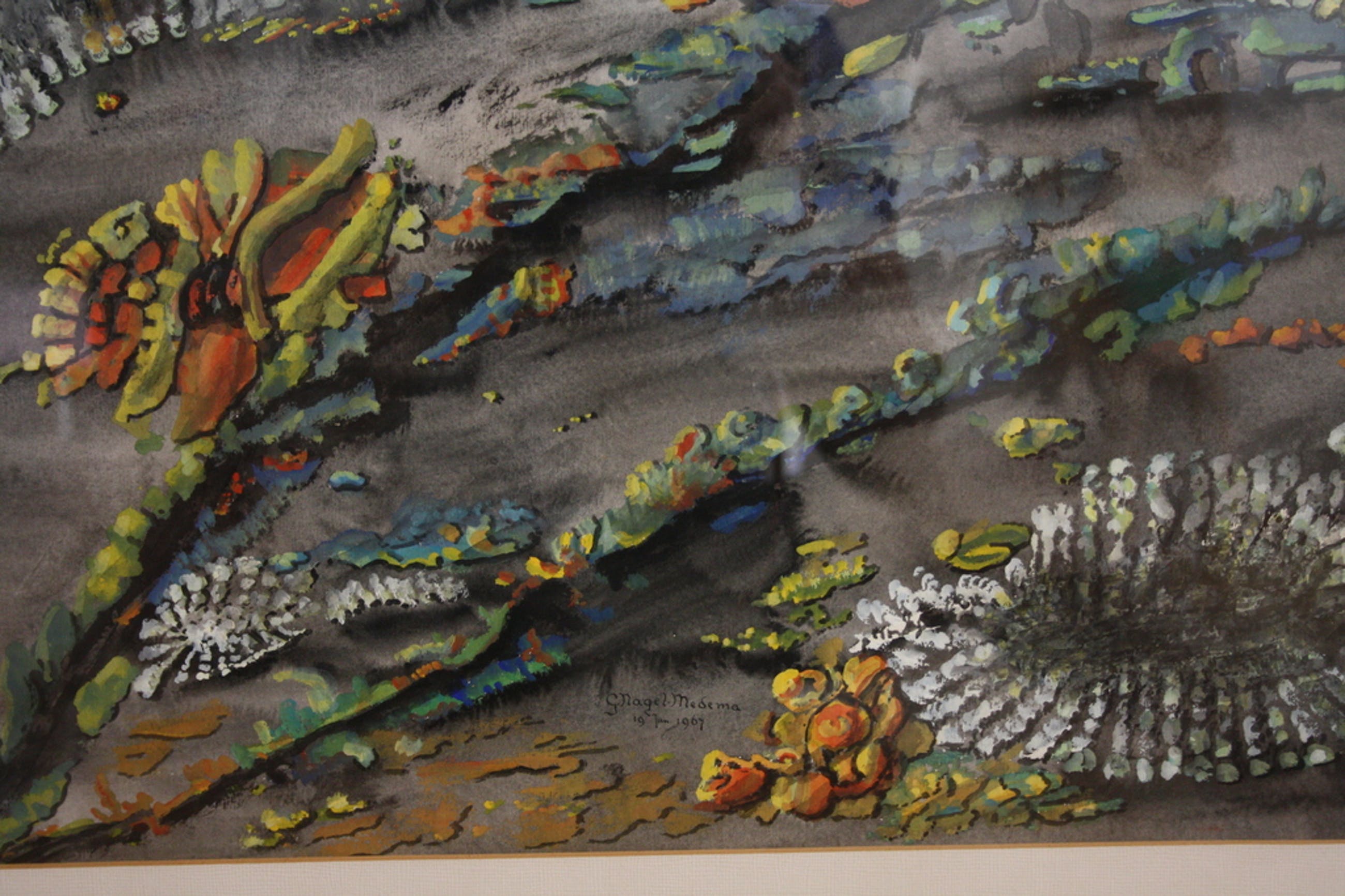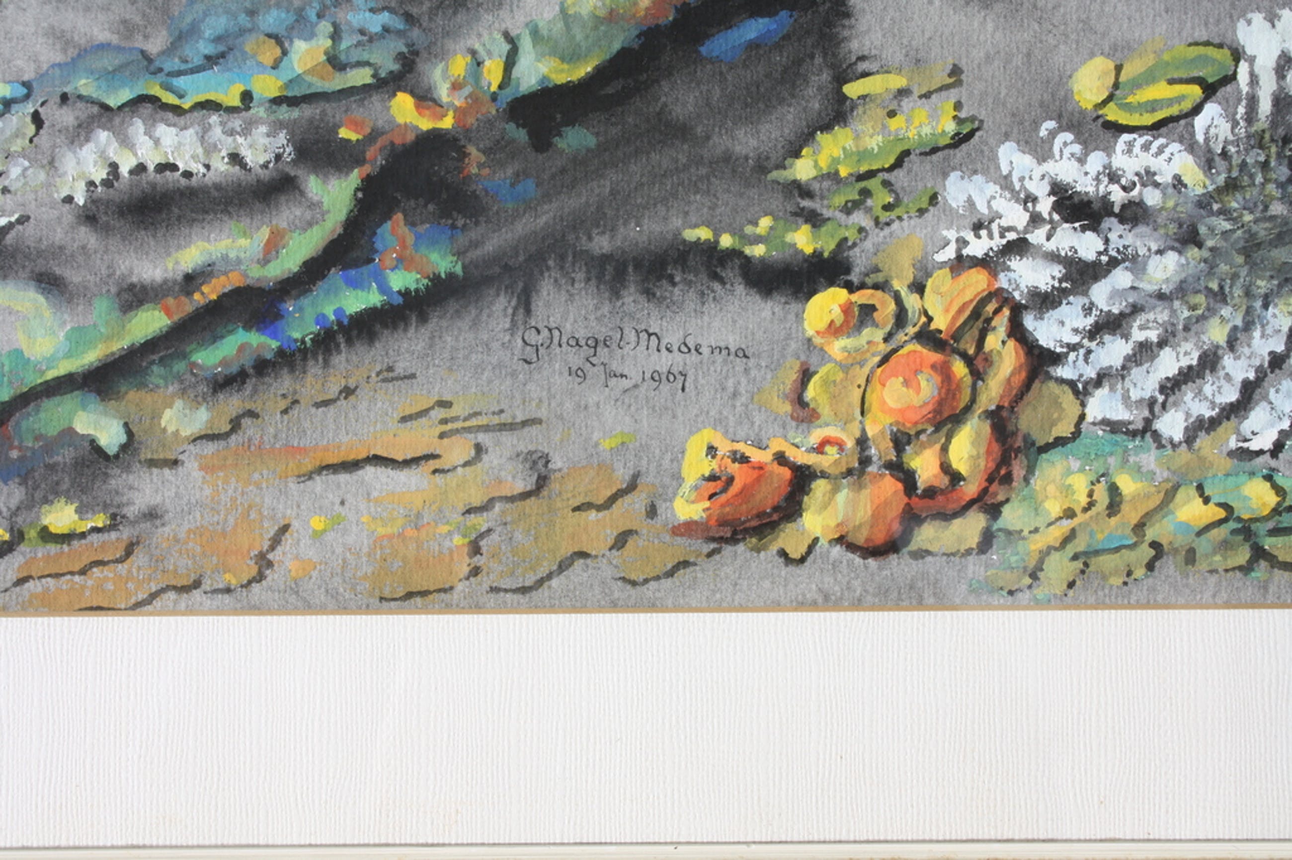 Mooie gouache van Grietje Nagel-Medema. Grietje Medema werd in 1899 geboren te Bierum(Delfzijl) en overleed in 1994 te Groningen.Zij volgde op latere leeftijd een opleiding aan de Academie Minerva te Groningen 1962-1964, en was leerling van Evert Musch,Piet Rijn, en Max v.d.Wissel.