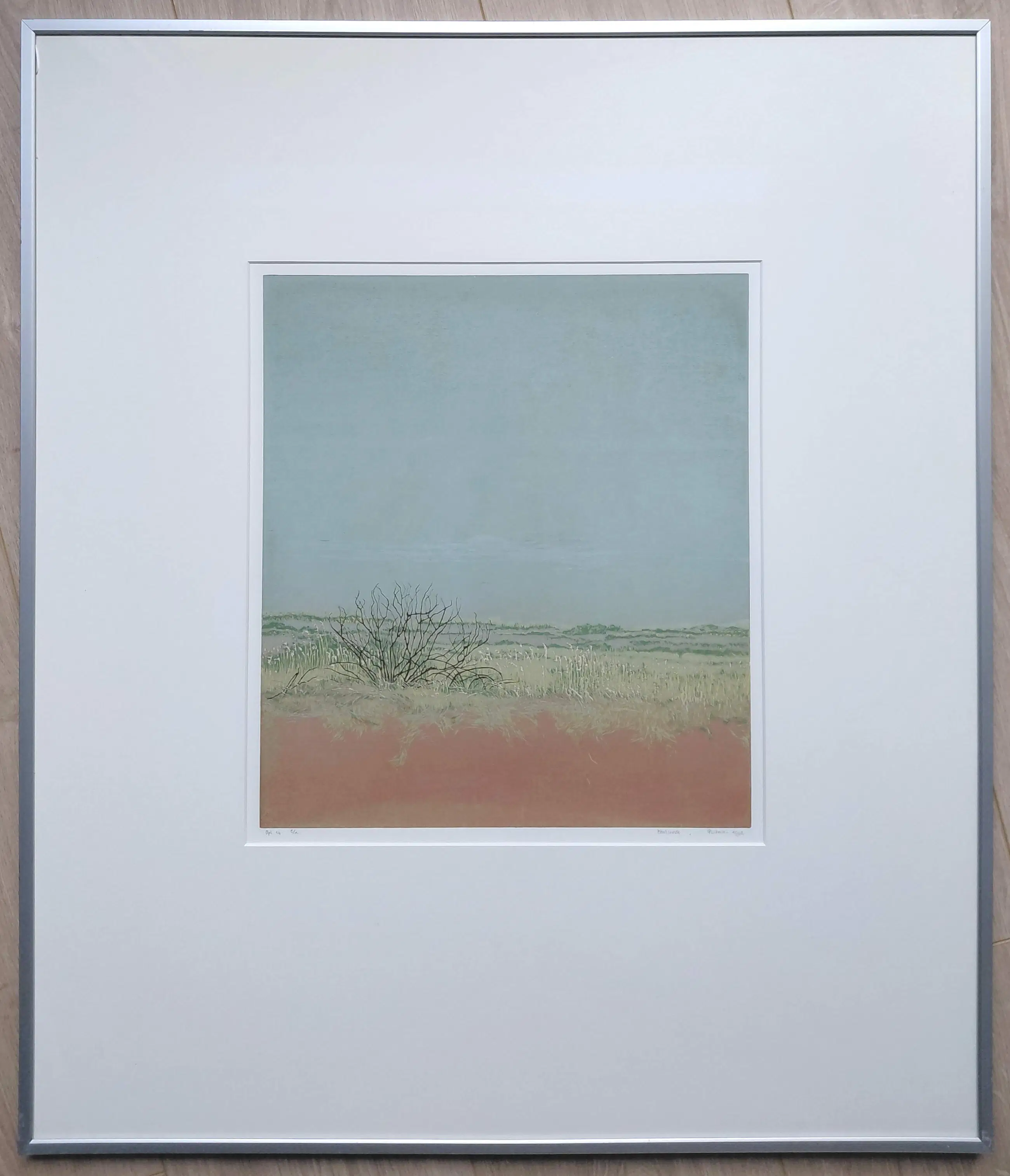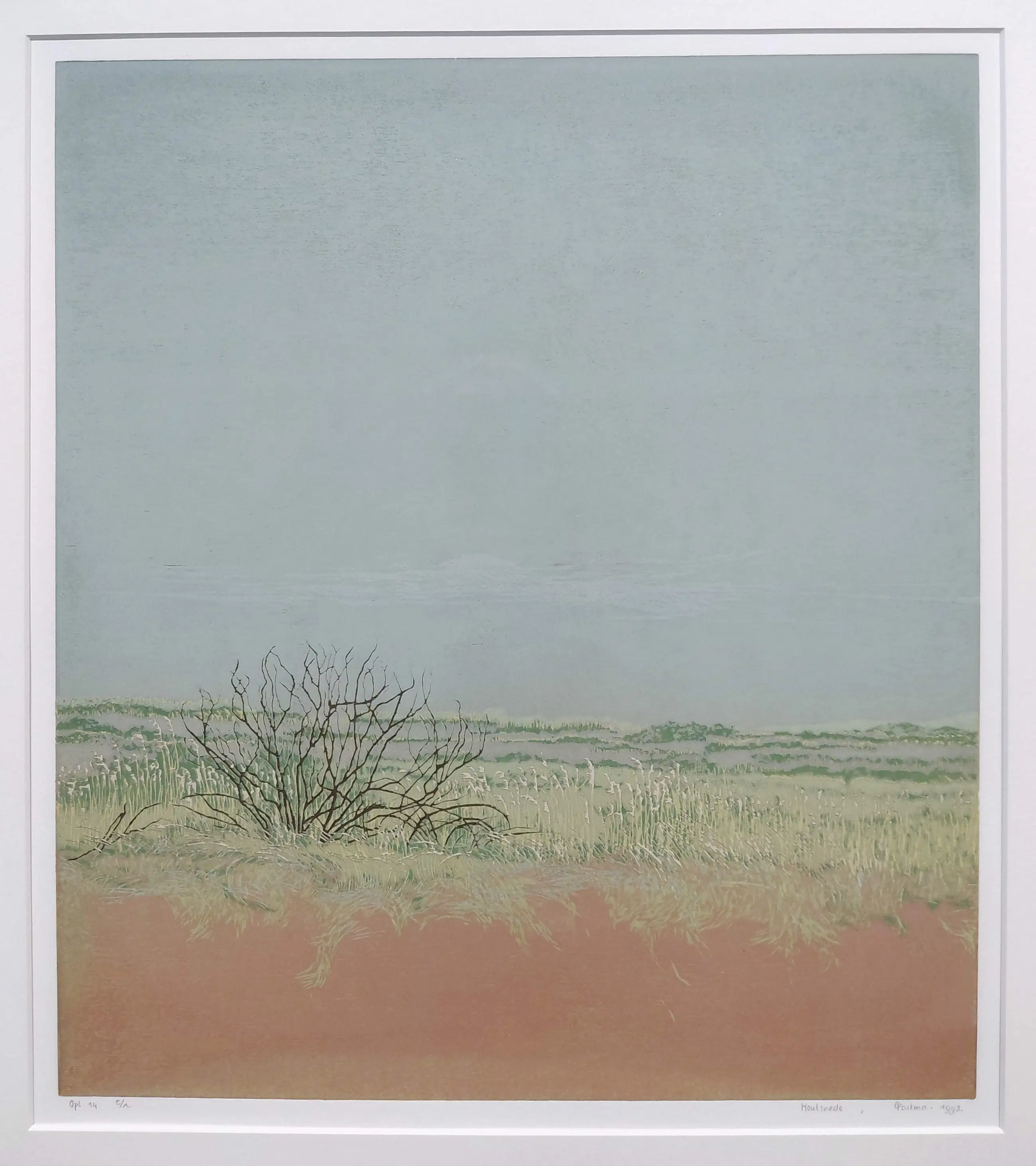 Mooi, ingetogen duinlandschap van Grietje Postma. Kleurenhoutsnede op papier, met potlood gesigneerd, gedateerd (1993), een Epreuve d’Artiste exemplaar naast de oplage van 14. In strakke aluminium lijst, achter glas en met smetteloos, zuurvrij passe-partout. In zeer goede conditie.