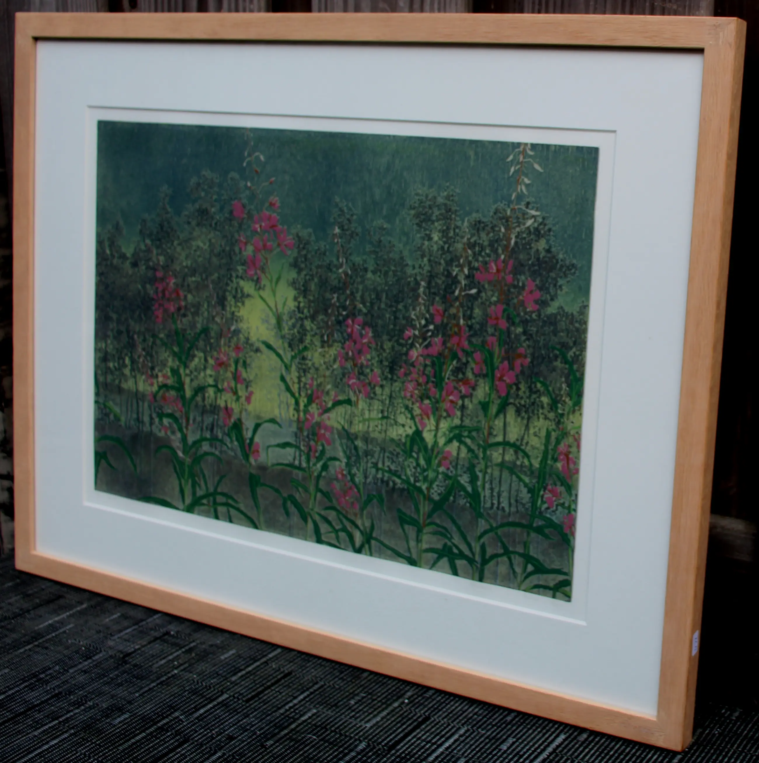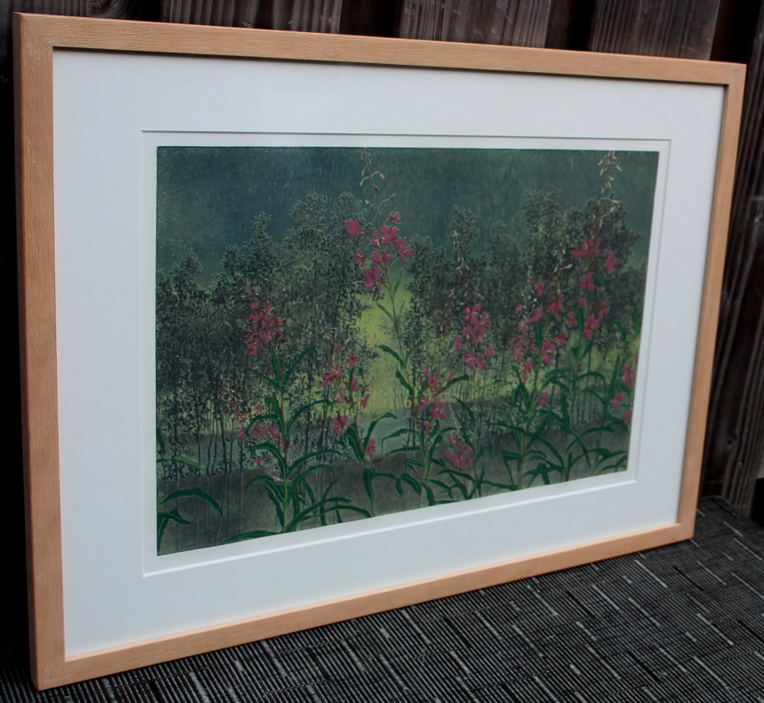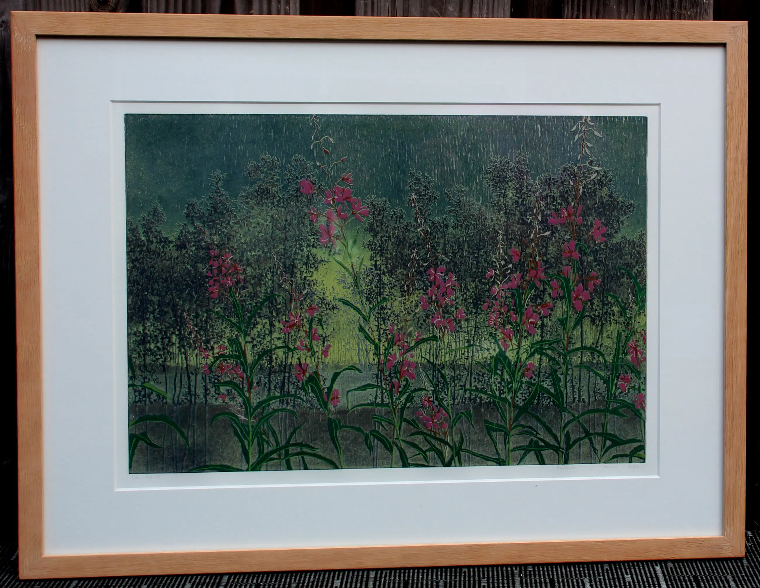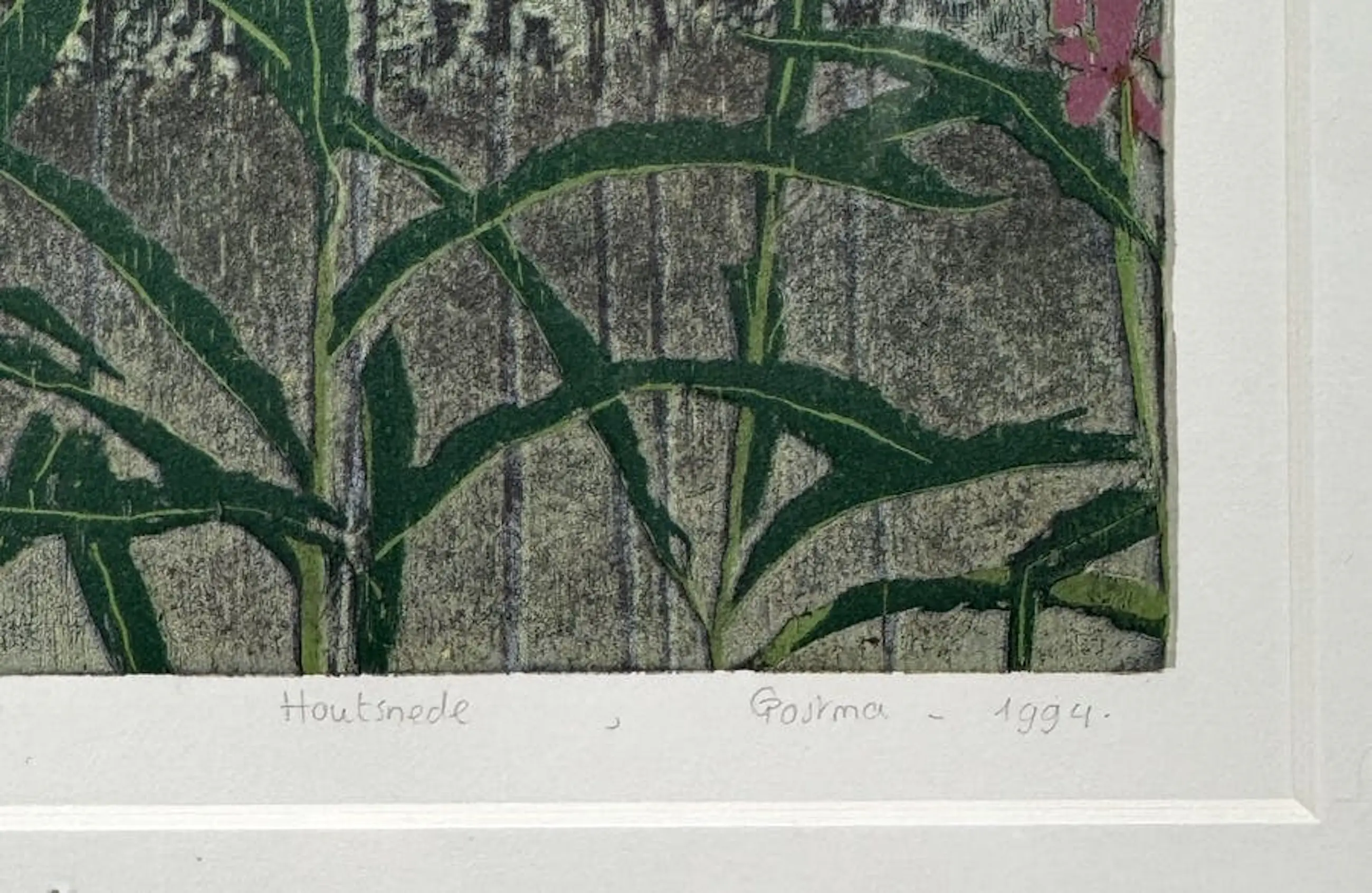 Ingelijste houtsnede van Grietje Postma. Het werk toont een gestileerd veld met bloeiende planten in felroze en groen, uitgevoerd in poëtisch realistische stijl. Jaar: 1994. Nummer: E.A, oplage 18. Afmetingen incl lijst: H48 x b63cm. Afmetingen voorstelling: H31 x b44cm. Het werk is linksonder, in potlood, gesigneerd door de kunstenares. De authenticiteit van het, aangeboden, werk wordt volledig gegarandeerd. Een certificaat van echtheid kan, op aanvraag, worden gemaild.