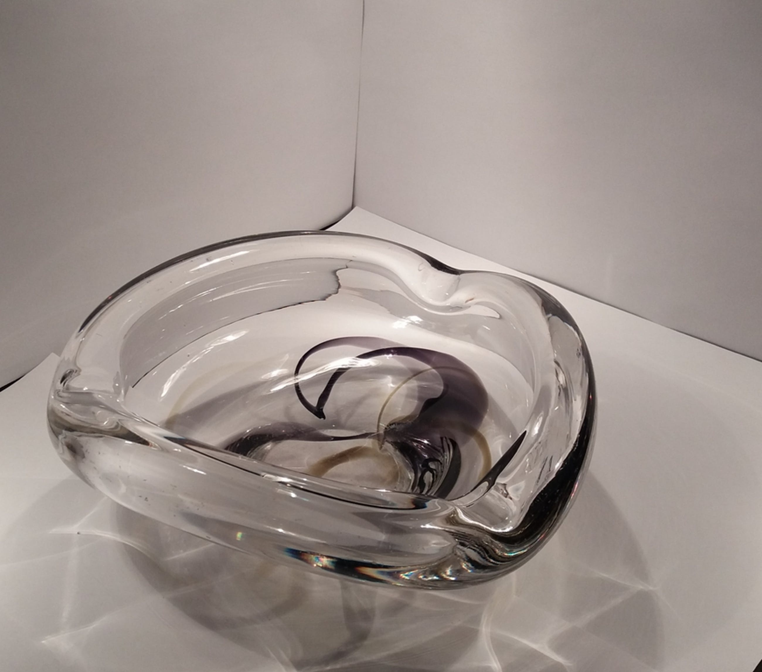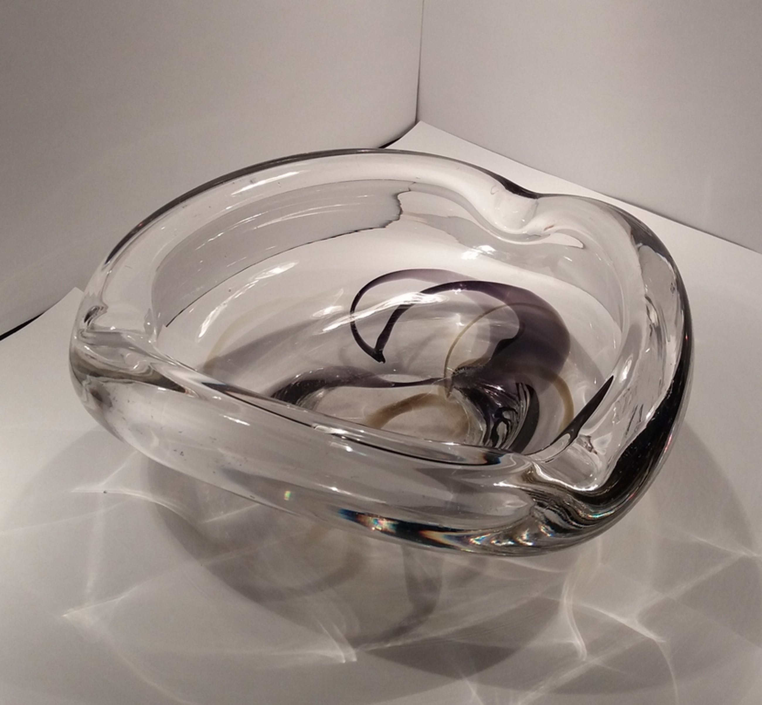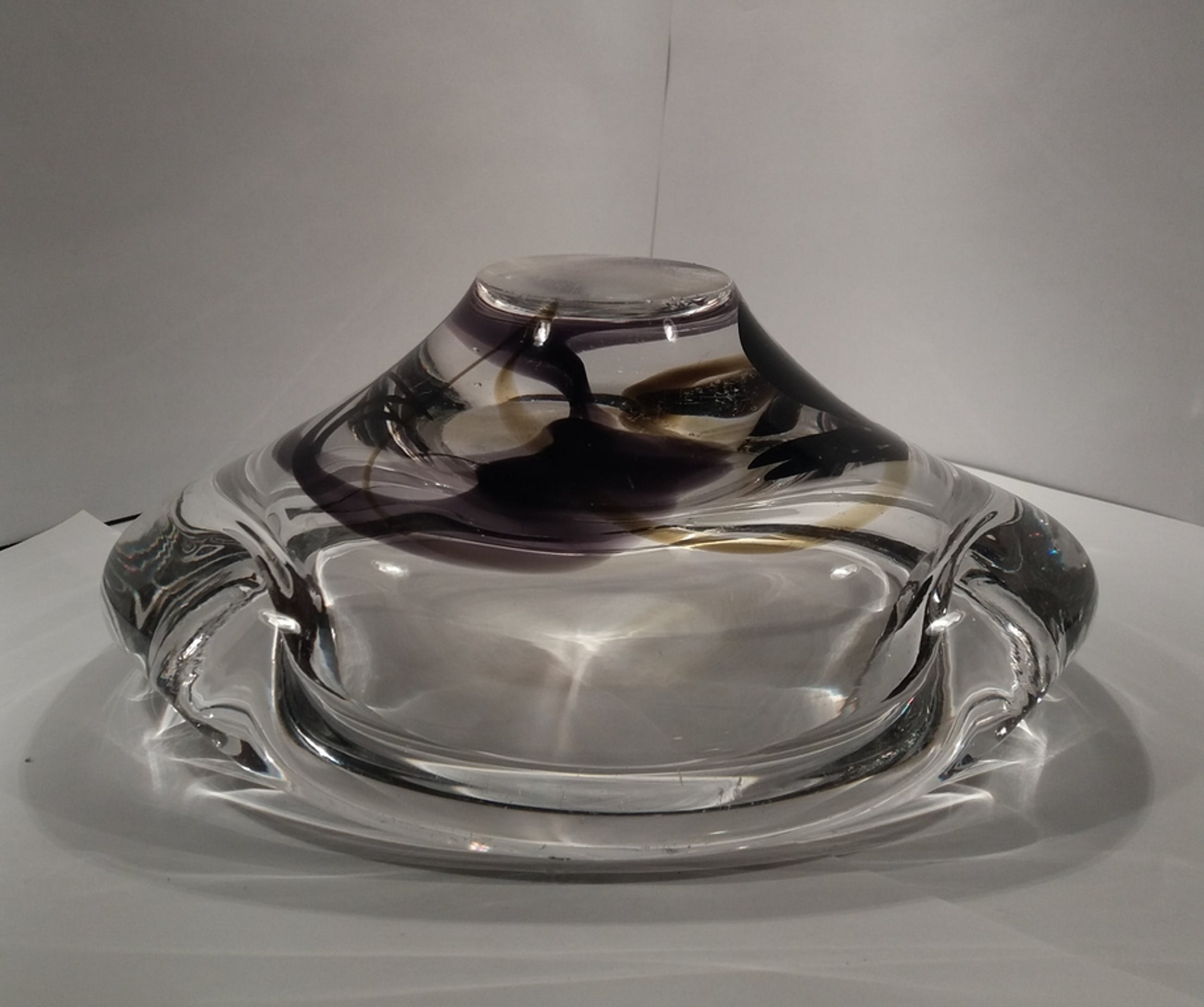 Max Verboeket schaal glas met paarse grijs - zwart - bruin goudkleur slingers. Kristalunie Maastricht. Goede conditie,gaaf met lichte gebruikskrasjes. en onderkant klein stukje er aa je ziet het niet . Max Verboeket Holand . Vintage glazen schaal.