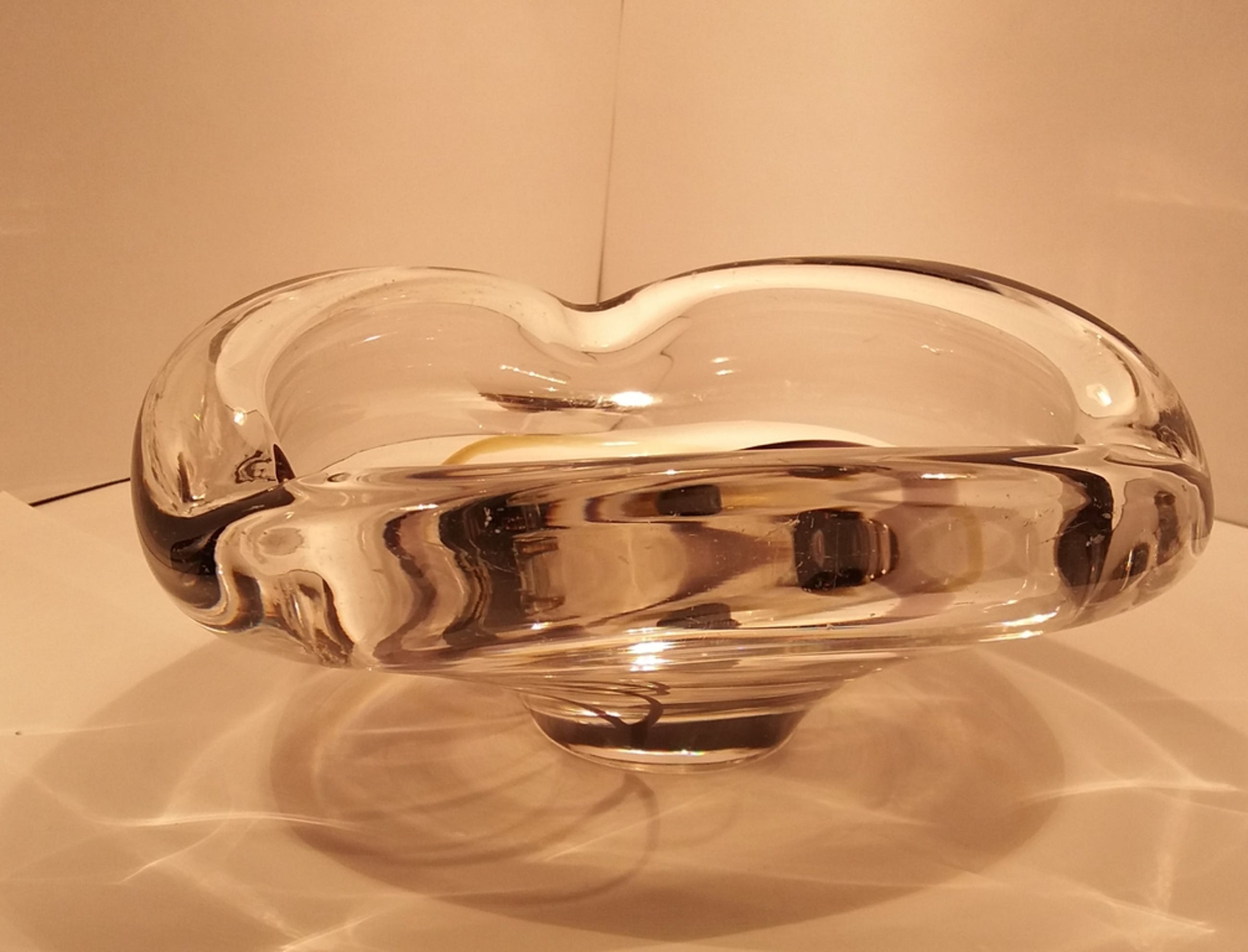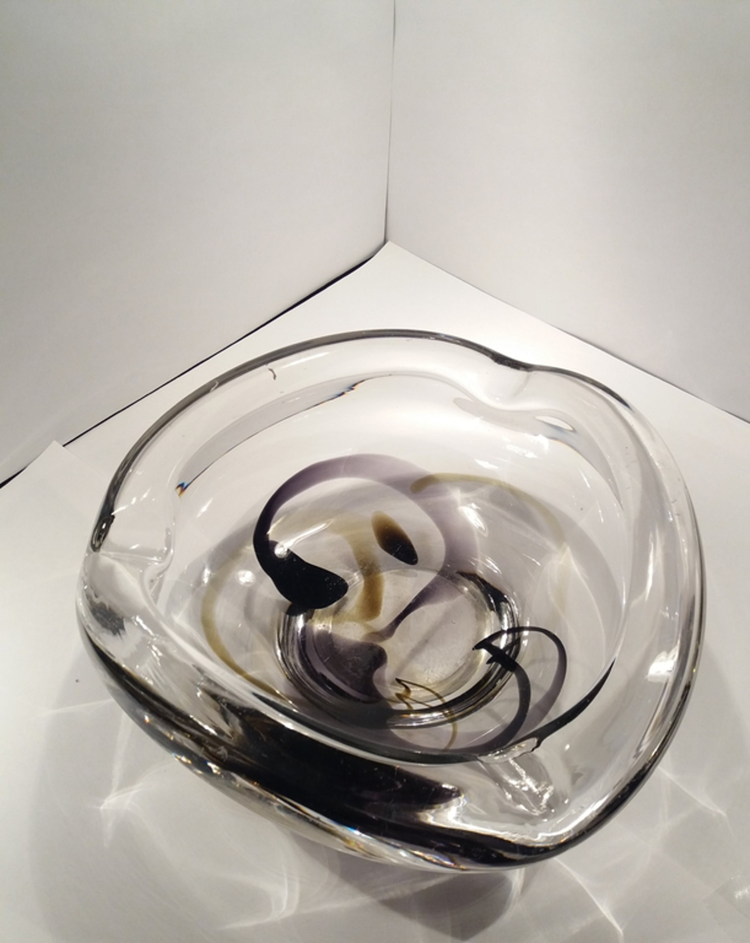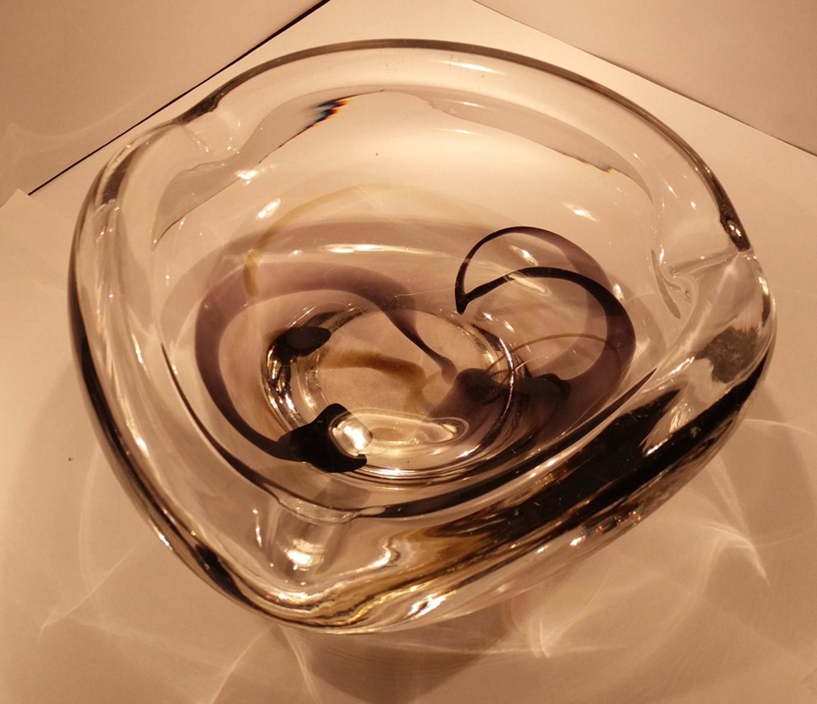 Max Verboeket schaal glas met paarse grijs - zwart - bruin goudkleur slingers. Kristalunie Maastricht. Goede conditie,gaaf met lichte gebruikskrasjes. en onderkant klein stukje er aa je ziet het niet . Max Verboeket Holand . Vintage glazen schaal.
