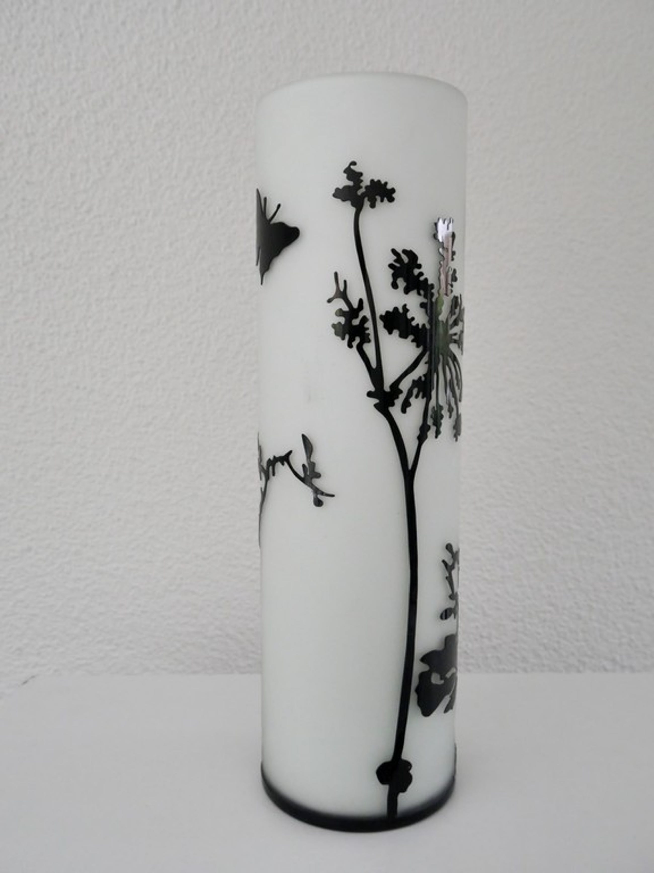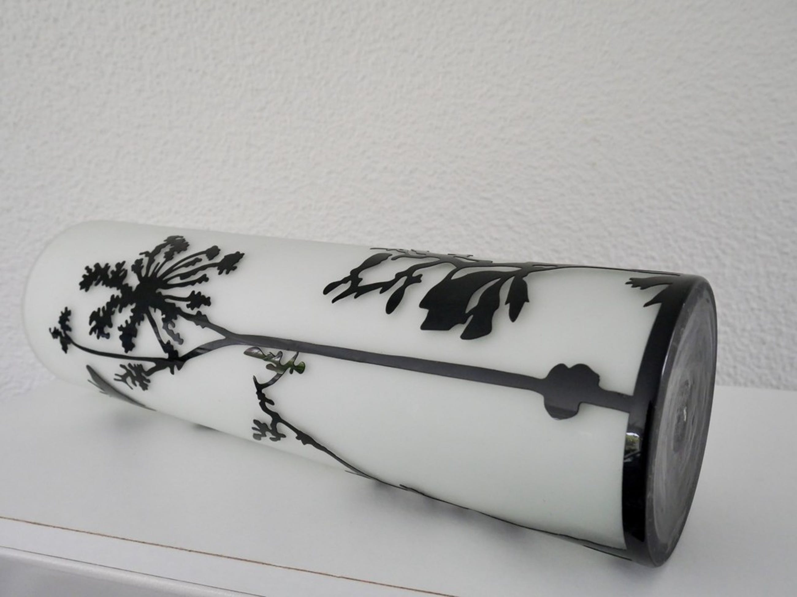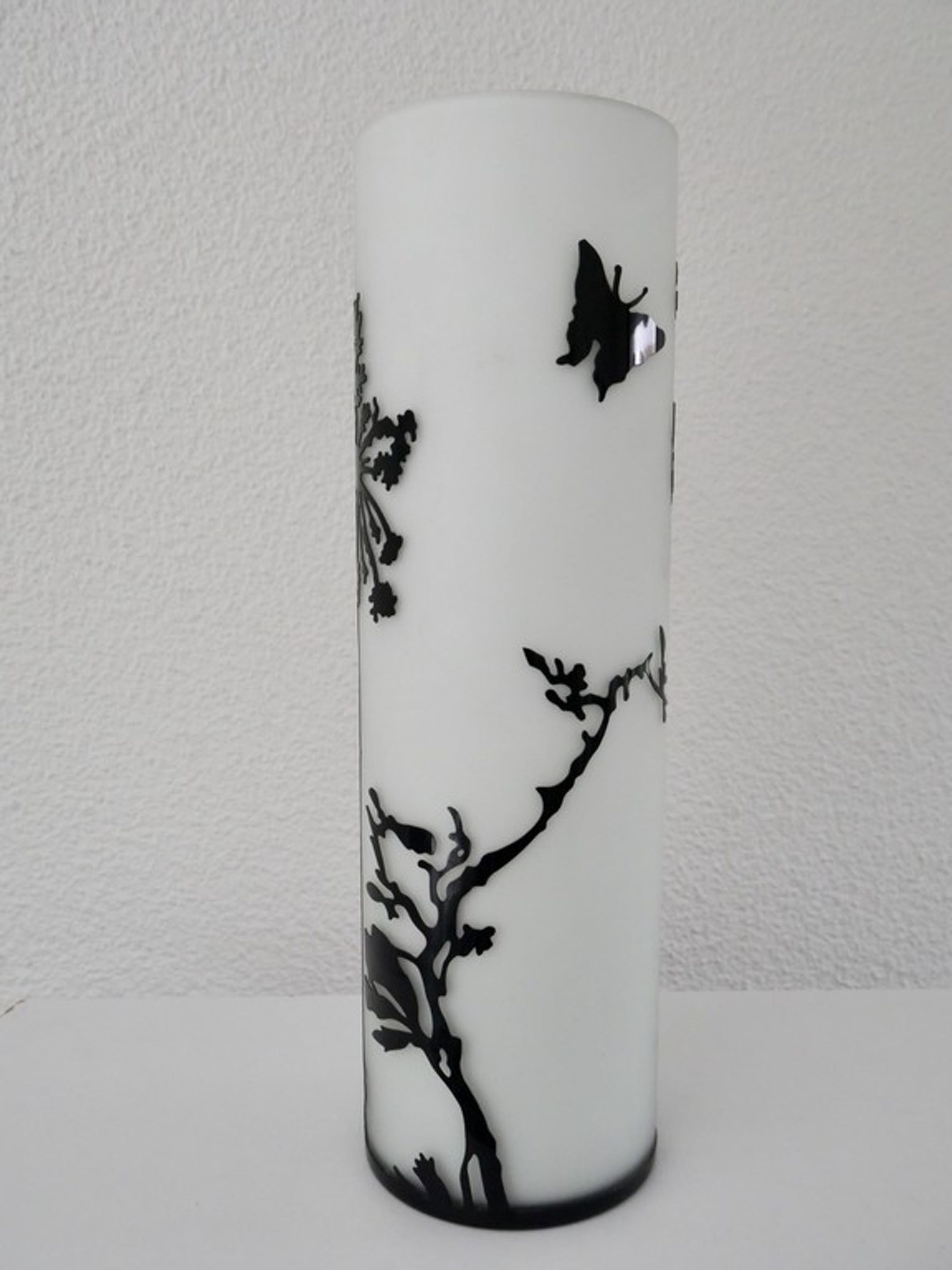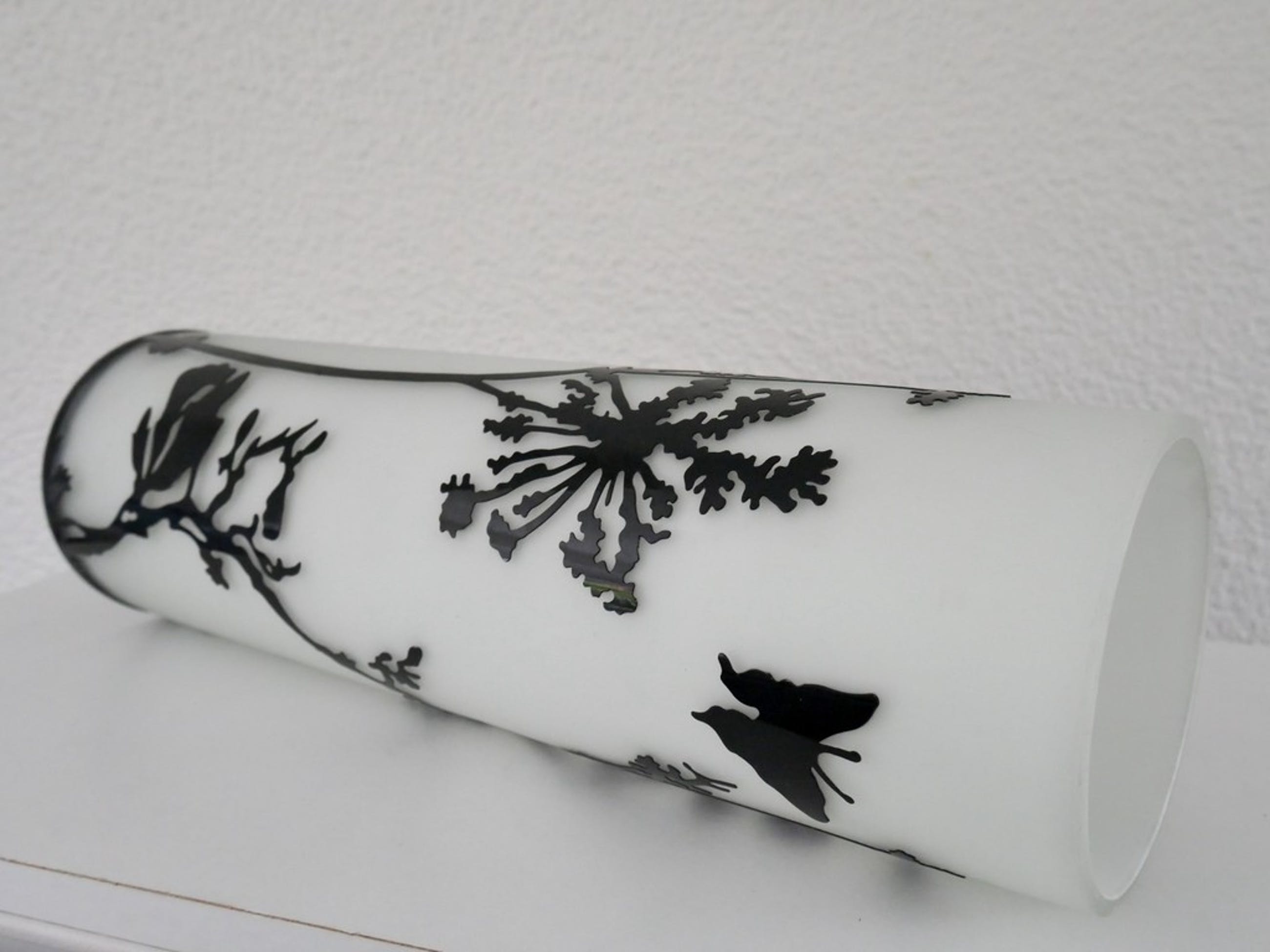 Grote Zwart witte in Cameo techniek uitgevoerde vaas met plant en vlinder decoratie