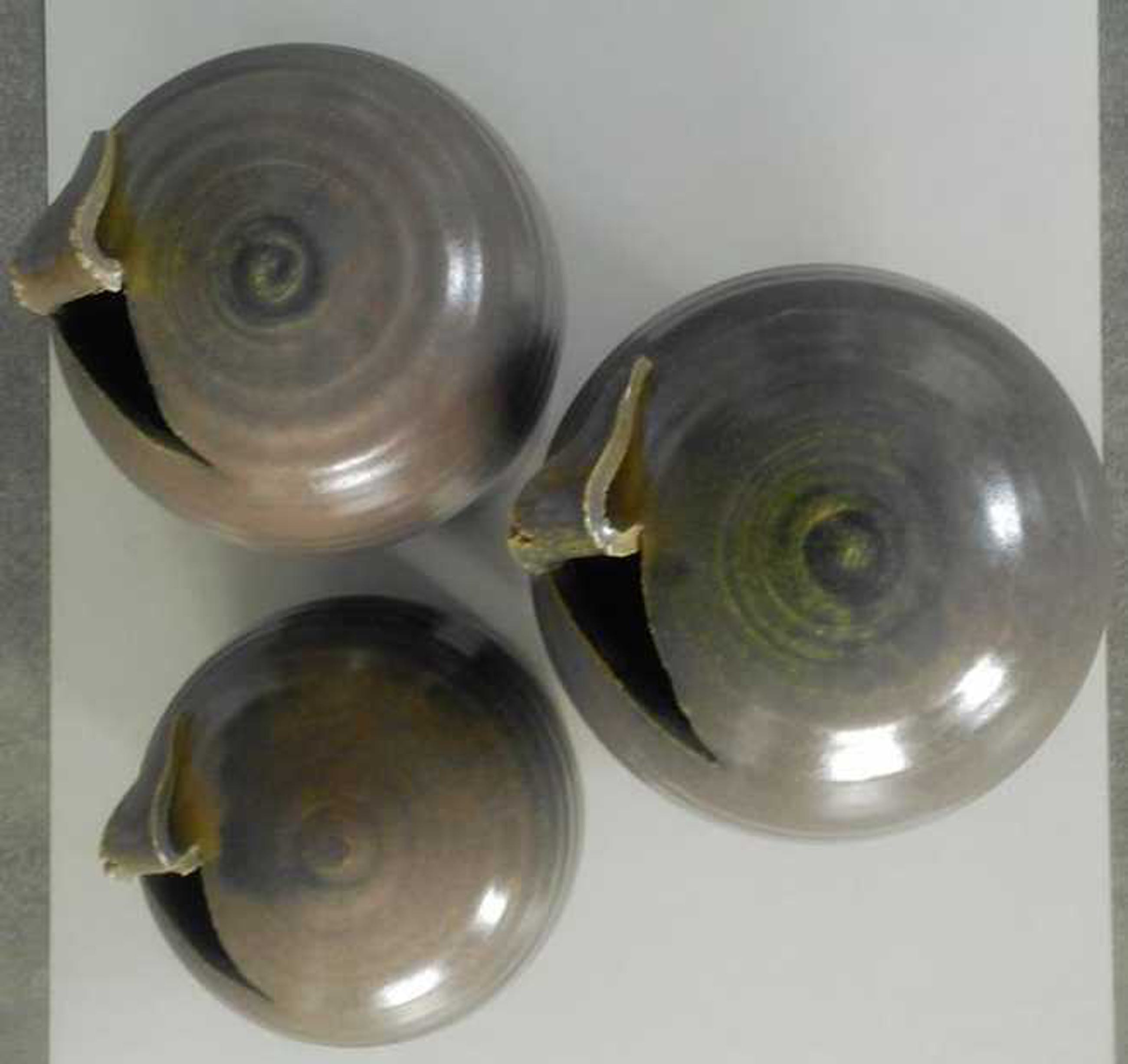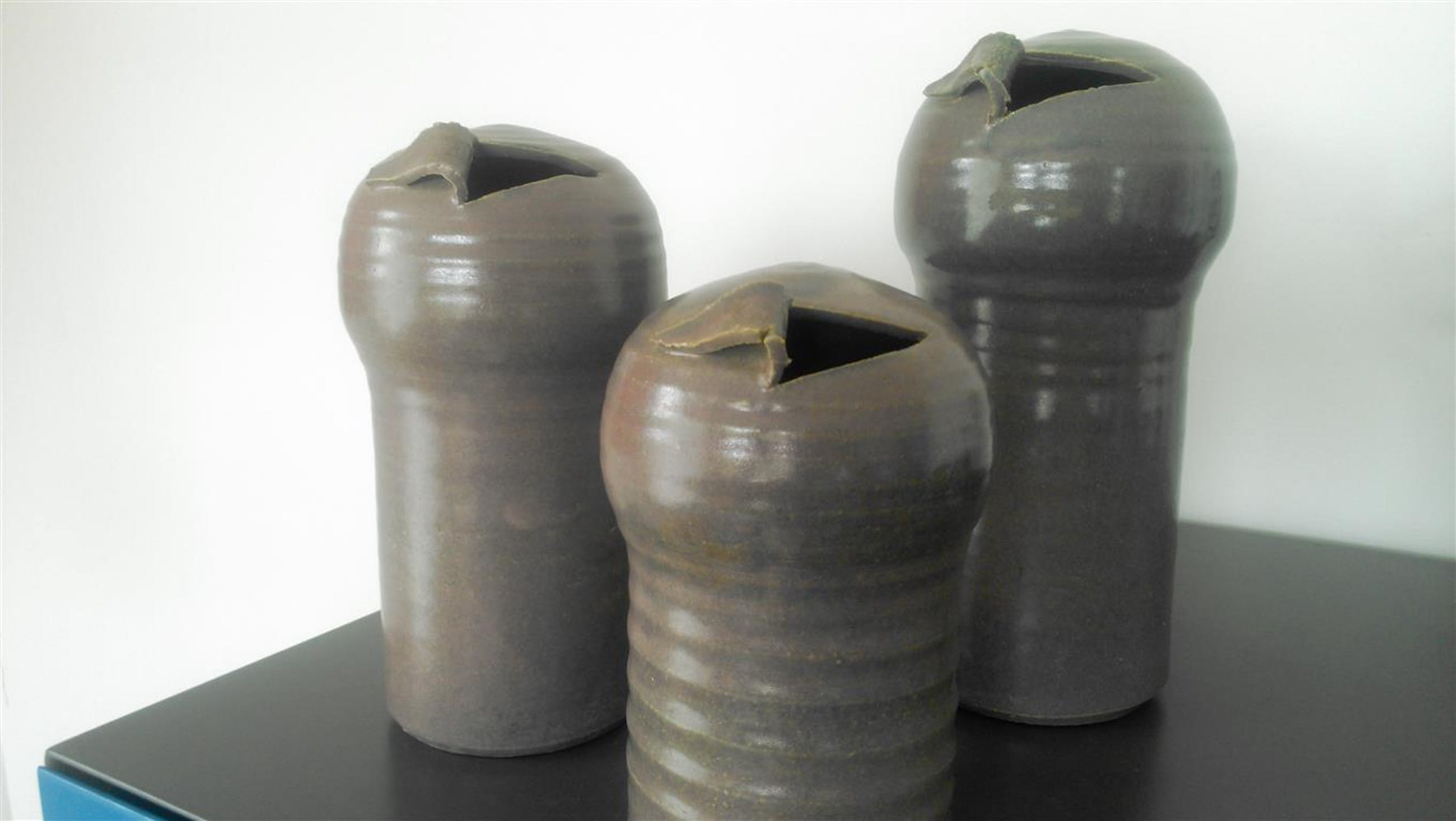 Drie gelijkvormige geglazuurde keramische objecten van verschillende hoogte met opening aan bovenzijde Hoogste is 23 cm hoog doorsnede 12 cm