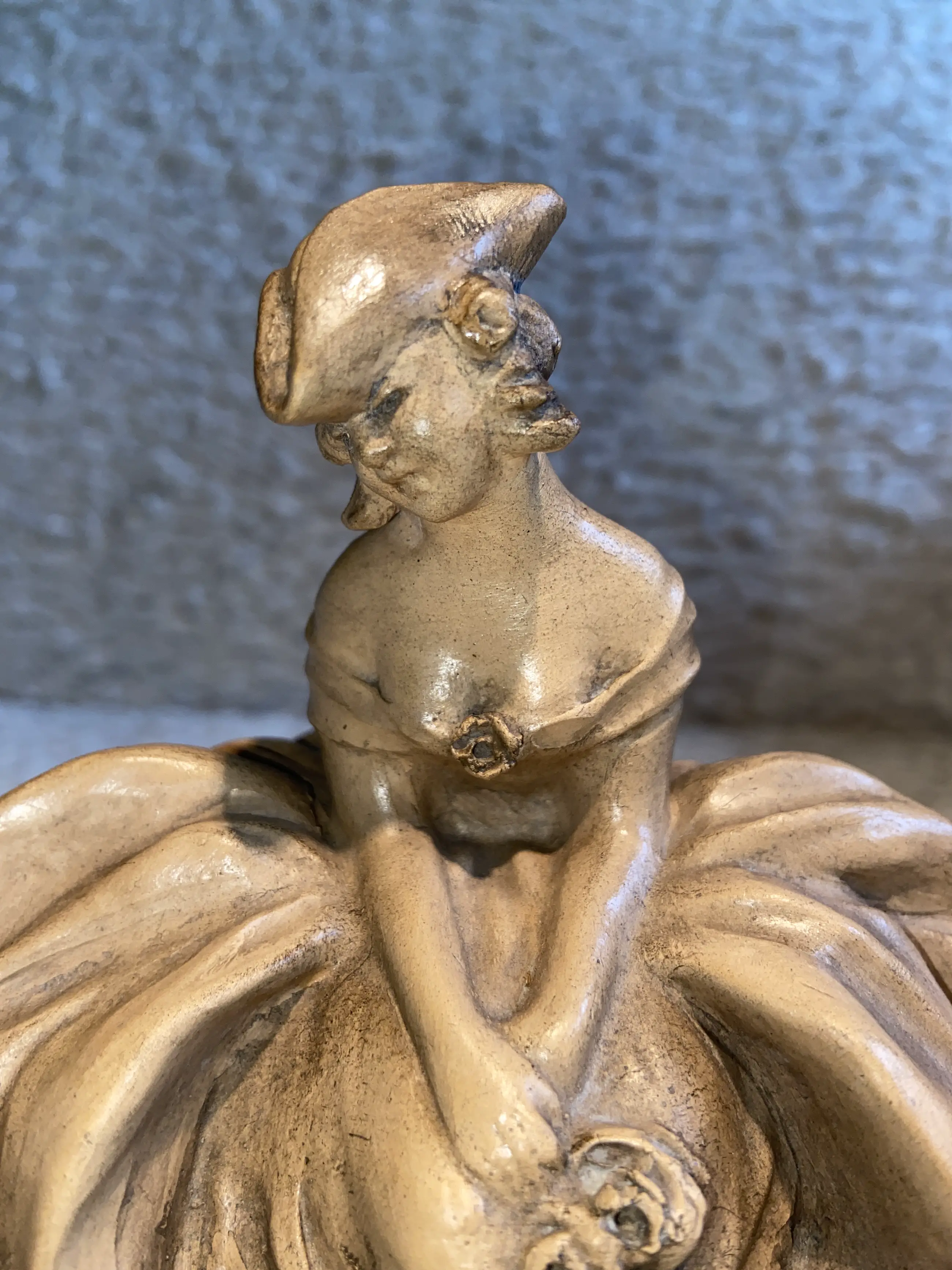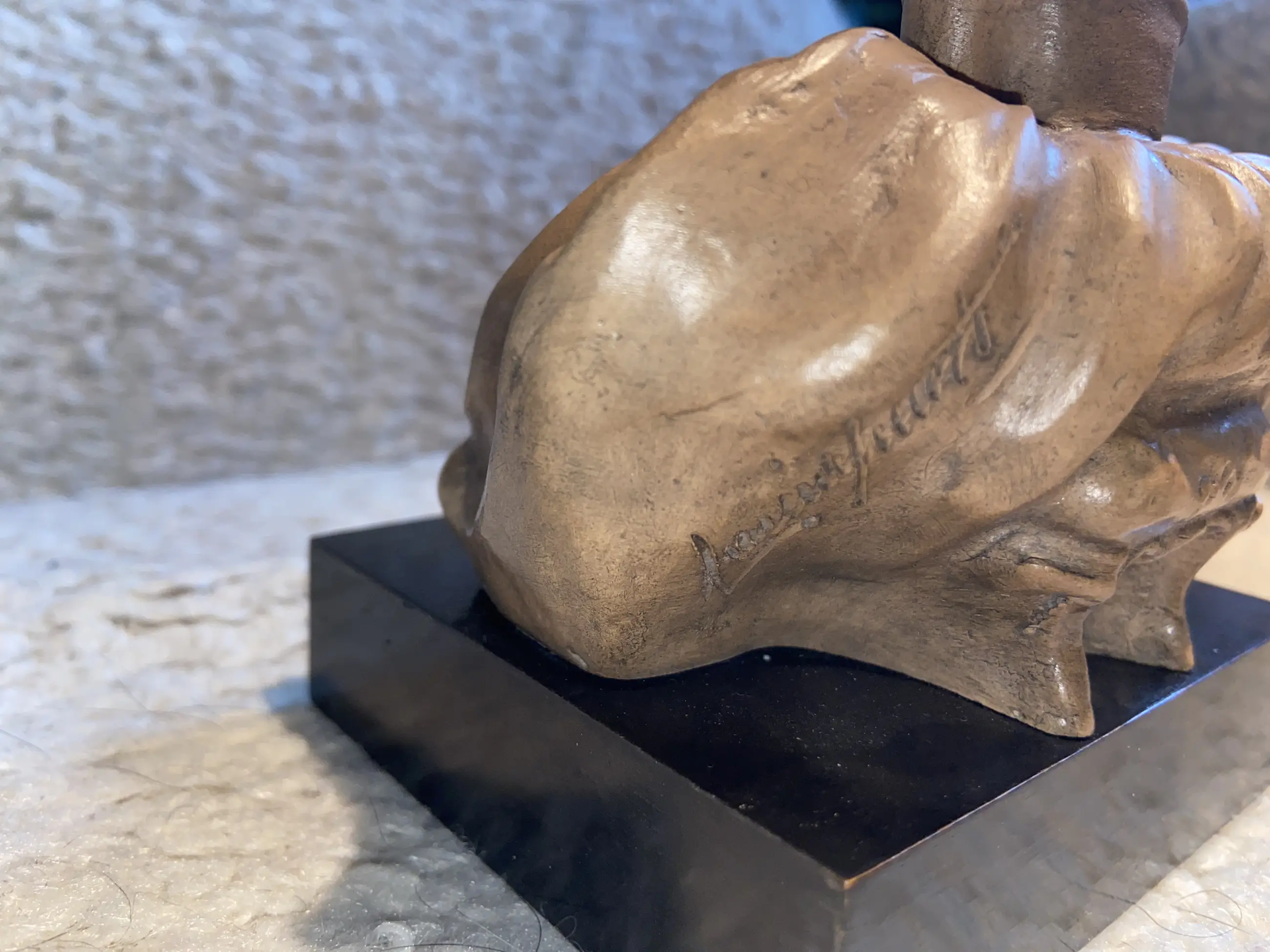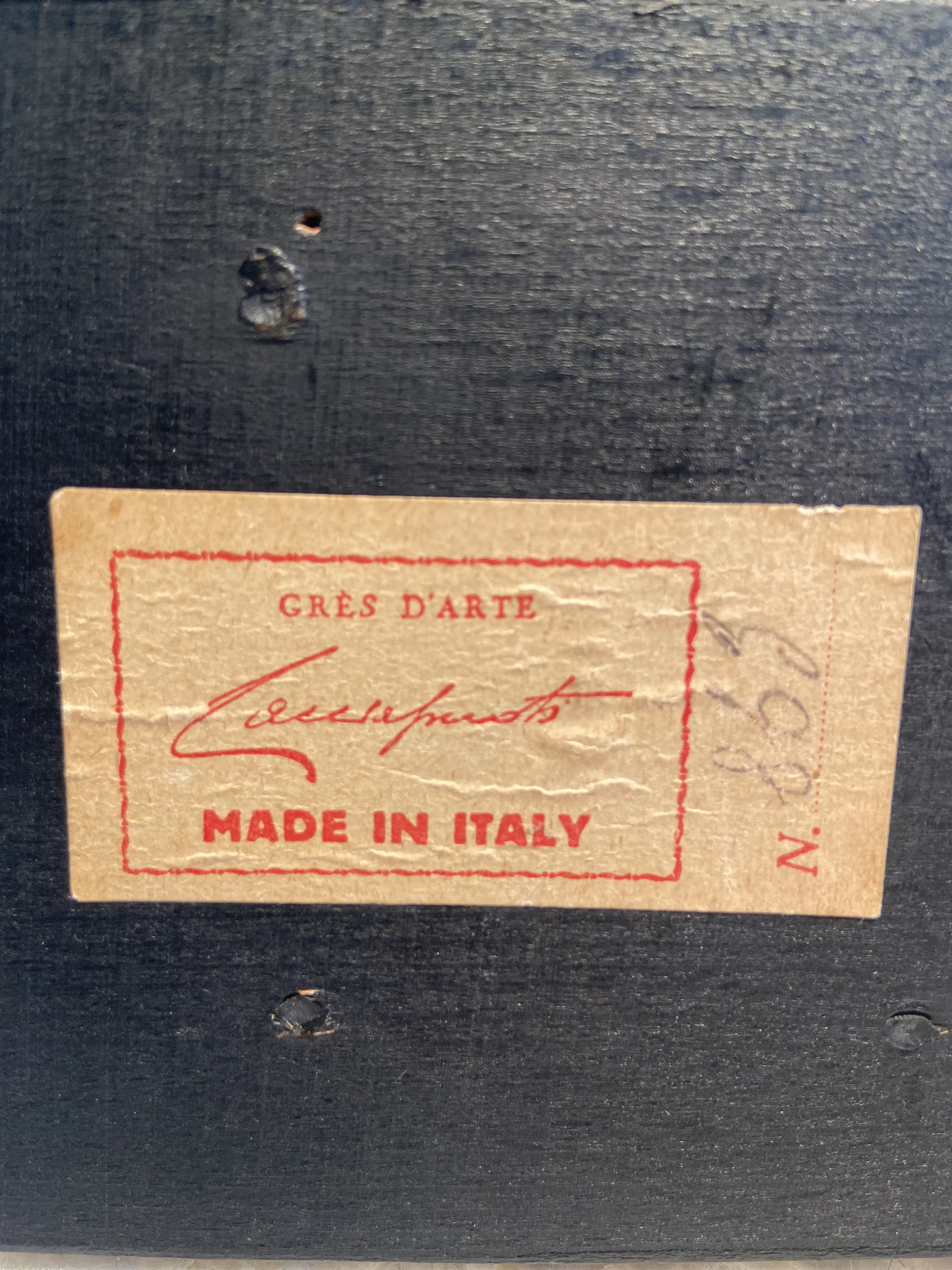Gesigneerd beeldje gres d’arte Made in Italy. Origine & jaar onbekend (erfenis) Op houten basis met etiket onderaan Geen enkele zichtbare schade
