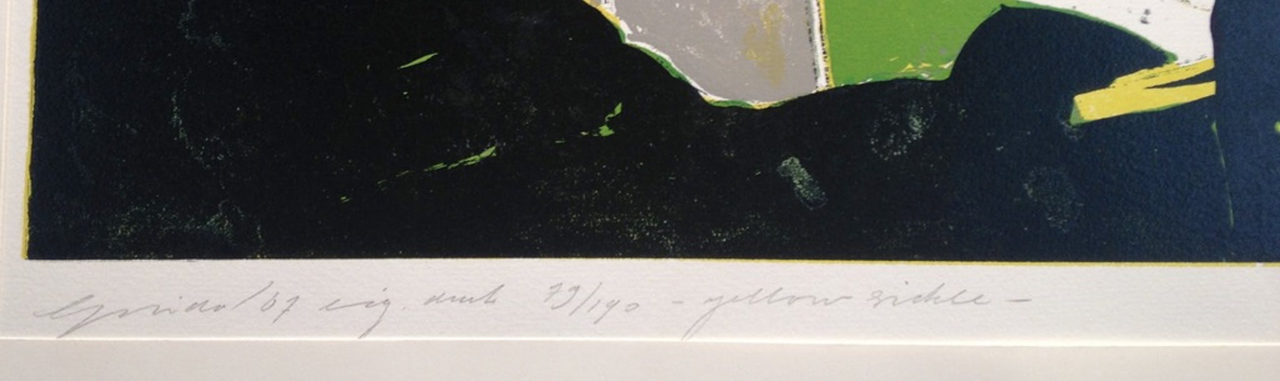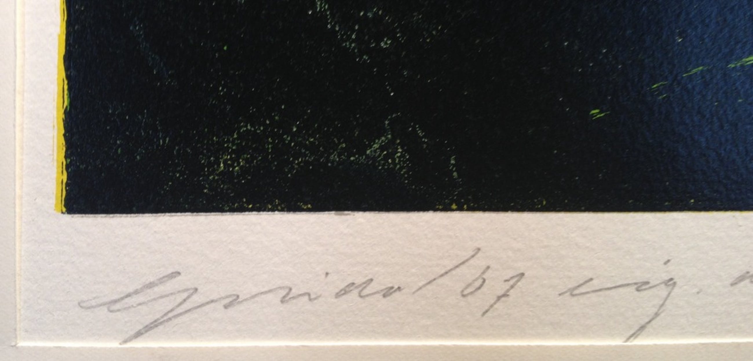 Met potlood getiteld, gedateerd, genummerd 79/190, gesigneerd en voorzien van de kwalificatie 'eigen druk'. Afmetingen: 61x64 (cm)2. in Passepartout.