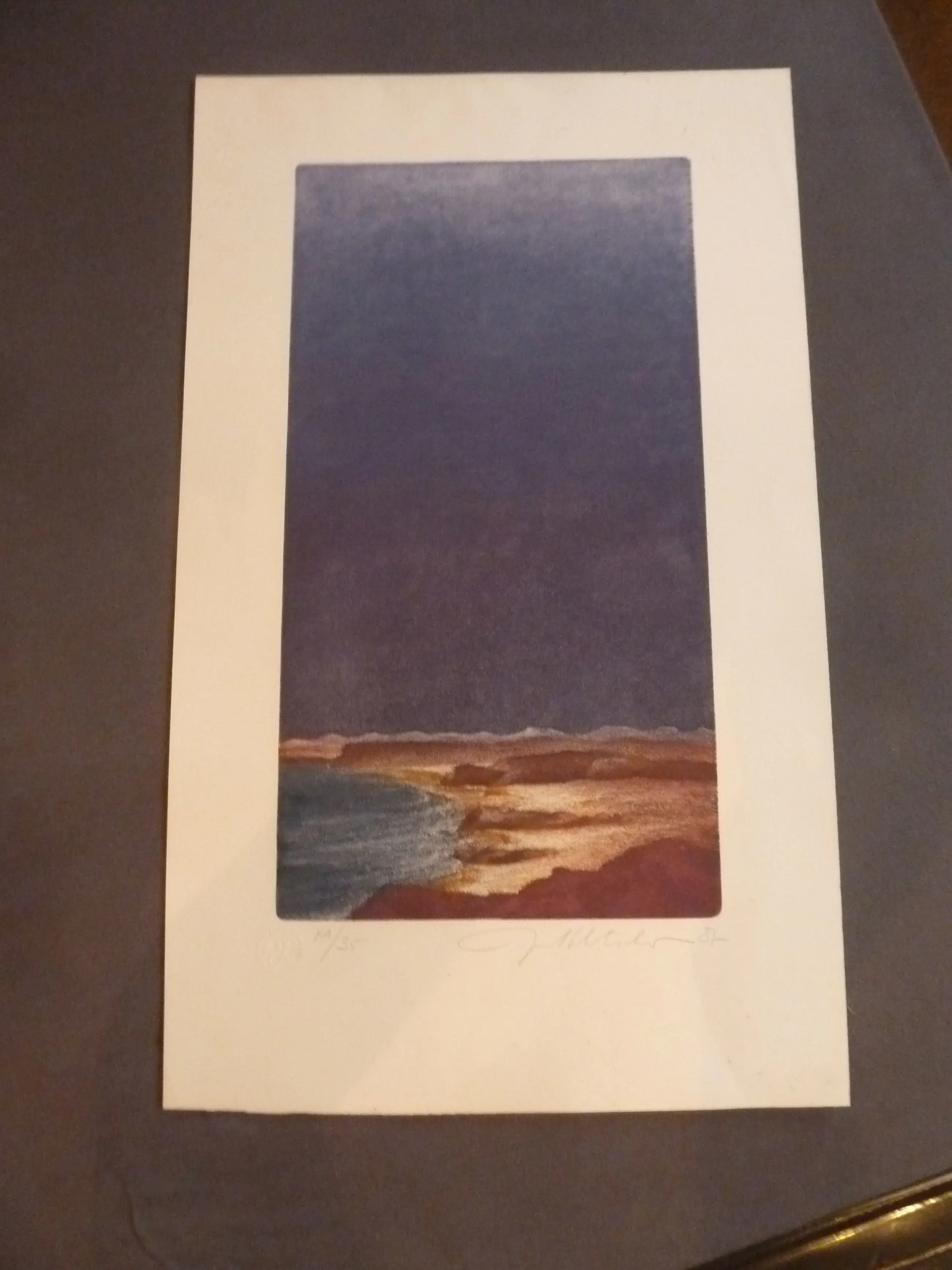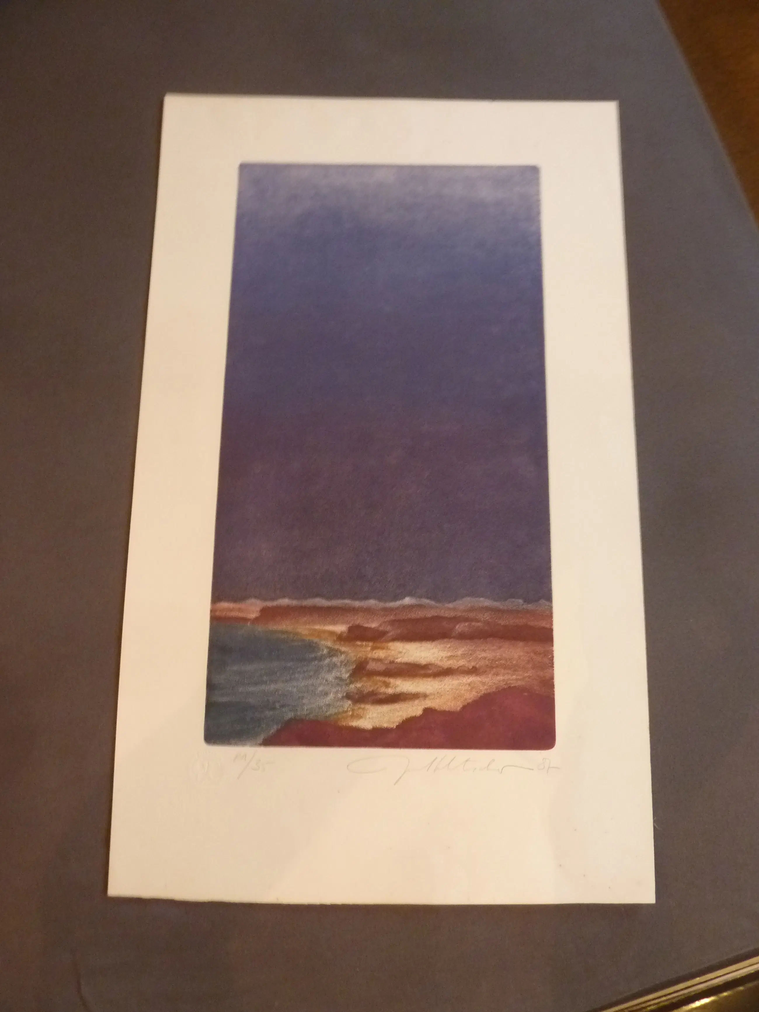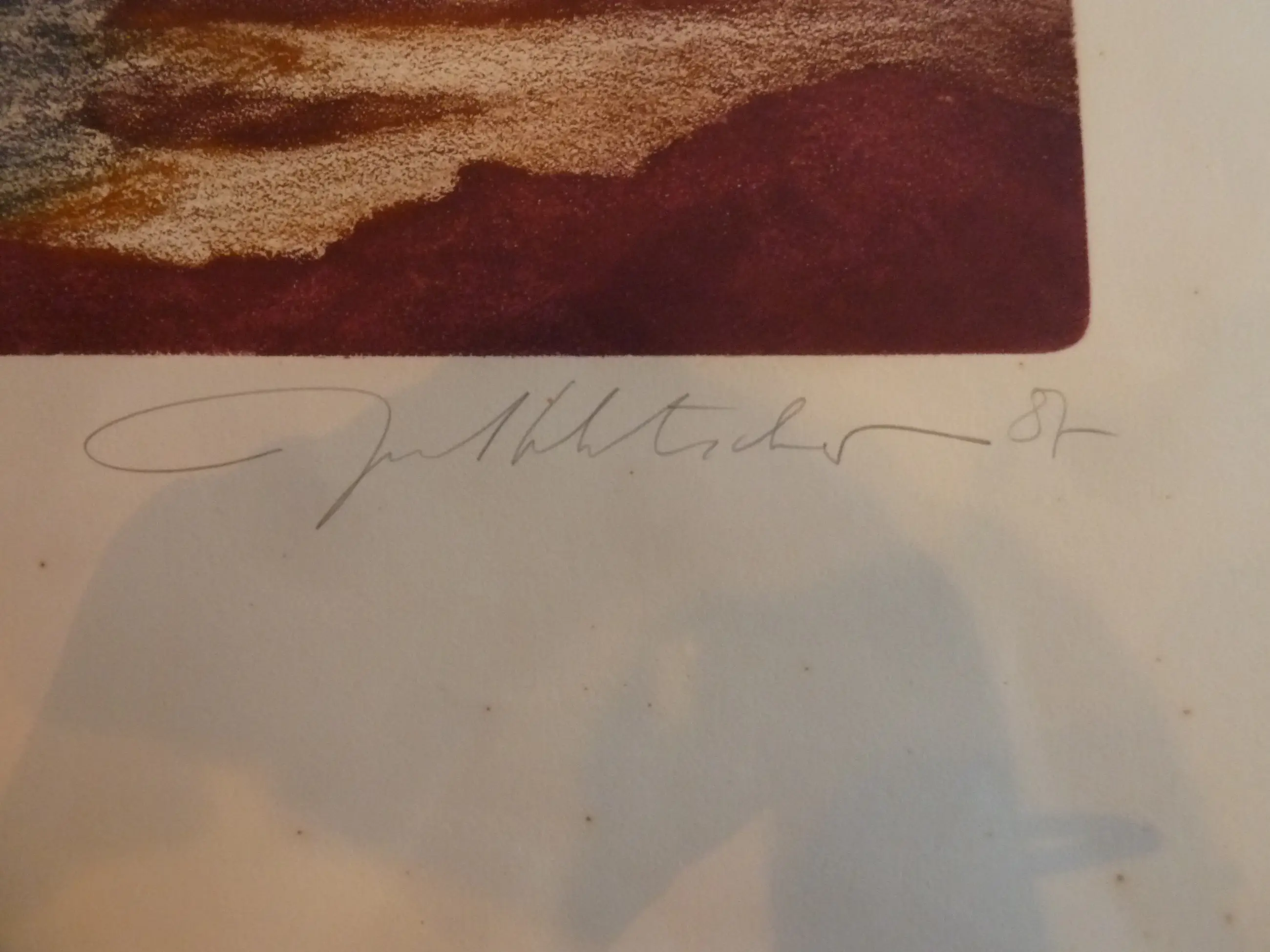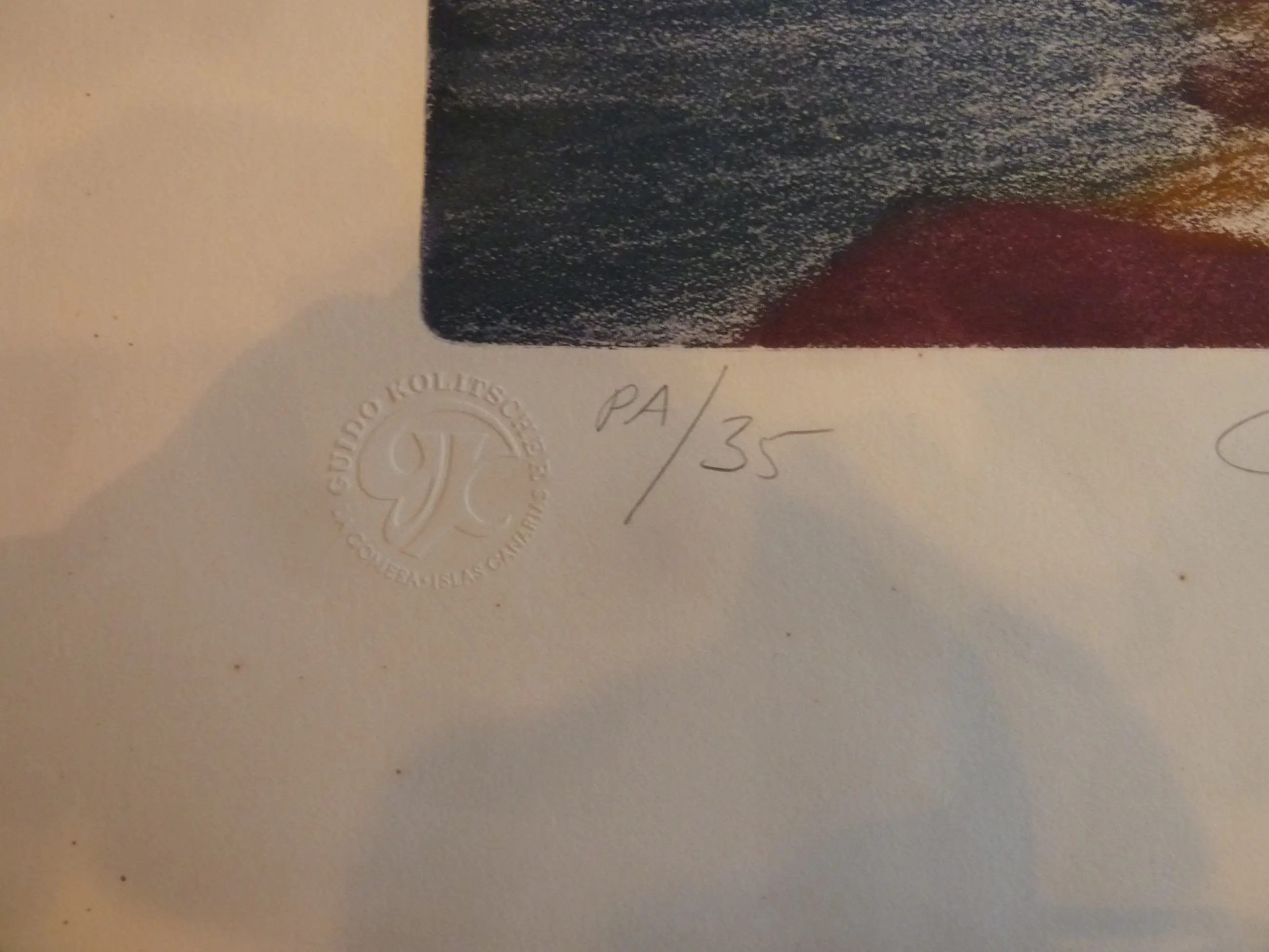 De Oostenrijks-Spaanse schilder maakte veel van zijn schilderijen op Tenerife. De rotsachtige kust van Los Gigantes was een van zijn favoriete onderwerpen. Deze sfeervolle ets is handgesigneerd in de rechterbenedenhoek en het aantal exemplaren staat vermeld in de linkerbenedenhoek naast de reliëfstempel van de kunstenaar.