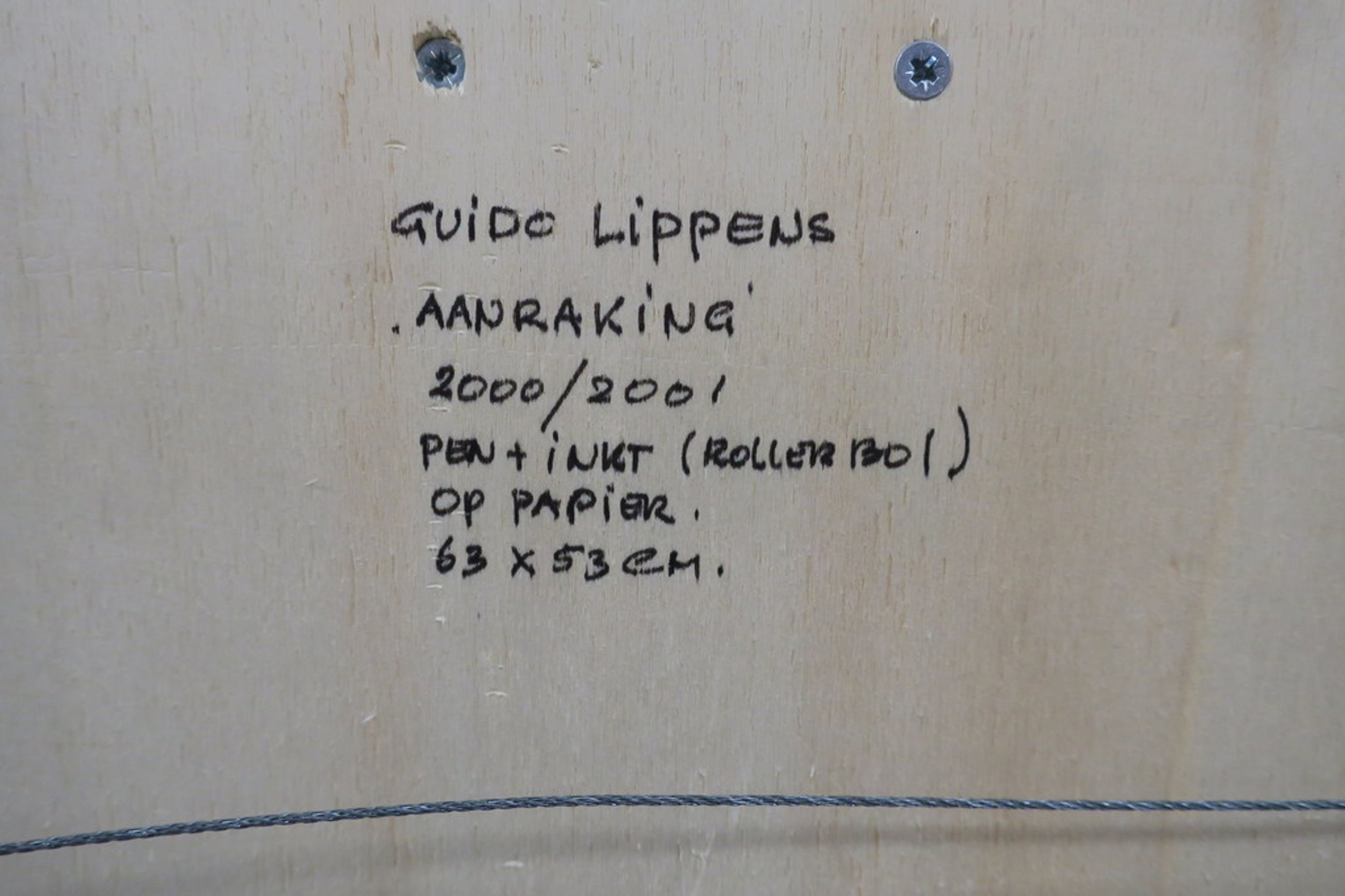 Indrukwekkende tekening van Guido Lippens! Volledig opgebouwd uit streepjes in een drietal kleuren die gezamenlijk als wel afzonderlijk van elkaar de compositie tevoorschijn doen toveren.