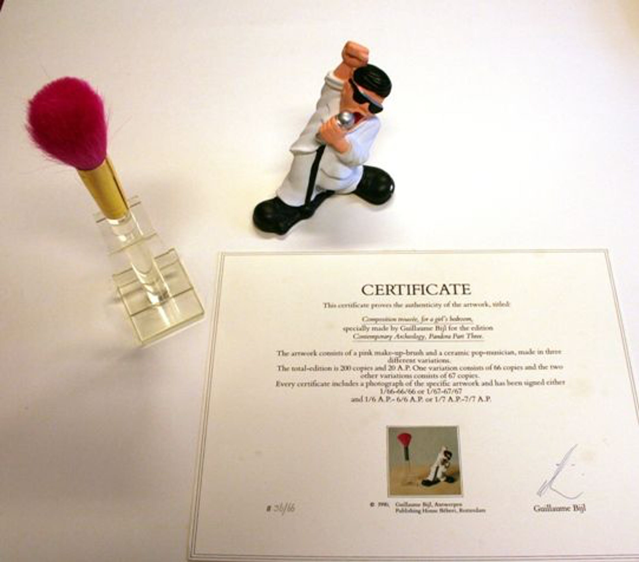 Guillaume Bijl Multiple met gesigneerd certificaat Keramisch beeldje - 11 x 12 cm en een roze kunststoffen make-up borstel Uit; Contemporary Archeology Part III Bebert