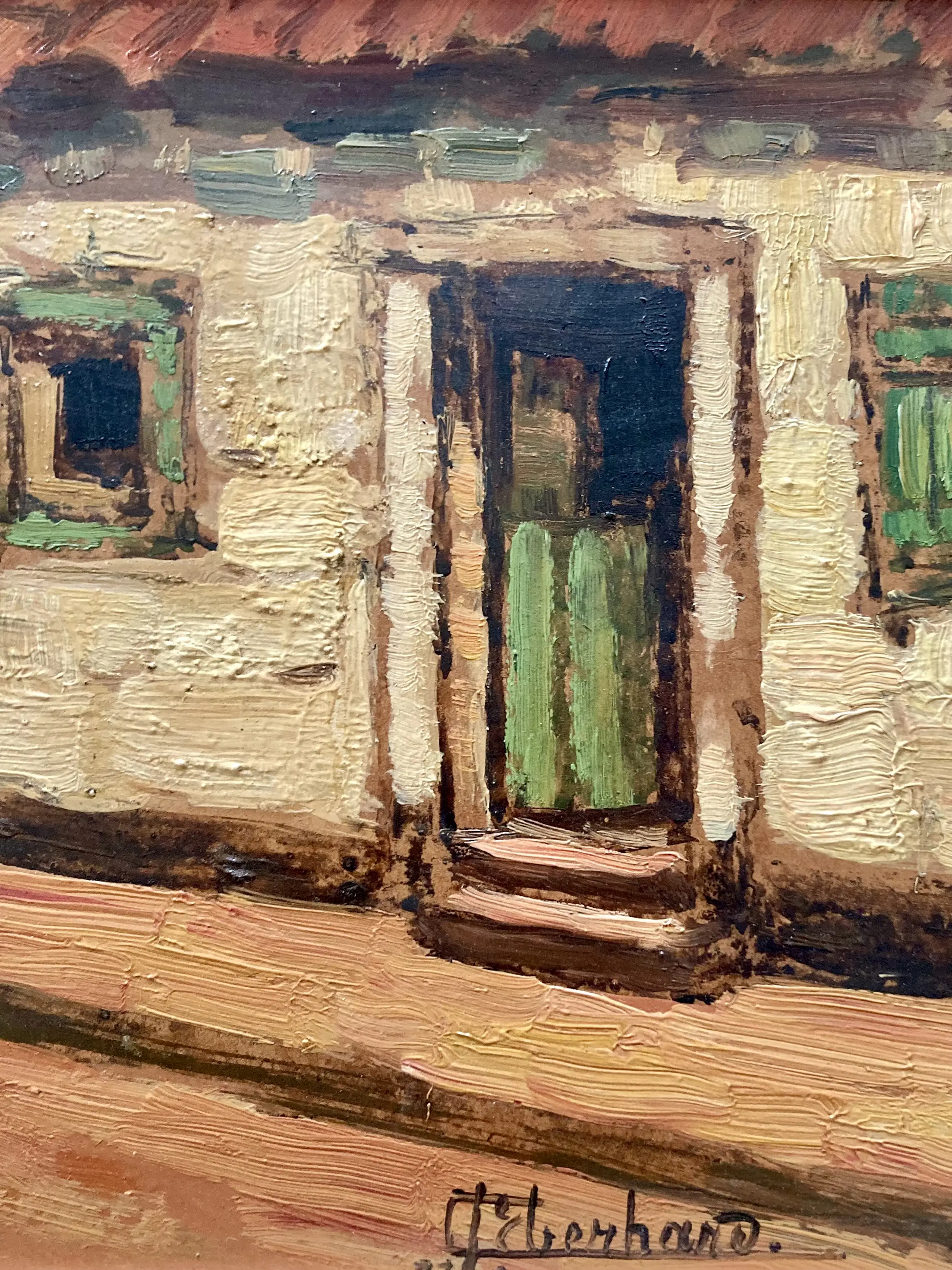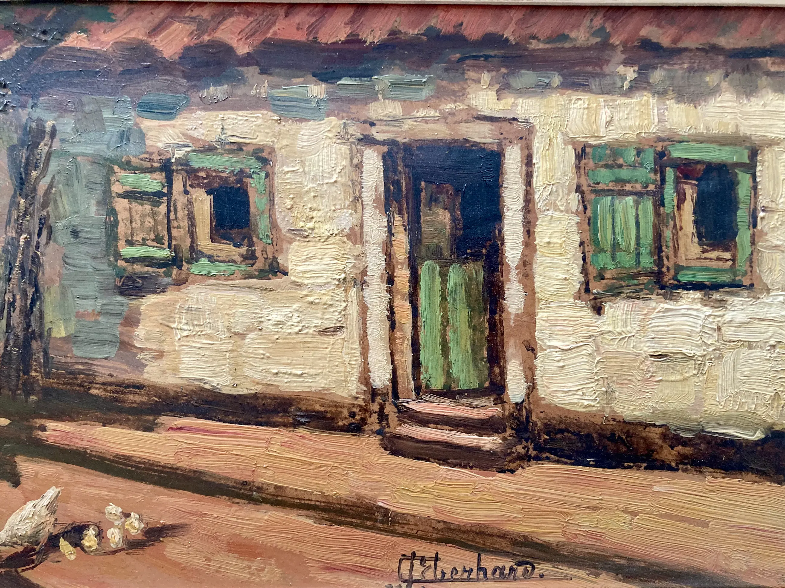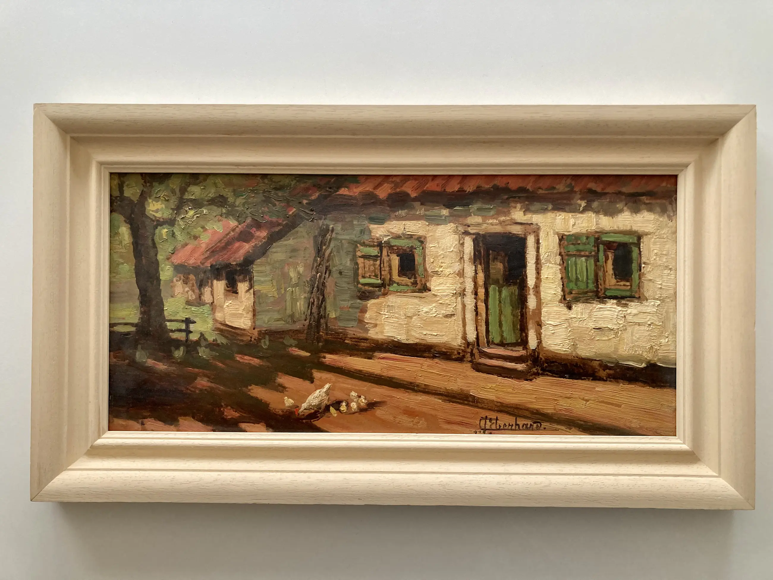 Romantisch decor van (Limburgs) boerderijtje van mergelsteen in een landschappelijke setting. Indertijd rechtstreeks verkregen van Eberhard. Professioneel gerestaureerd door Schiltaere en van nieuwe lijst voorzien. Sierraad aan de wand.