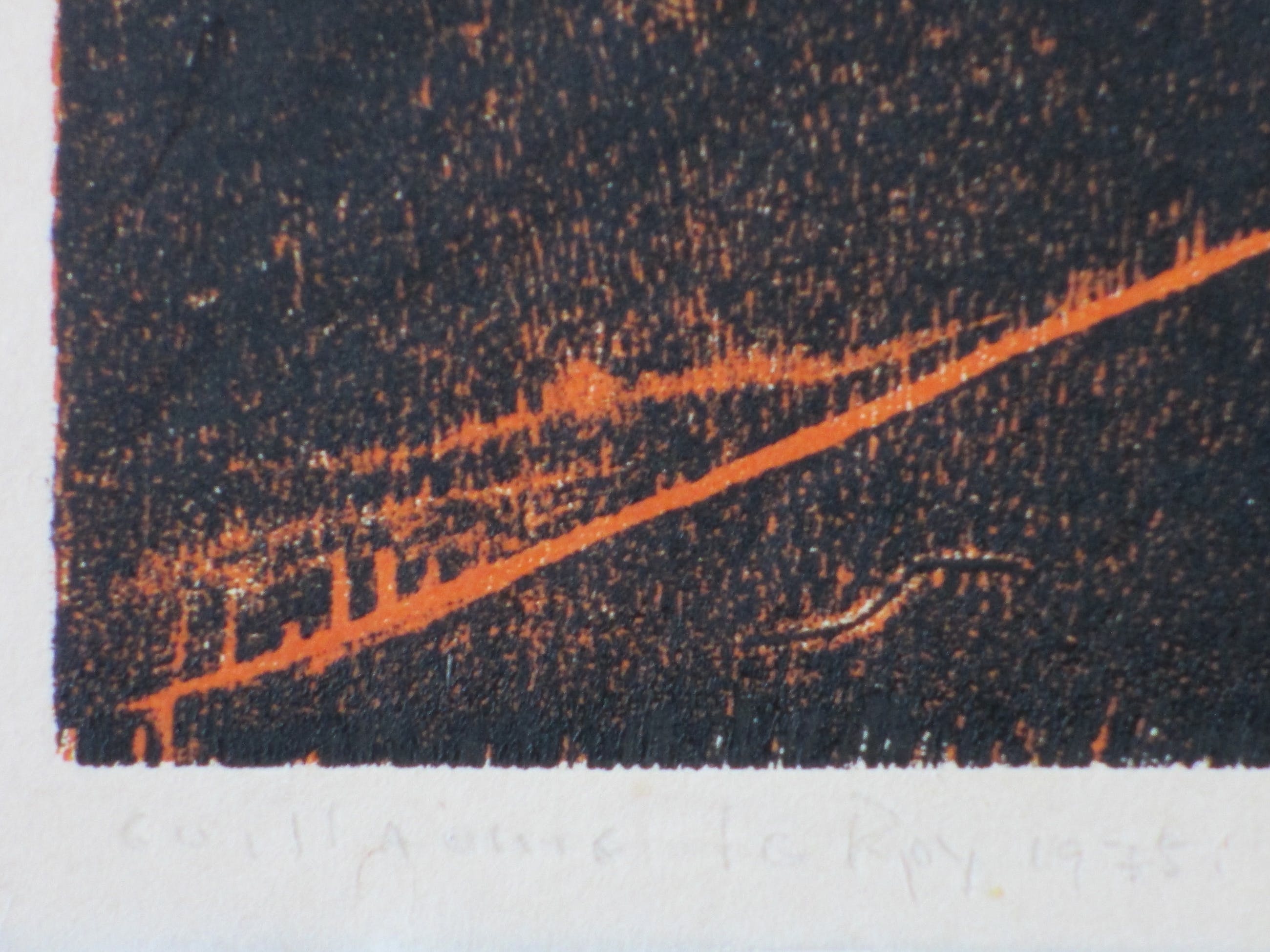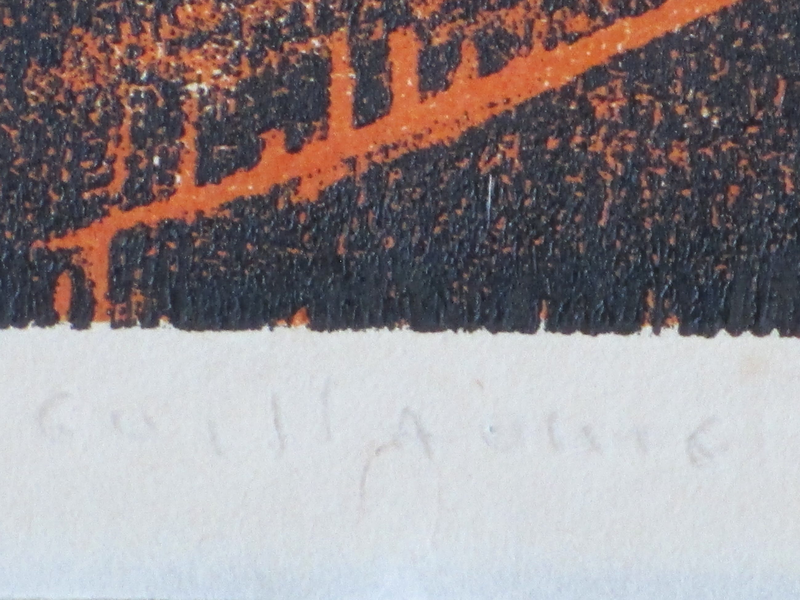 Houtsnede door Guillaume le Roy Voorstelling van een abstractie in rood, zwart en bruin. Losbladig, beeldmaat 80x60, bladmaat 84x63 Gesigneerd, gedateerd en genummerd in potlood linksonder: 'Guillaume le Roy, 1975: 133/200' Authenticiteit volledig gegarandeerd