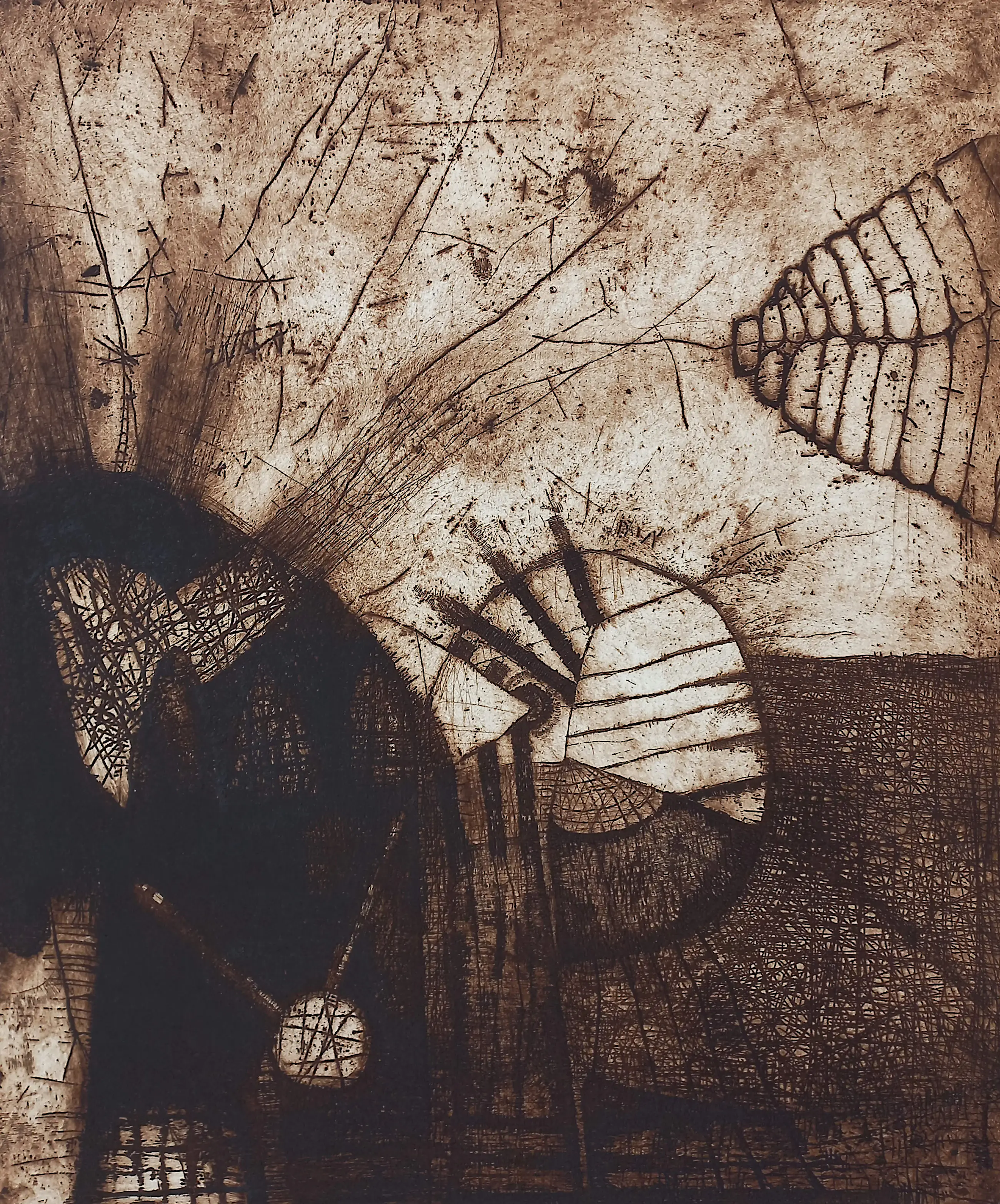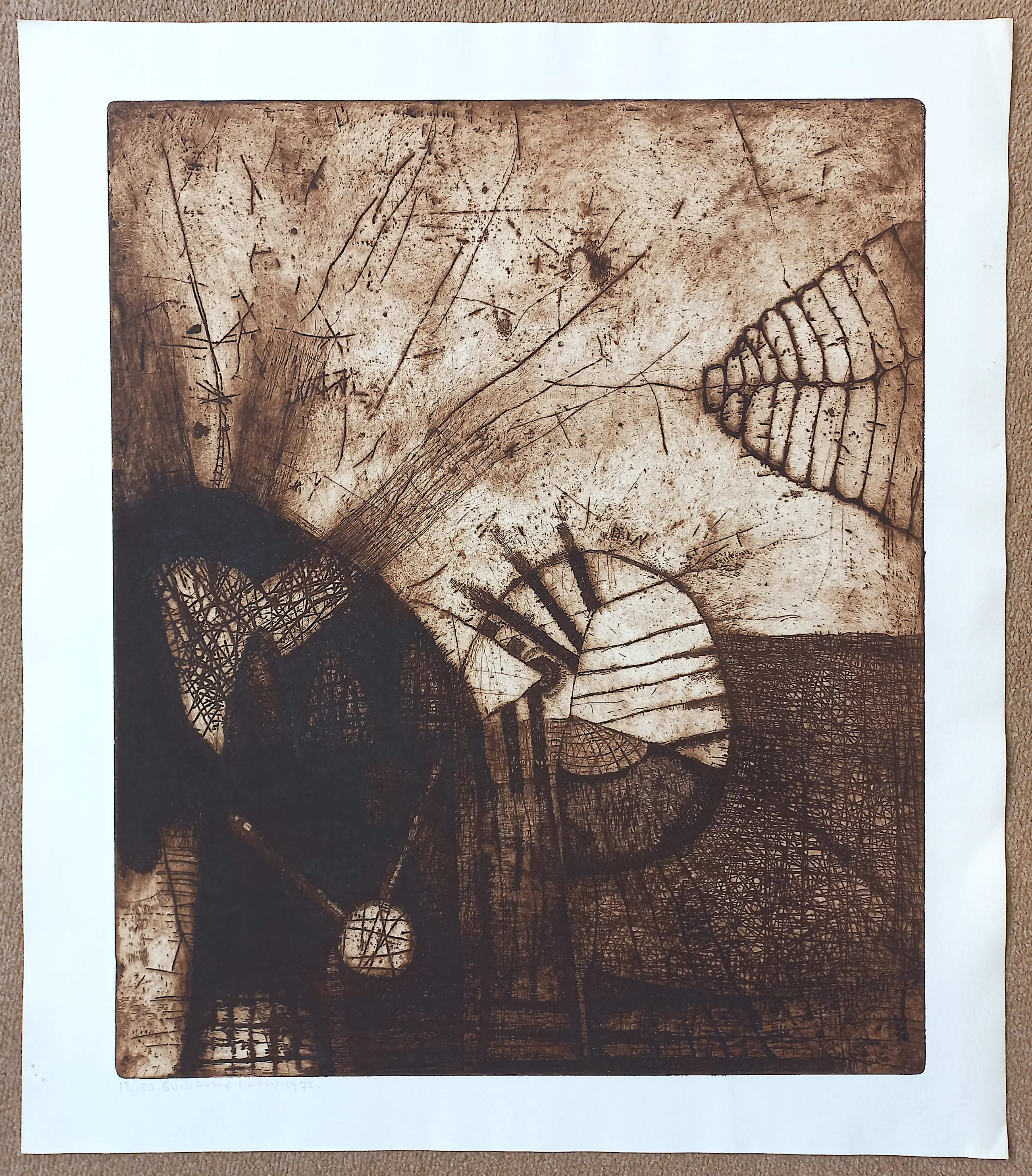 Karakteristieke, duistere ets van Guillaume Le Roy. Aquatint ets op geschept papier, met potlood gesigneerd, gedateerd (1972) en genummerd (13/150). In zeer goede conditie.
