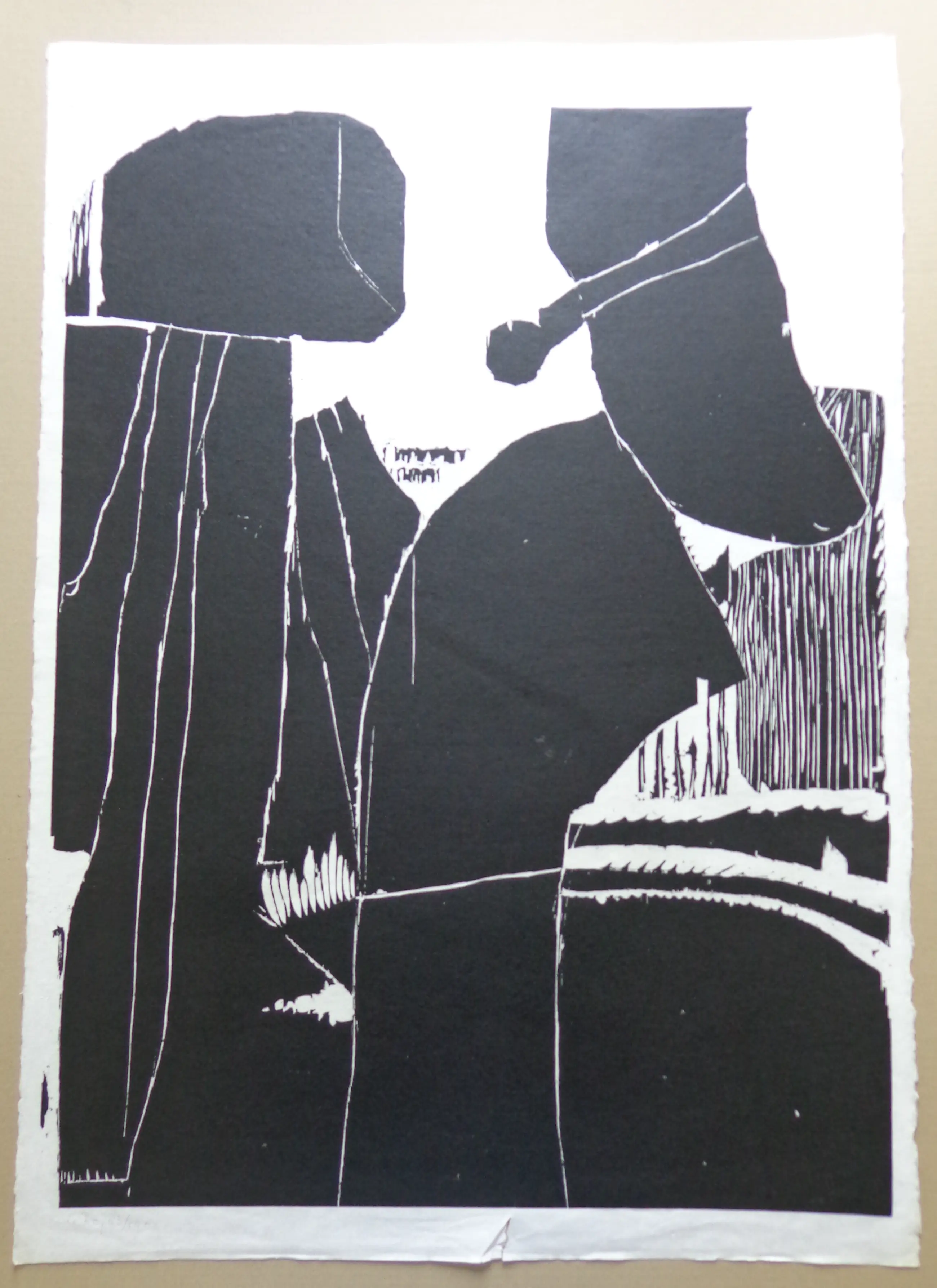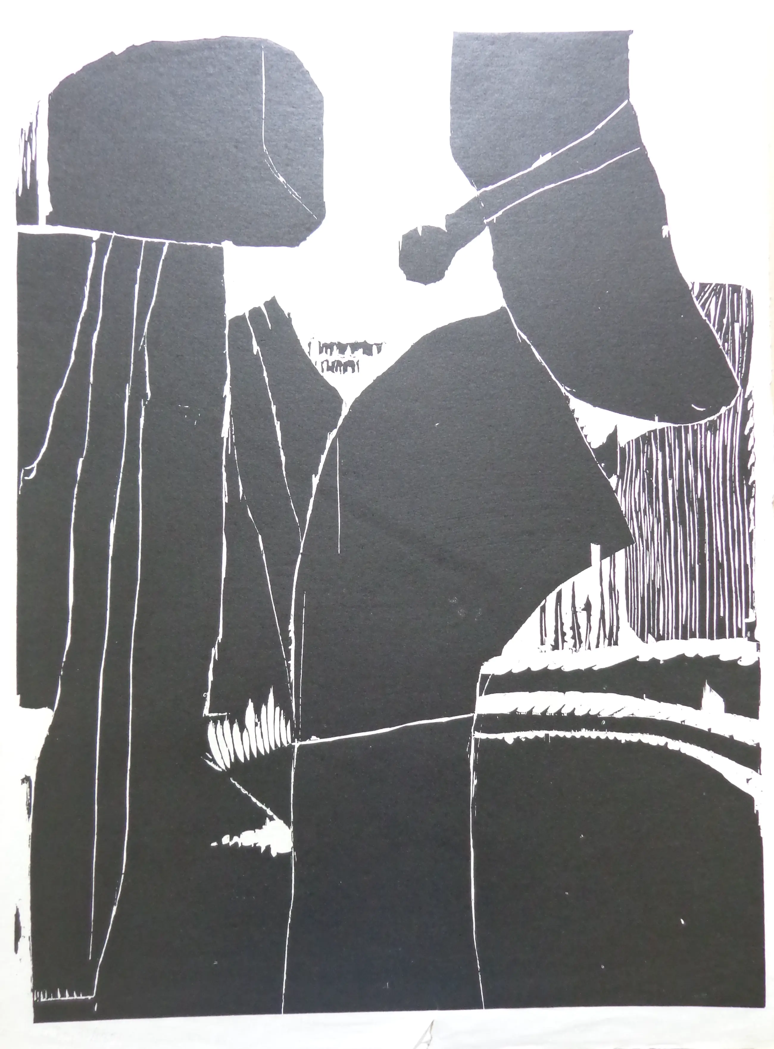 Guillaume Le Roy (1938-2008). Abstractie. Zwart-wit houtsnede op dun papier. Gesigneerd met potlood. Ex.nr. 83/190. Uitgave "Prent190". Scheurtje aan boord onder midden. Deuken. Vlekjes boven. Blad: 88x63cm.