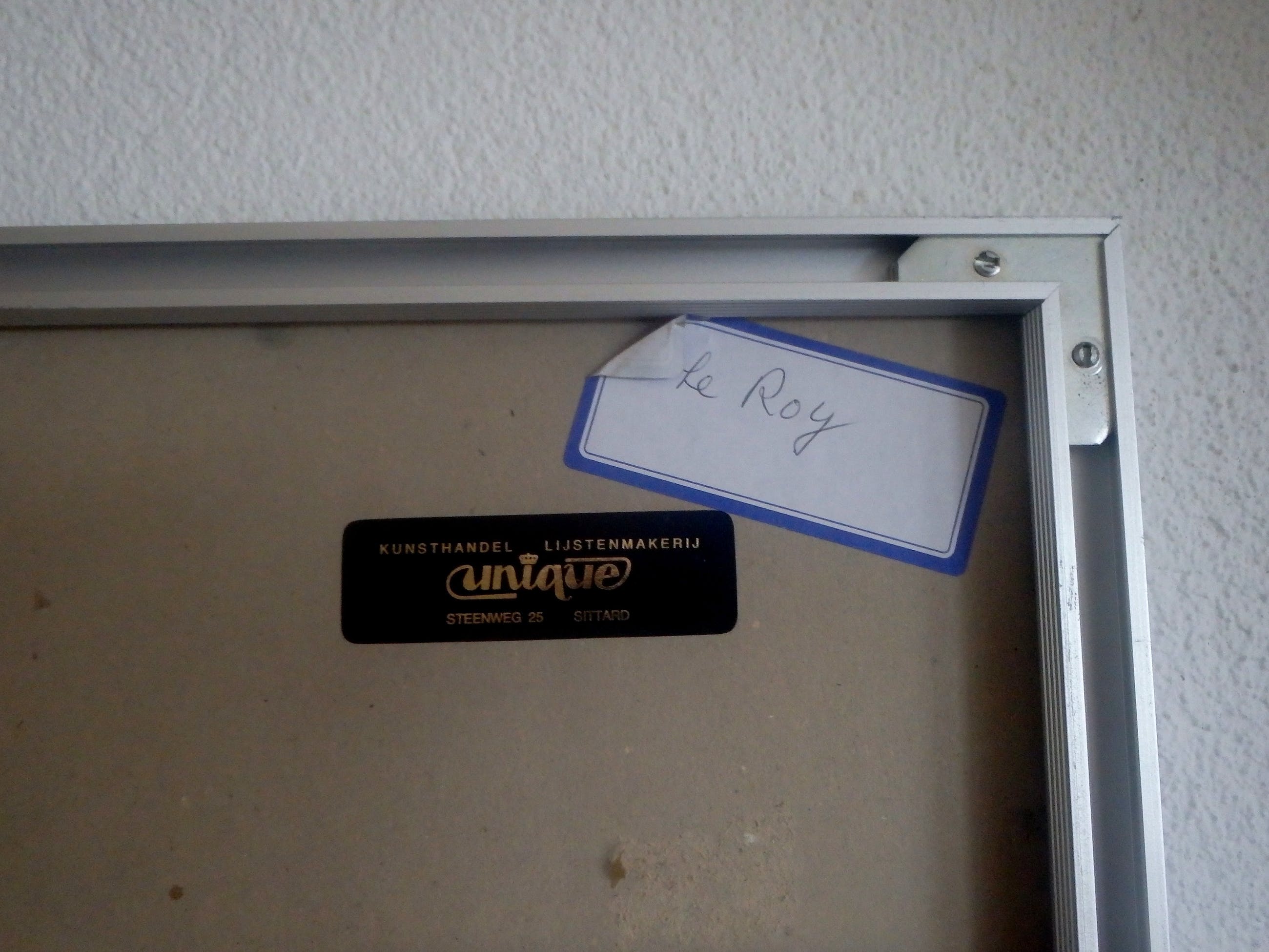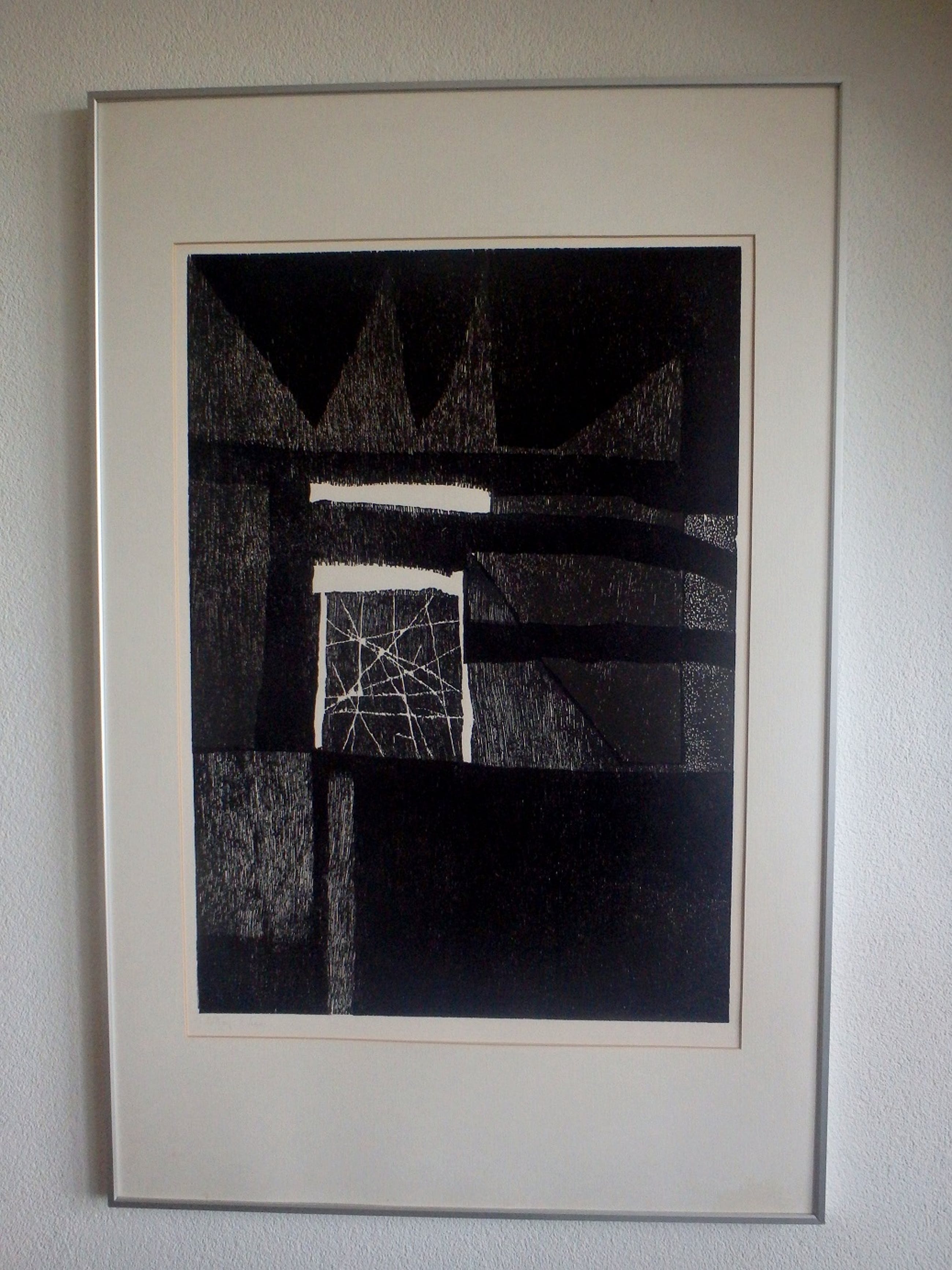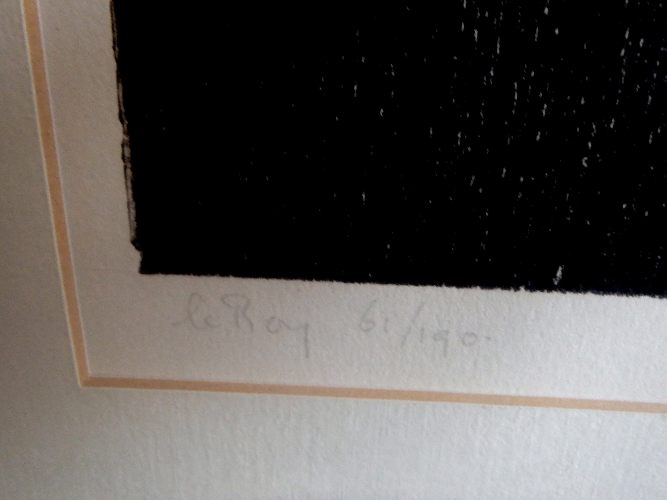 Hout/linosnede 68x47, linksonder gesigneerd Le Roy en genummerd 61/190, werk is van 1985, goed ingelijst met passe-partout, maar zonder glasplaat, maat lijst 100x65.