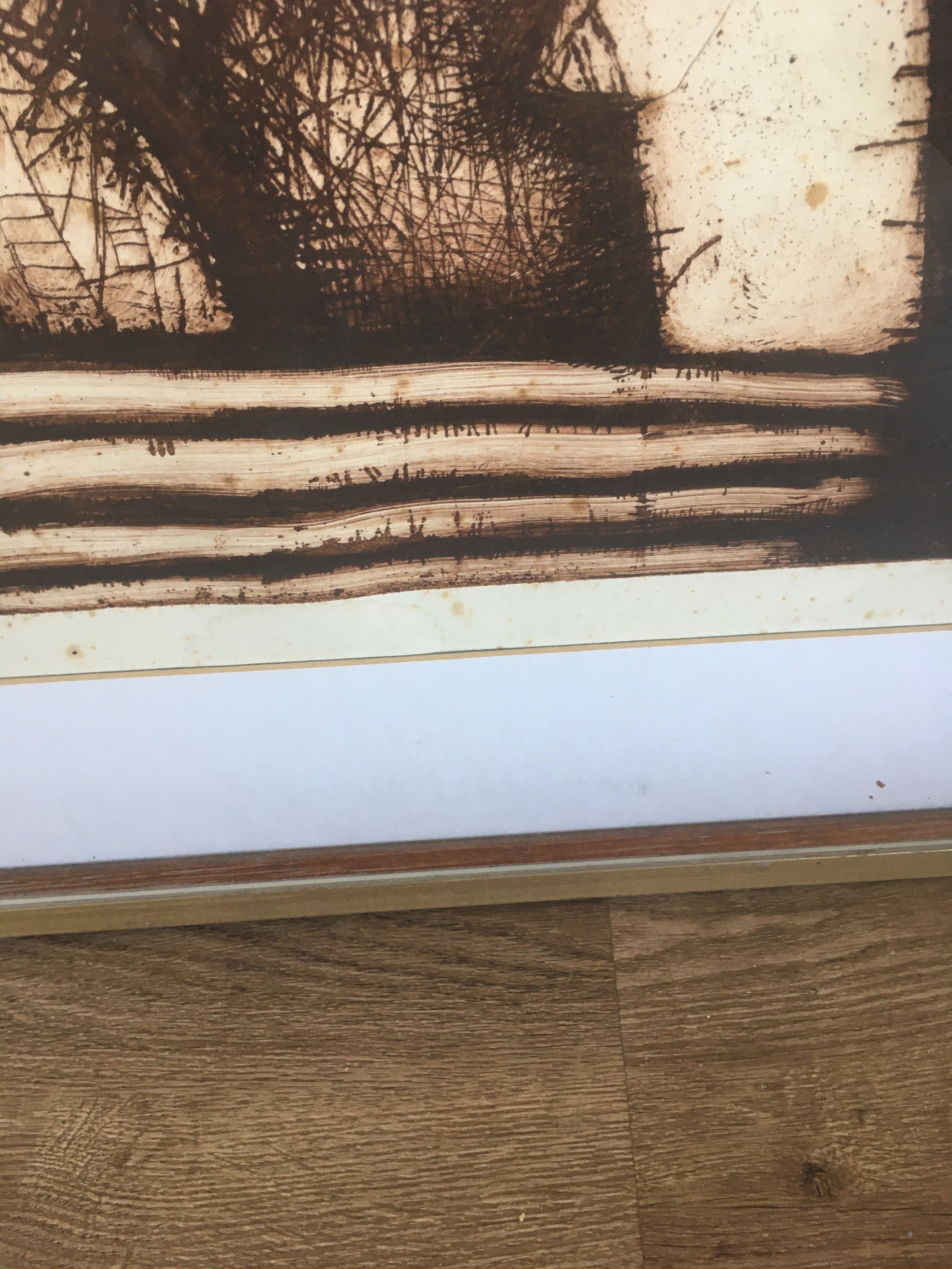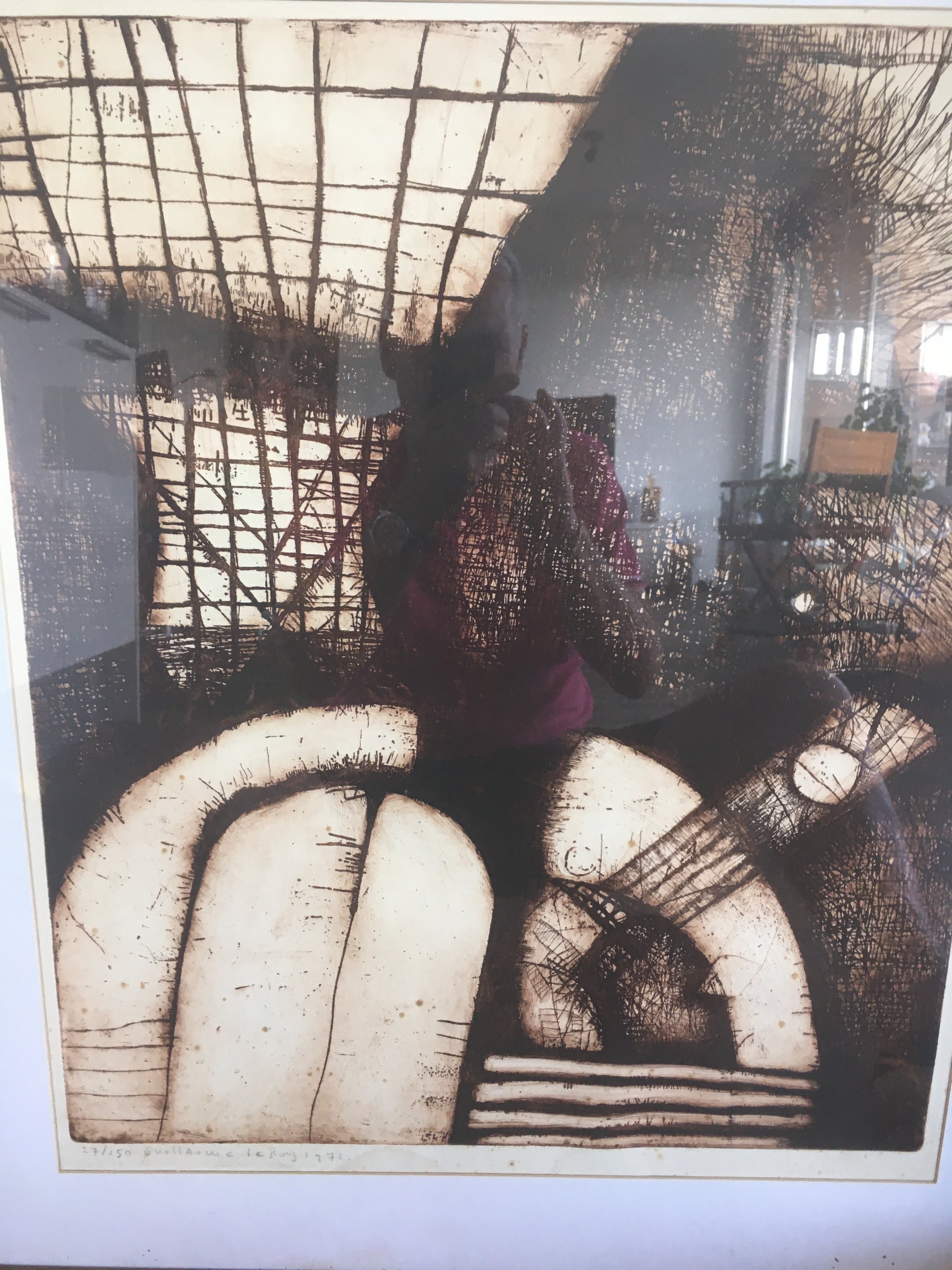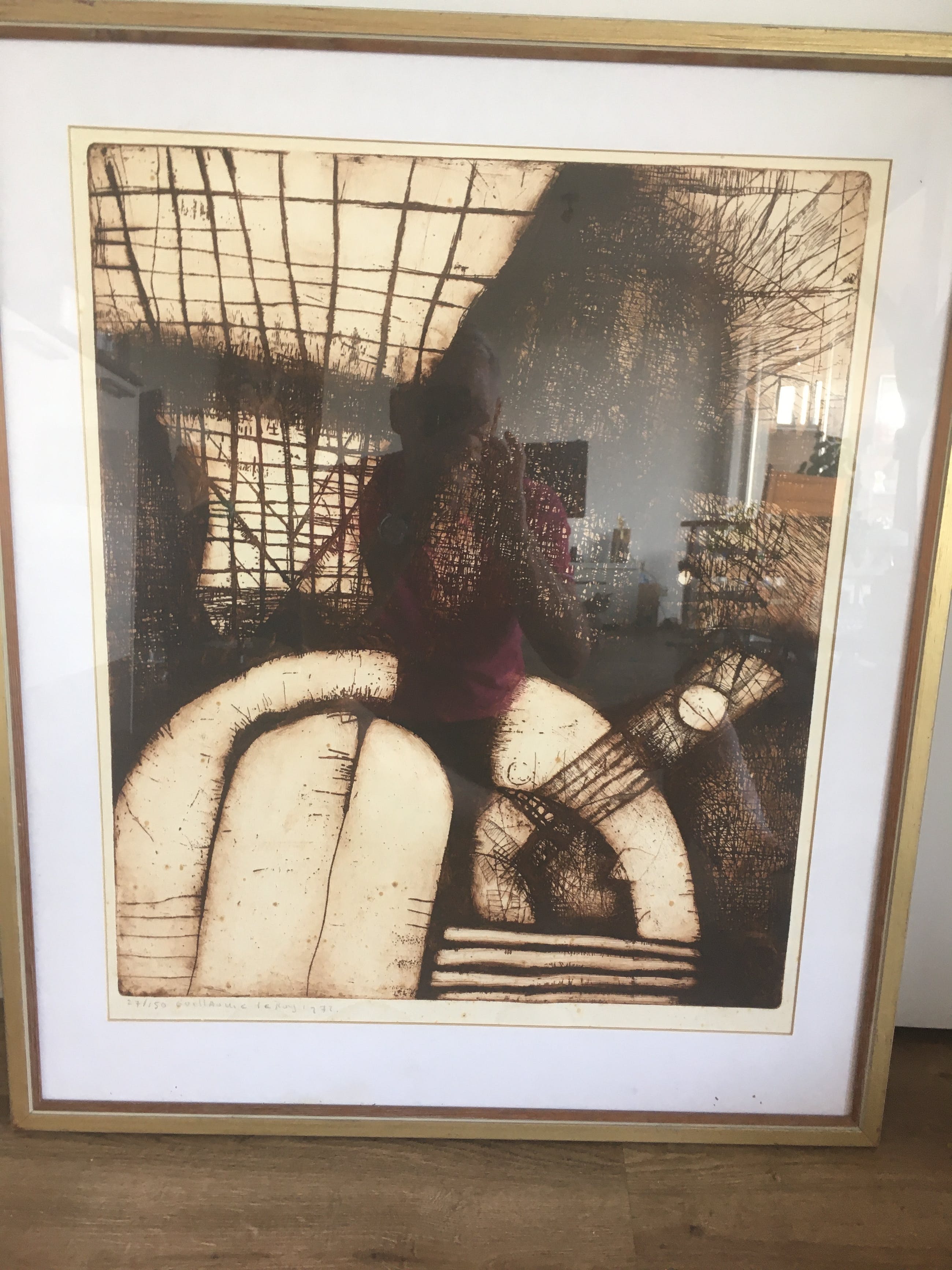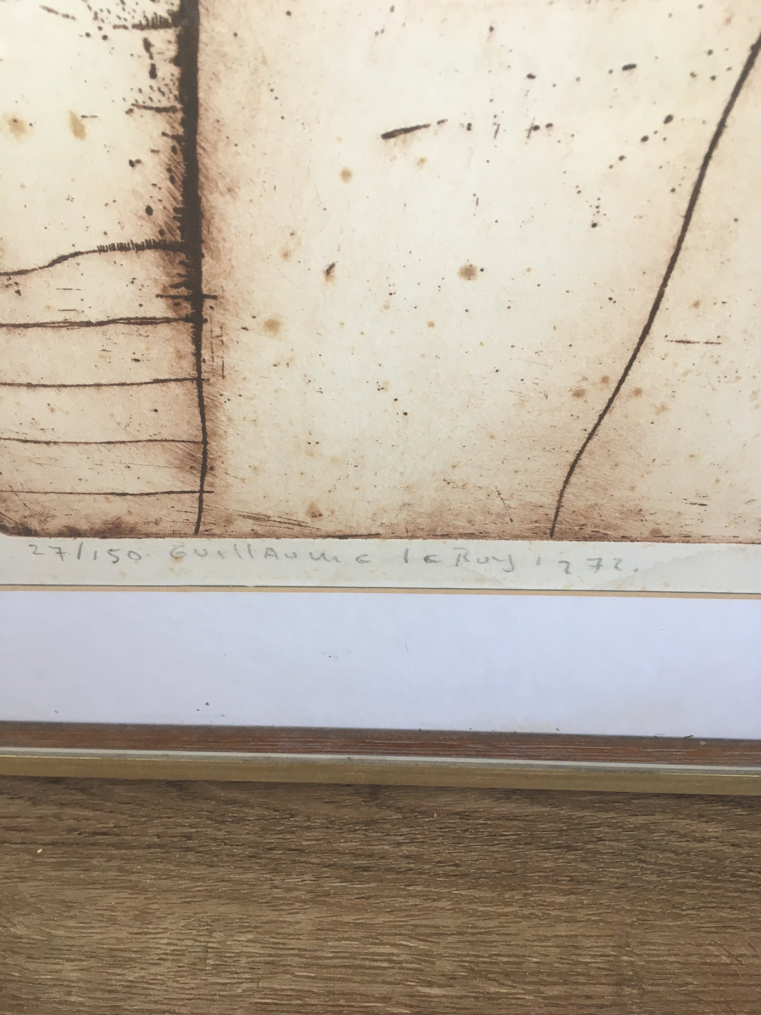 Ets in bruine inkt op geschept papier met een goudkleurige houten lijst. Met l.o.27/150 Guillaume le Roy 1972 met potlood.