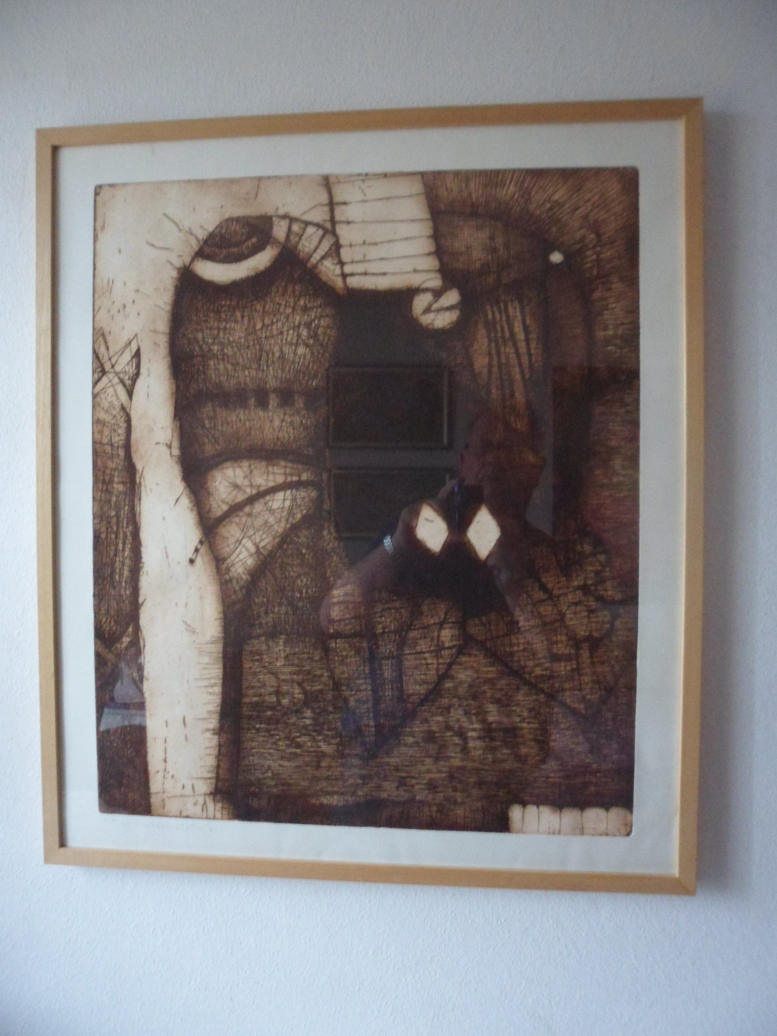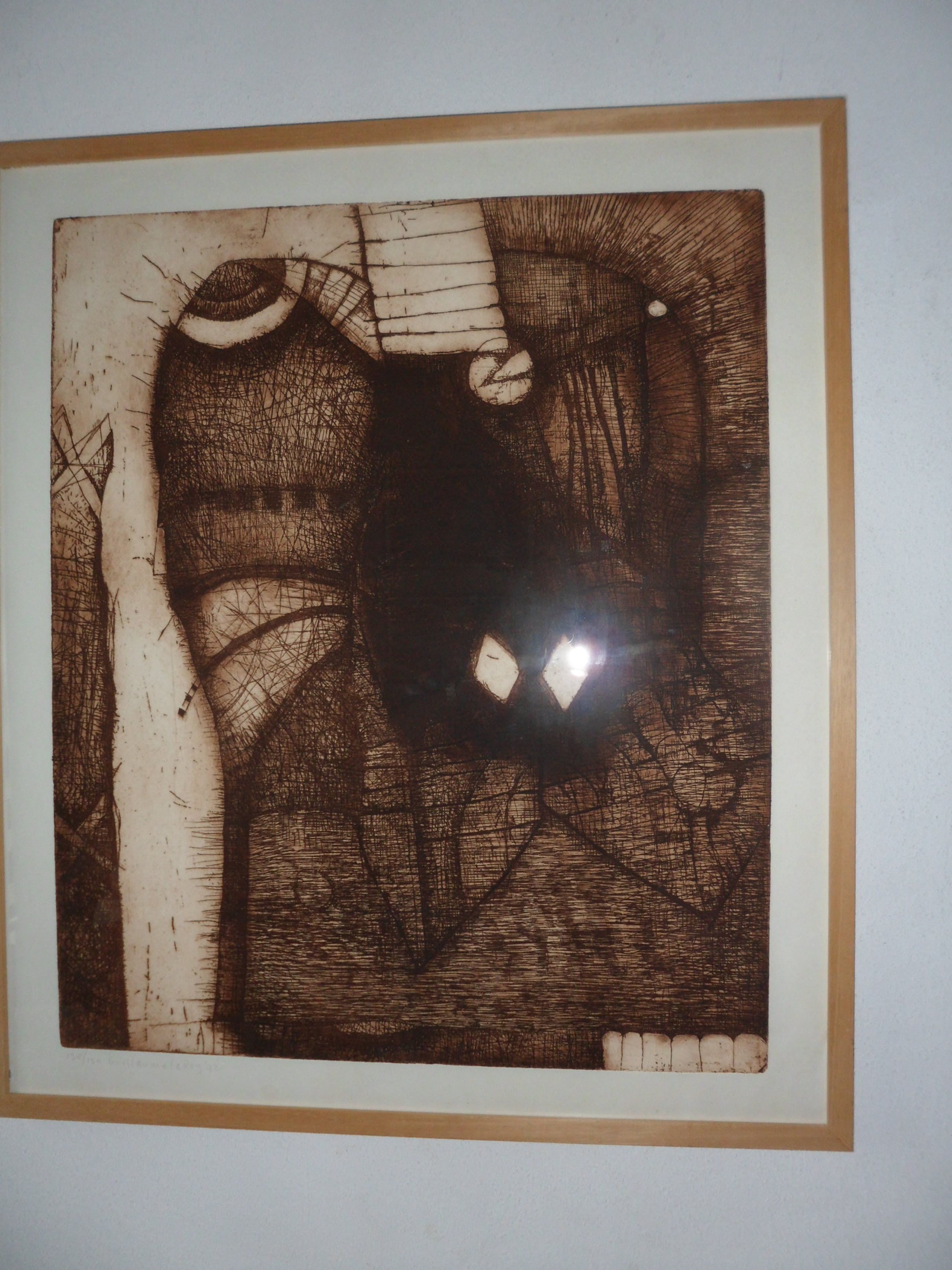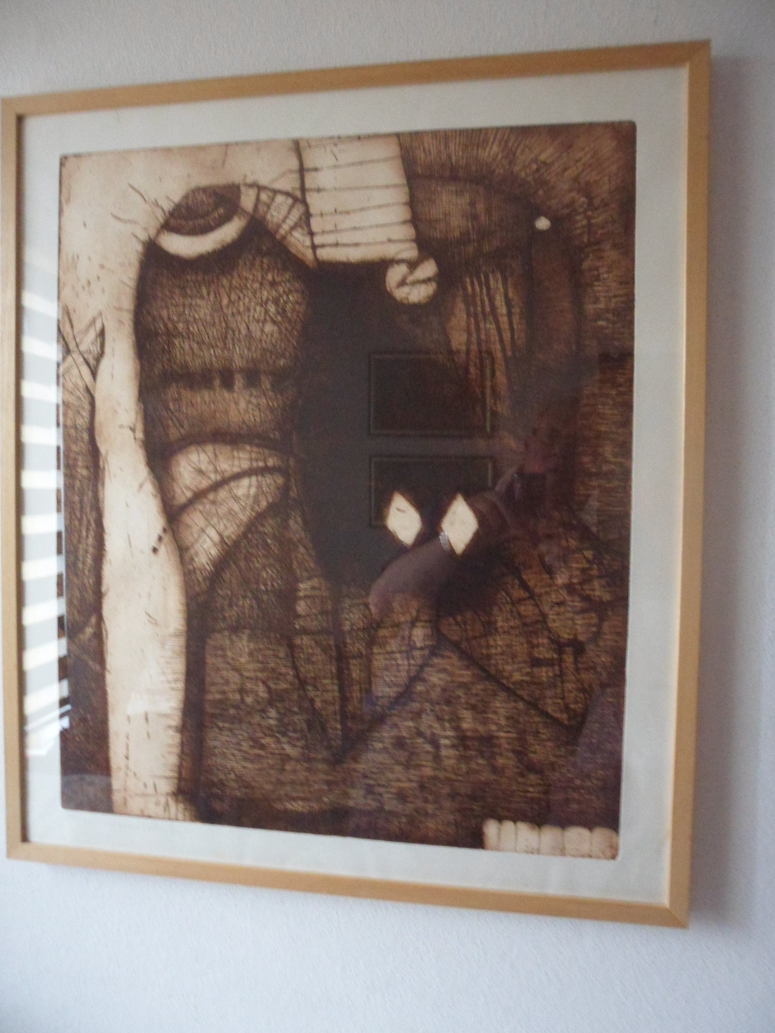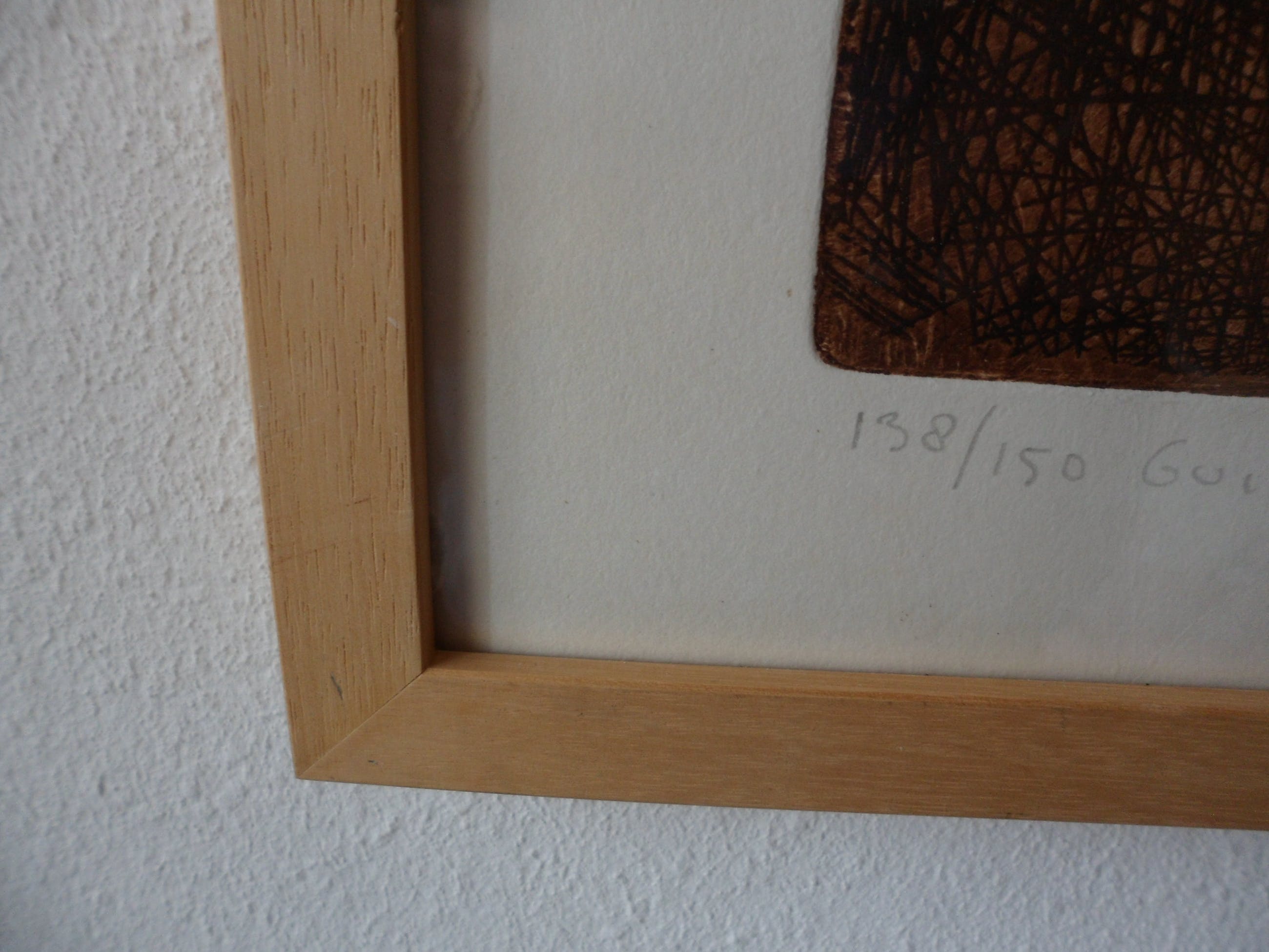 Fraaie abstracte ets in sepia kleuren. op papier, met potlood gesigneerd, gedateerd (1972) en genummerd (138/150). In goede conditie.