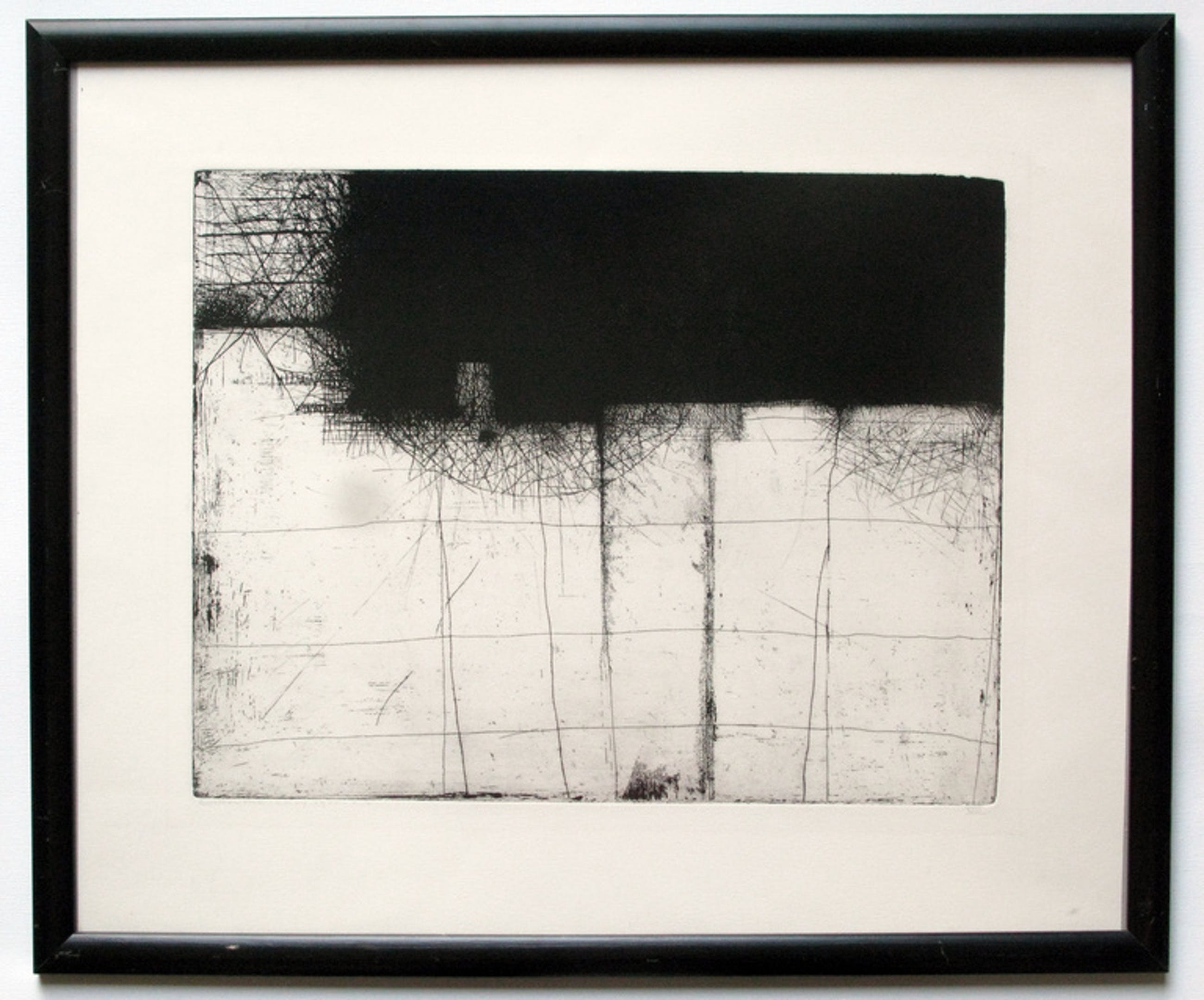 Betreft een groot abstract werk (ets) uit kleine (ea) oplage. Het werk verkeert in onberispelijke staat, is in potlood gesigneerd. Het geheel is modern ingelijst in een massief (zwart) houten omlijsting. Compleet met ophangsysteem kan het zondermeer direct aan de wand worden opgehangen.