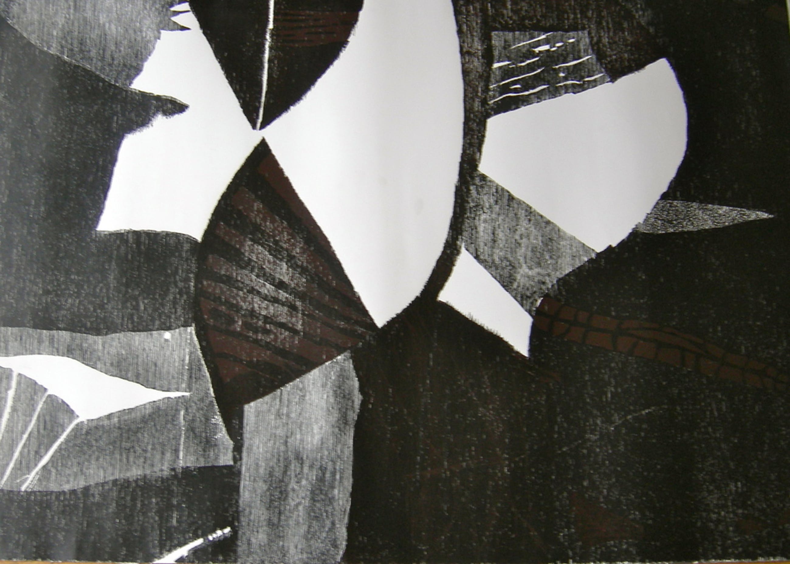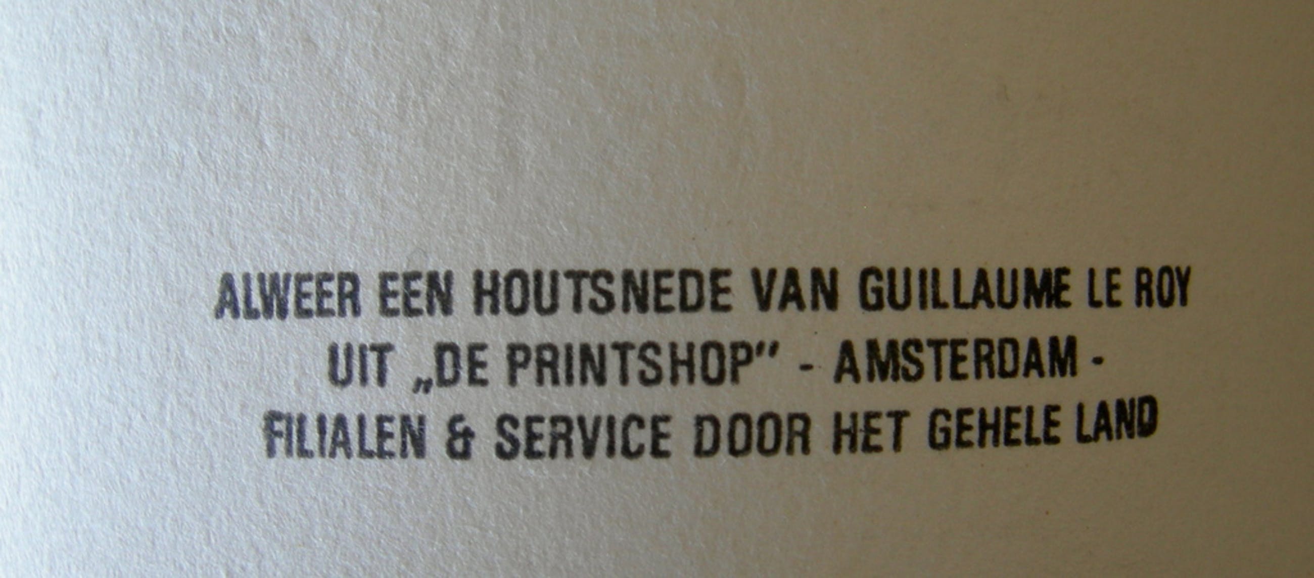 deze grote houtsnede is uit de 80-er jaren, exacte datum niet bekend. Groot formaat 80 x 120 cm., tot de rand van het zware papier gedrukt. De randen zijn iets rommelig. Kleur: bruin/zwart/wit. Op de achterkant is door middel van stempels gesigneerd, zie foto's (Printshop, A'dam - Piet Clement)