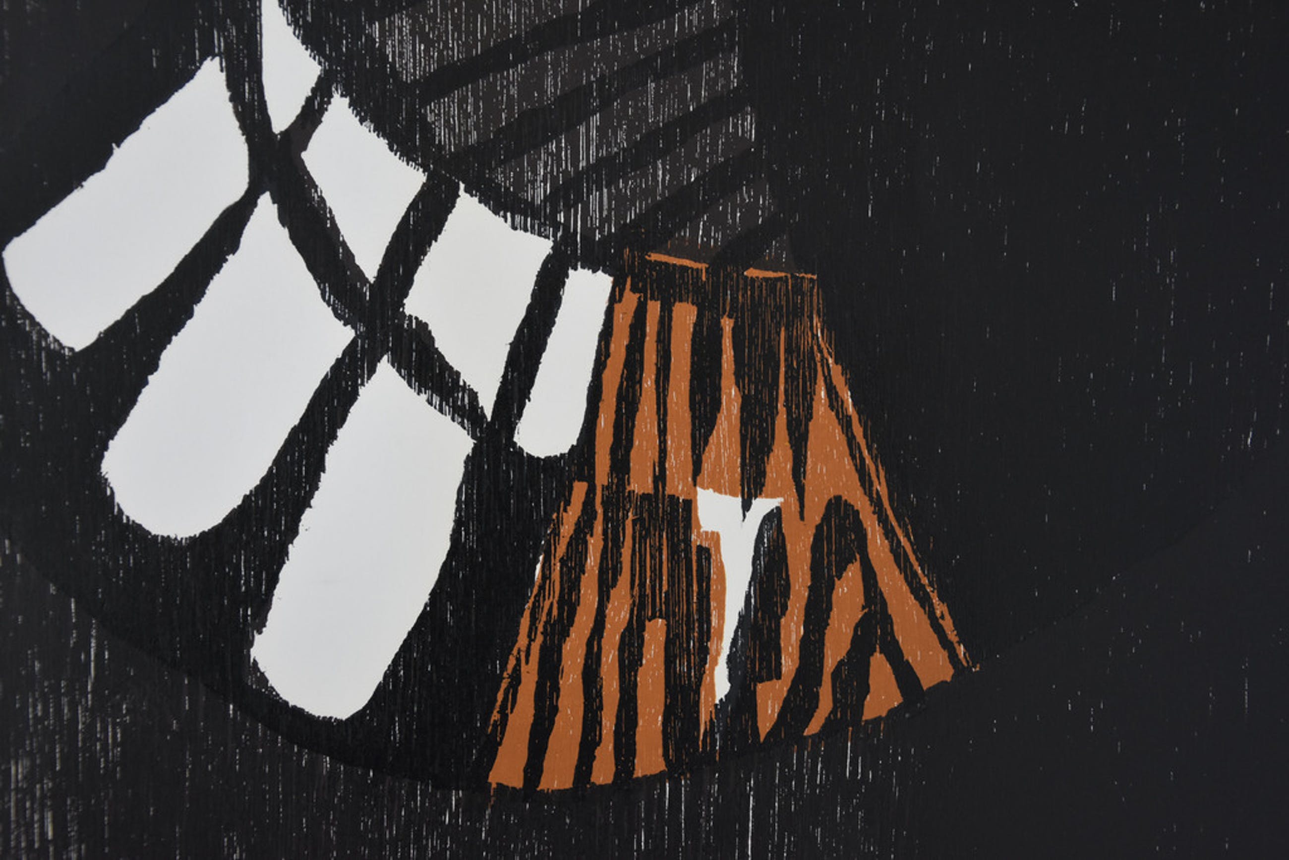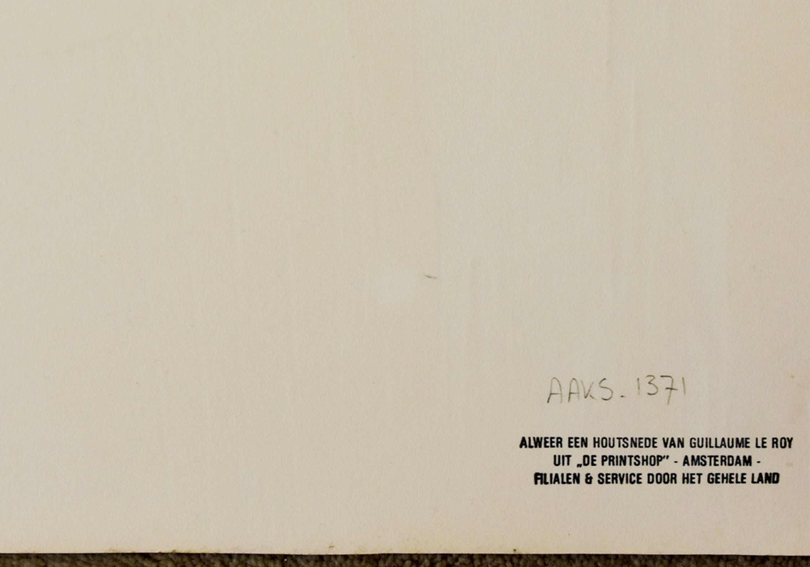 Na de bijzondere houtsnede van vorige veiling nu nogmaals een uit dezelfde serie afkomstige houtsnede en persoonlijk vind ik dit de mooiste Extreem groot formaat houtsnede op zwaar papier . Krachtige donkere tinten afgewisseld met gebruik van een aards bruin . veel detaillering kenmerken dit werk van Guillaume le Roy wiens oeuvre voornamelijk uit houtsnedes en etsen bestaat. Deze houtsnede is gesigneerd en gedateerd op de achterzijde.