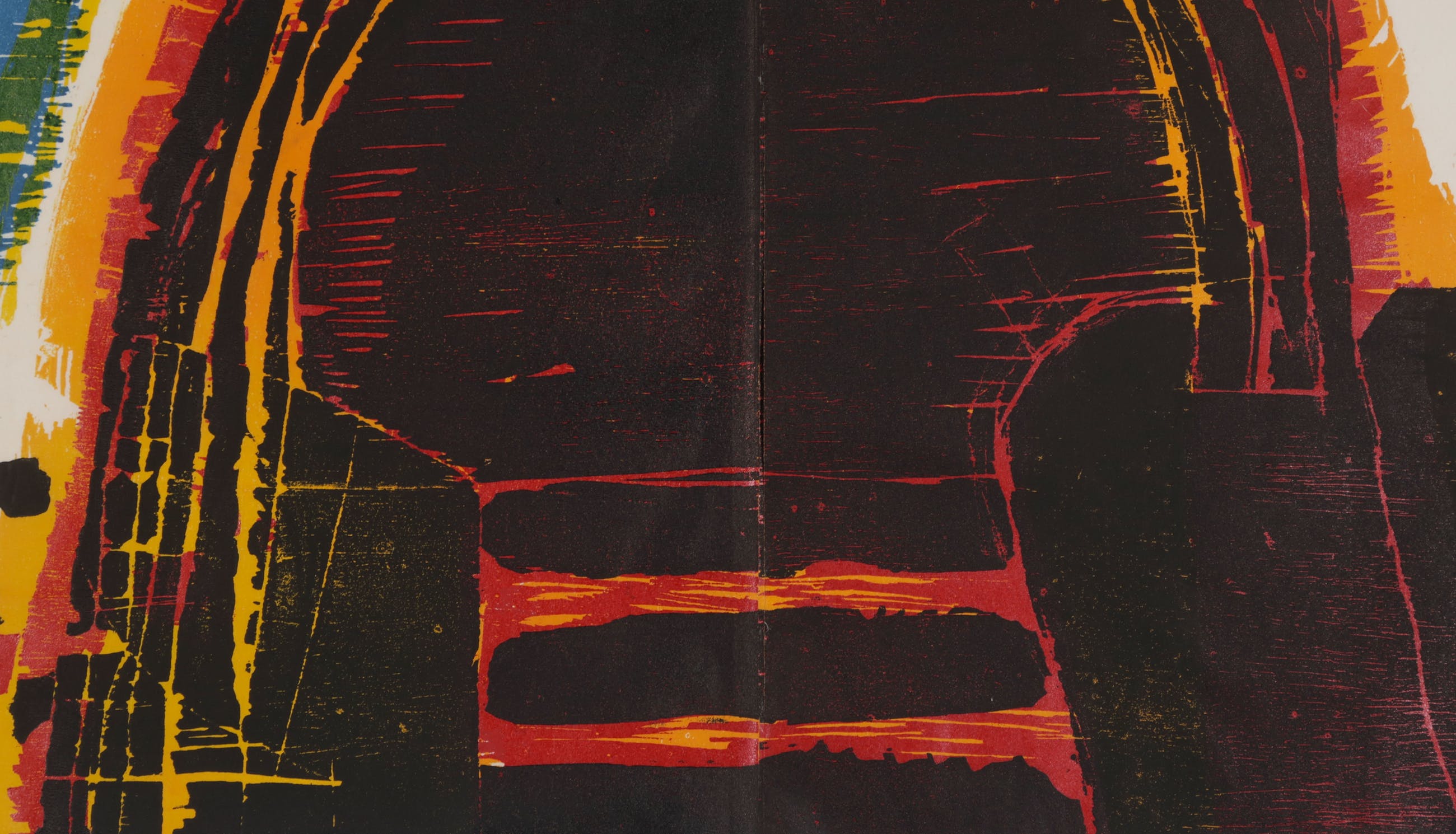 Drager: Houtsnede op 2 dun geschepte bladen, aan elkaar bevestigd met tape. Het werk is bevestigd op onderblad en achter passe-partout.