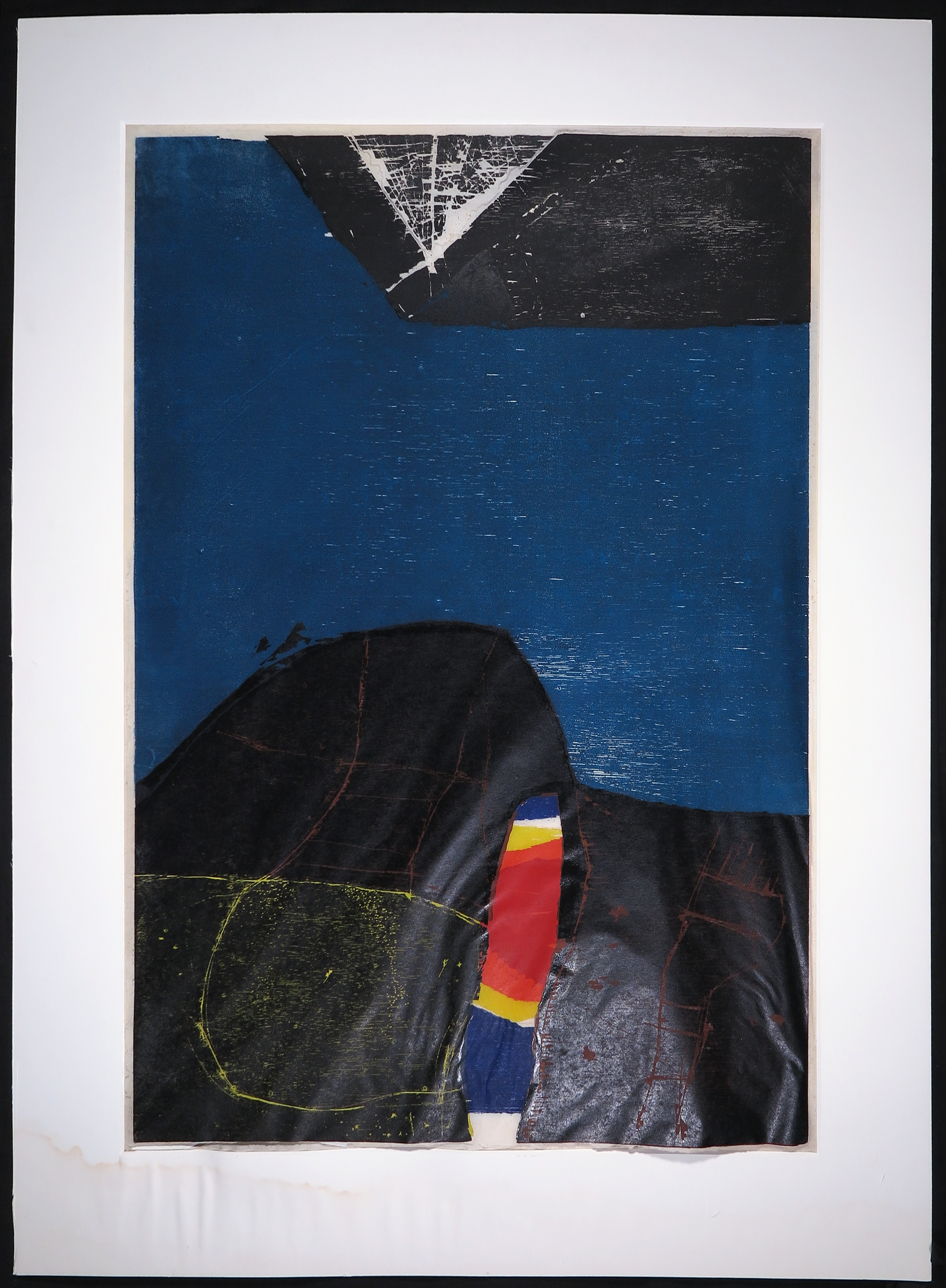 | Het werk is zeer beschadigd, aan de bovenzijde is de driehoek (in het beeld) los van het werk en zit dit vast aan het passe-partout. Ook de onderzijde heeft een horizontale scheur. Ook zit er aan de linkerzijde een scheur in het blad. Het werk zit niet stevig om het passe-partout. Daarnaast bevat het passe-partout aan de onderzijde een horizontale grote vochtvlek. | |