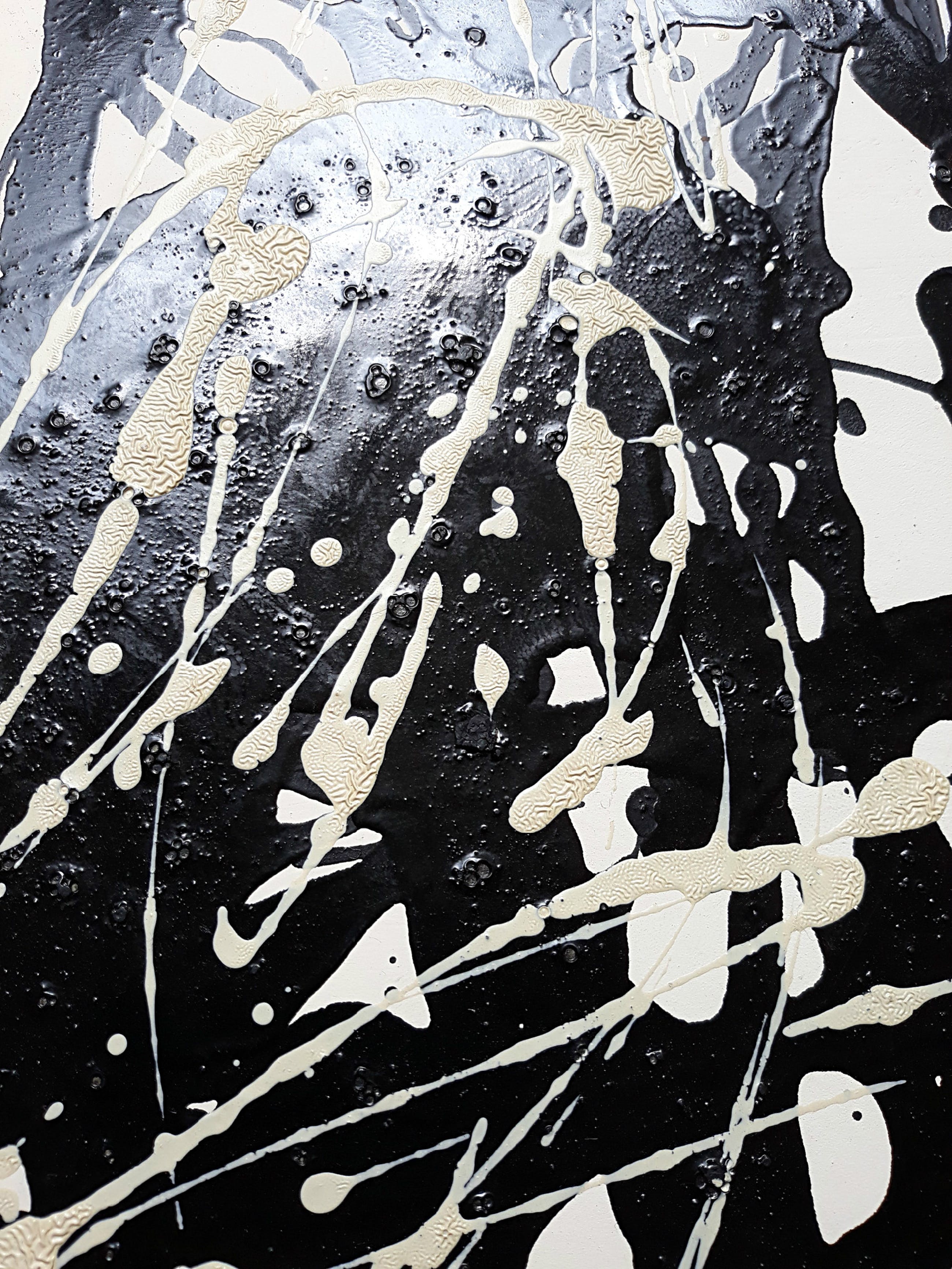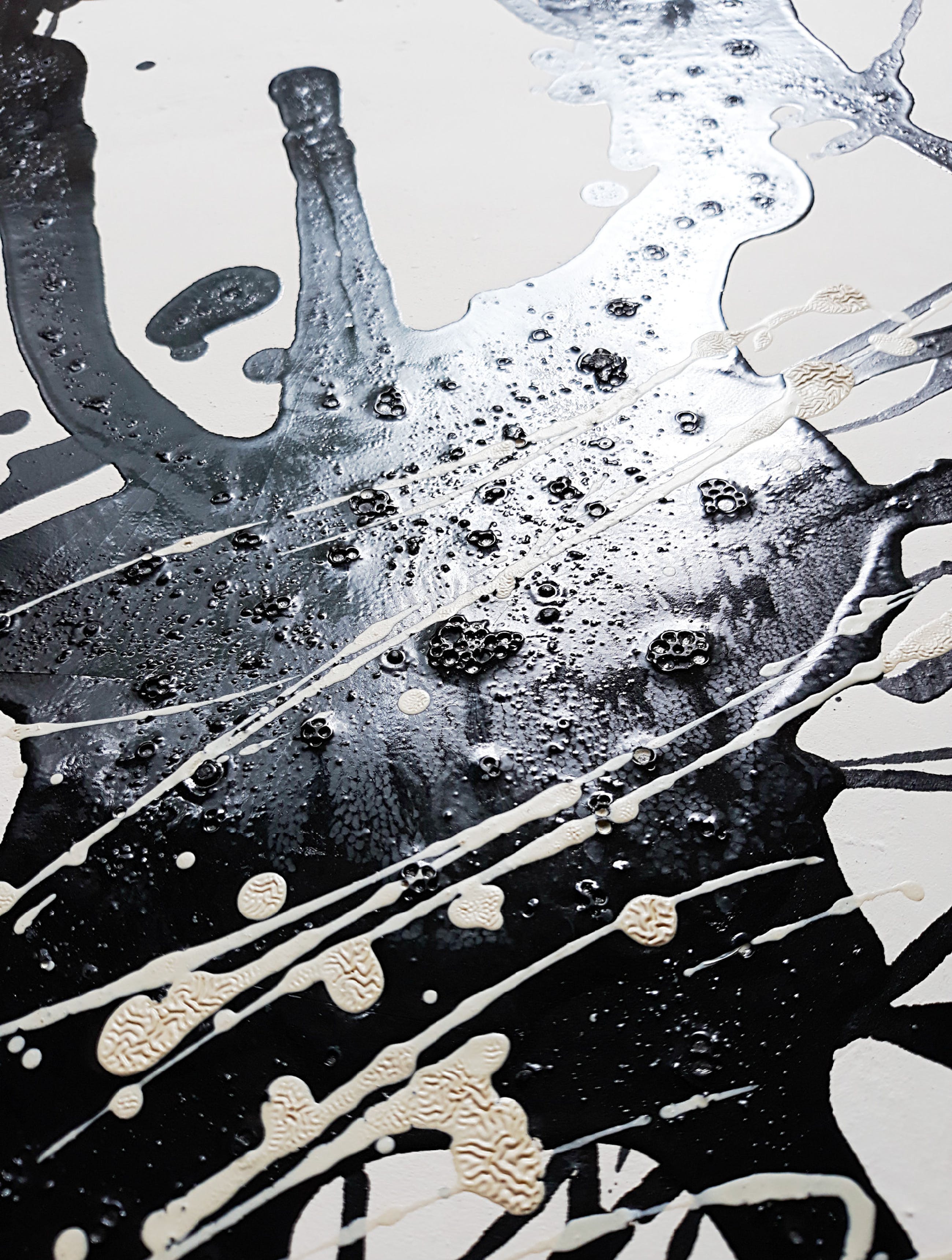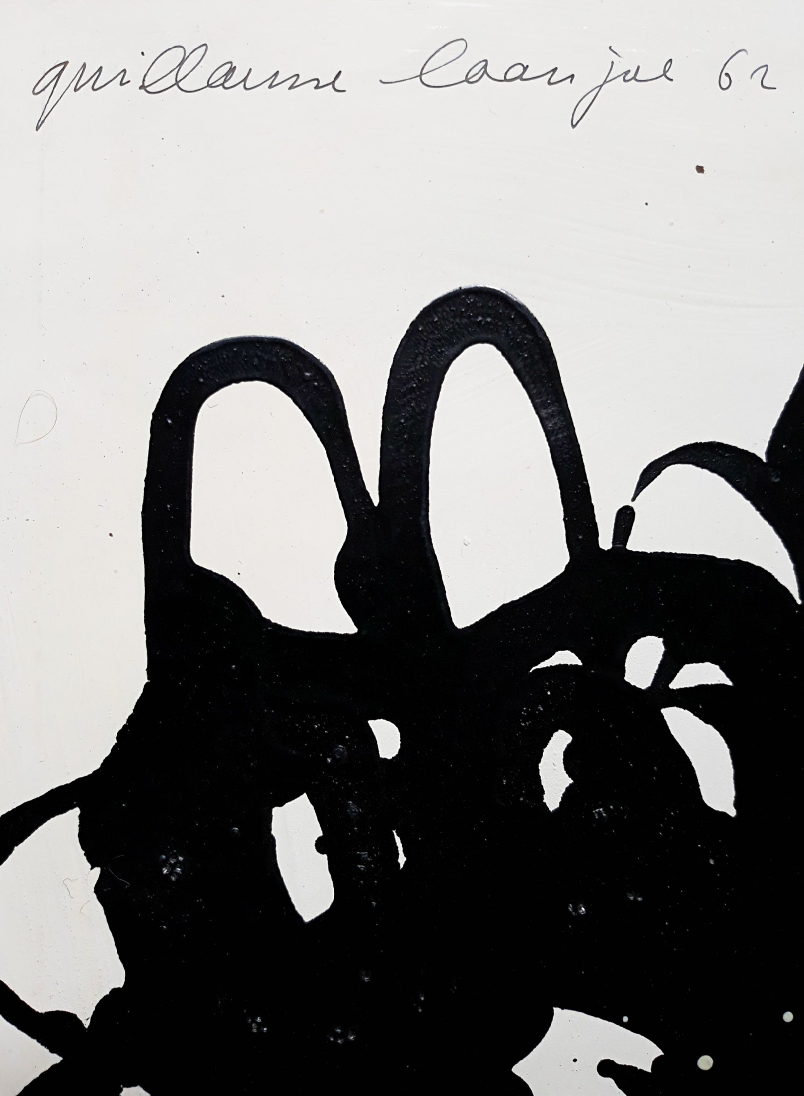 Zeer los en krachtig werk van Guillaume Lo-a-Njoe uit 1962(!). Zwart- en creme acrylverf op geprepareerd papier, met pen gesigneerd en gedateerd linksboven. De verf is zeer dik aangebracht, een soort drip painting in de Nederlands-Surinaamse polder. In goede conditie, in de onderste centimeter van het blad zitten wat vochtplekken maar die vallen niet echt op en zijn niet storend (naar mijn mening).
