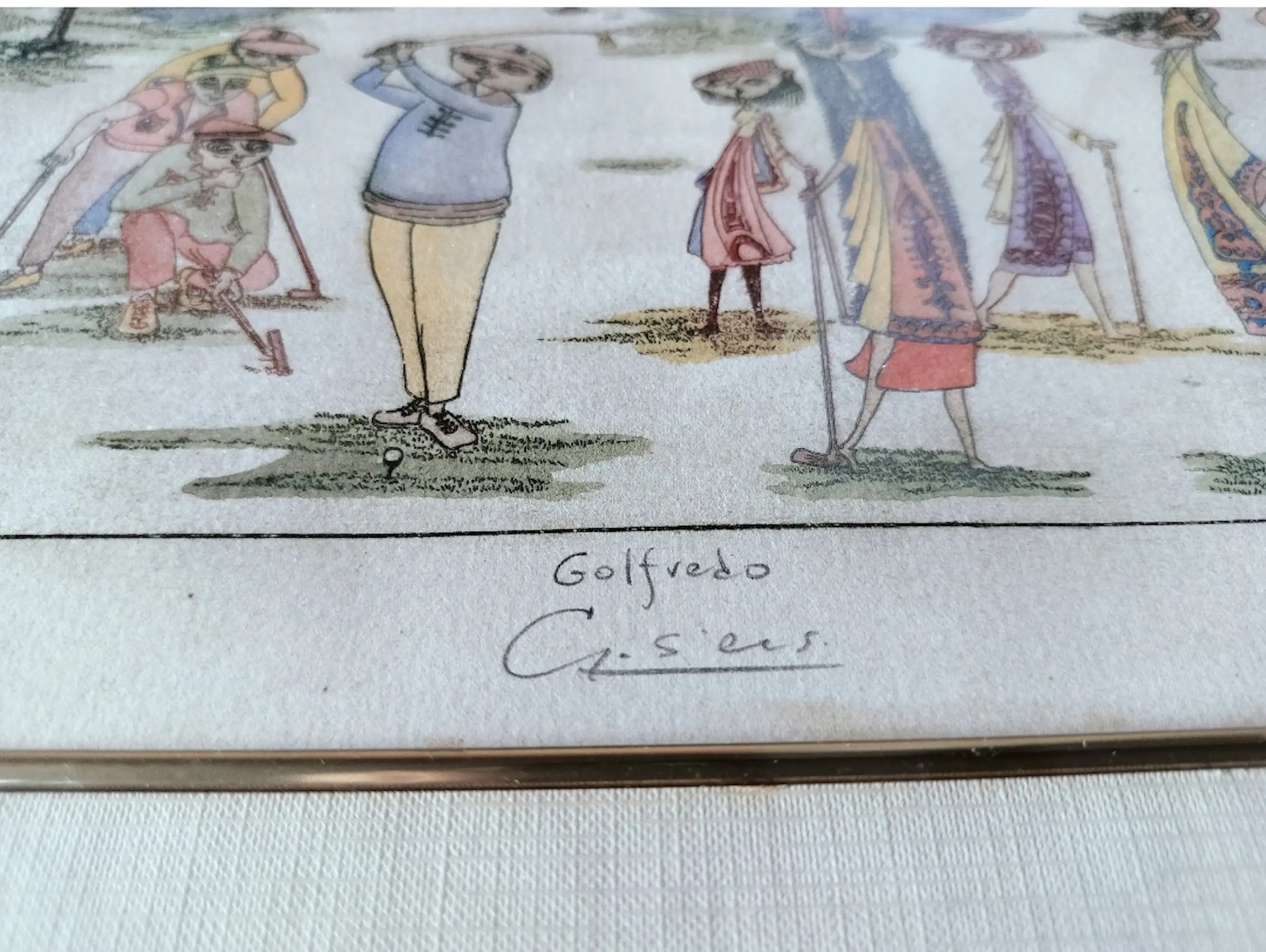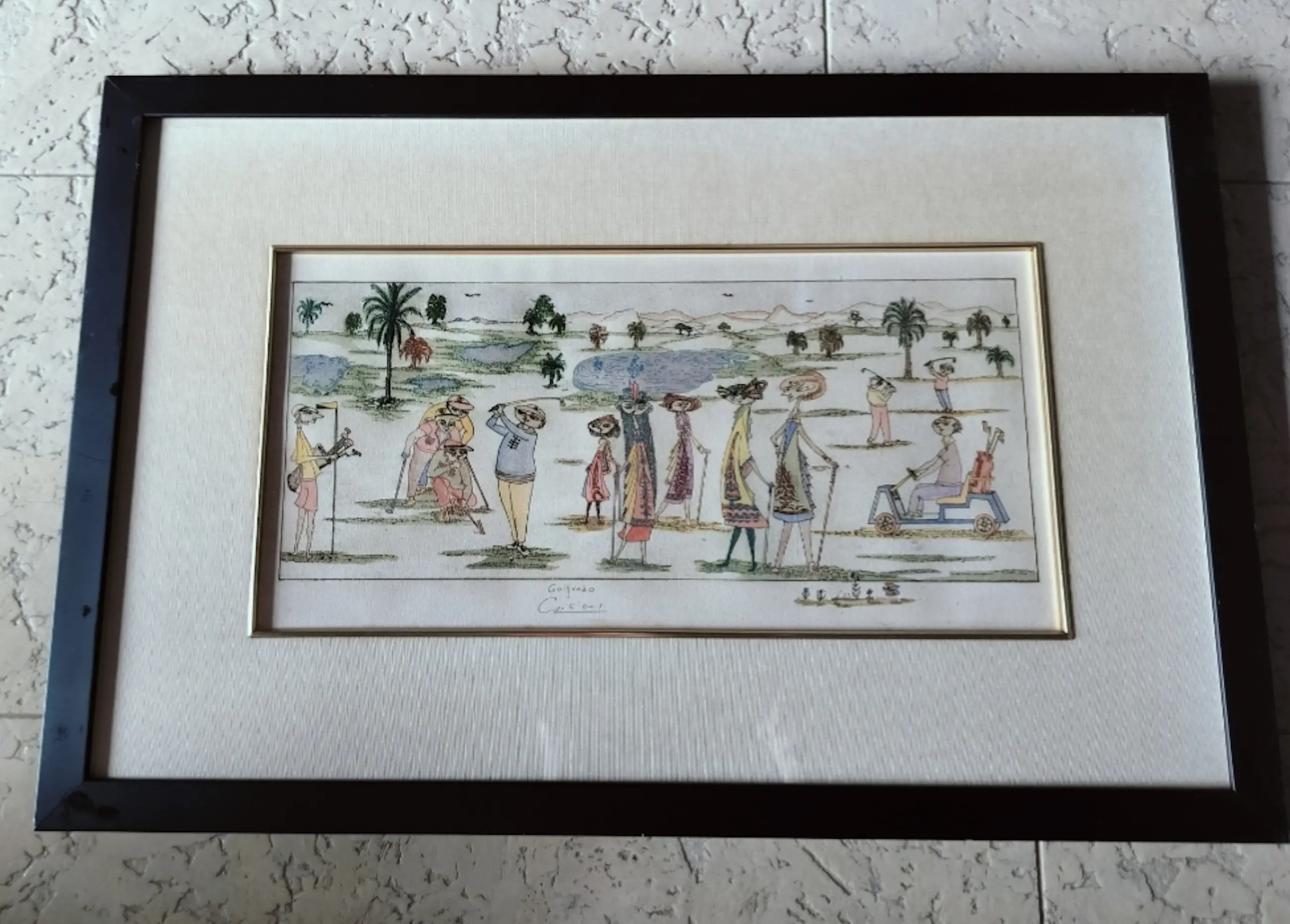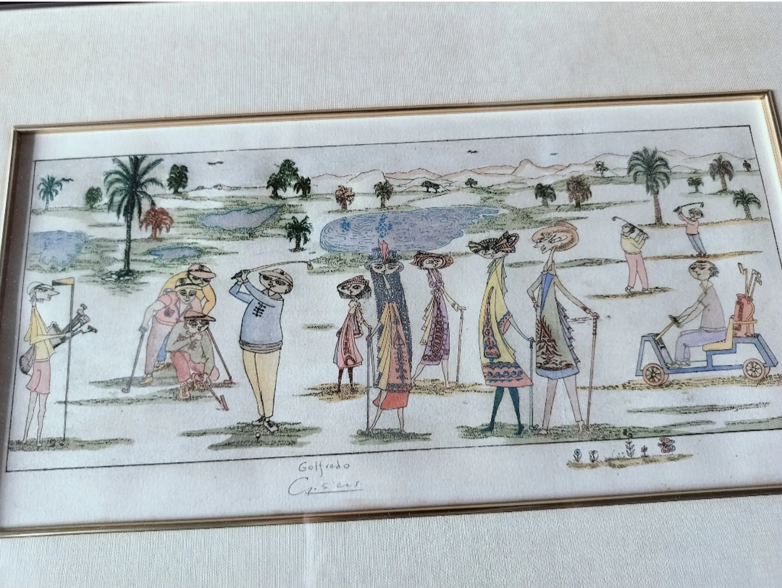 De kunstenaar van deze litho is waarschijnlijk Guillermo Silva Santamaria, die het werk de titel "Golfredo" heeft gegeven. De signatuur op de prent lijkt "Gofredo" te lezen, maar "Golfredo" is de naam die door de kunstenaar zelf wordt gebruikt voor dit specifiek werk. Guillermo Silva Santamaria (1921–2007) was een prominente Colombiaanse surrealistische schilder, graficus en beeldhouwer. Hij stond bekend om zijn innovatieve technieken. Zijn werken werden tentoon gesteld op vier continenten. Het kunstwerk is een kleurenlithografie en stelt een scène op een golfbaan voor met karikaturale figuren, welke langgerekt en kleurrijk zijn. De stijl is kenmerkend voor de Colombiaanse kunstenaar. Het werkt dateert waarschijnlijk uit de jaren 60/70. De inlijsting van het kunstwerk: Een brede, donkere/zwarte lijst omlijst het geheel. Daarbinnen bevindt zich een dikke crèmekleurige passe-partout die het kunstwerk omringt en accentueert. Tussen de passe-partout en het kunstwerk is er een dunne, goudkleurige bies zichtbaar die een extra detail toevoegt aan de presentatie.