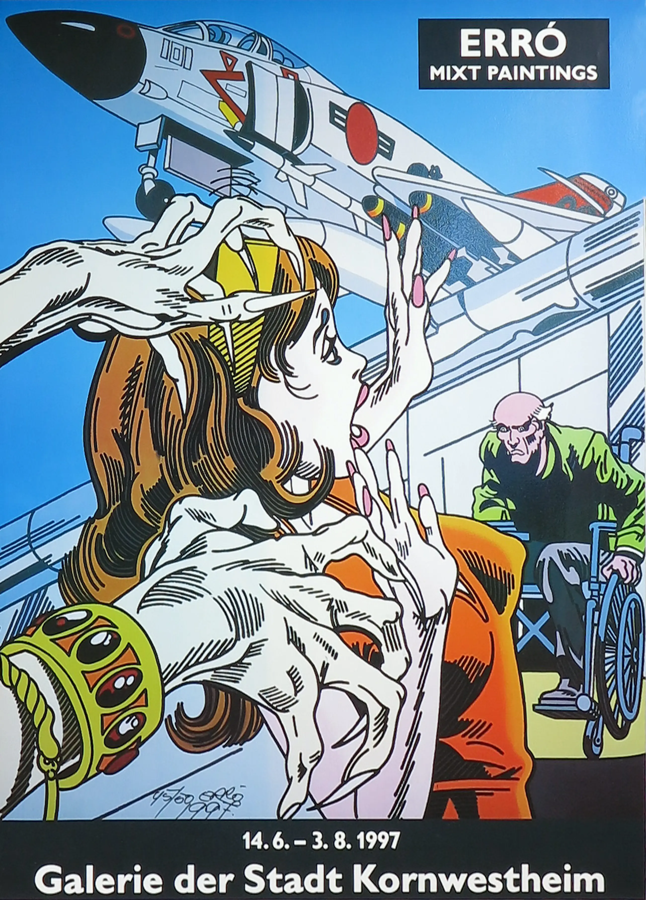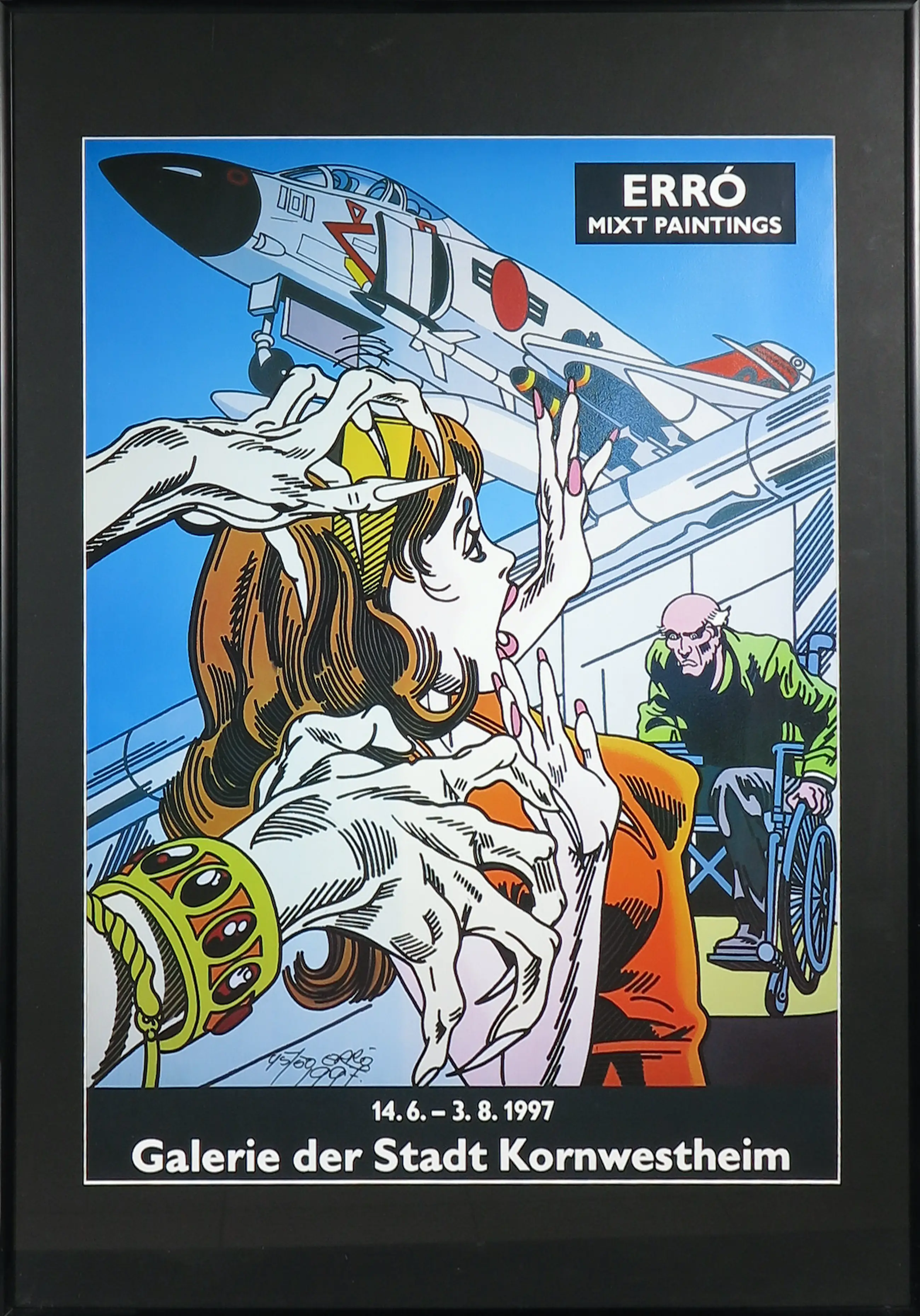 Typische Erró-voorstelling in stripachtige stijl met veel verzadigde kleuren. Uitgegeven voor een tentoonstelling in Galerie der Stadt Kornwestheim (D) Het werk is aan de onderzijde met stift gesigneerd en gedateerd.