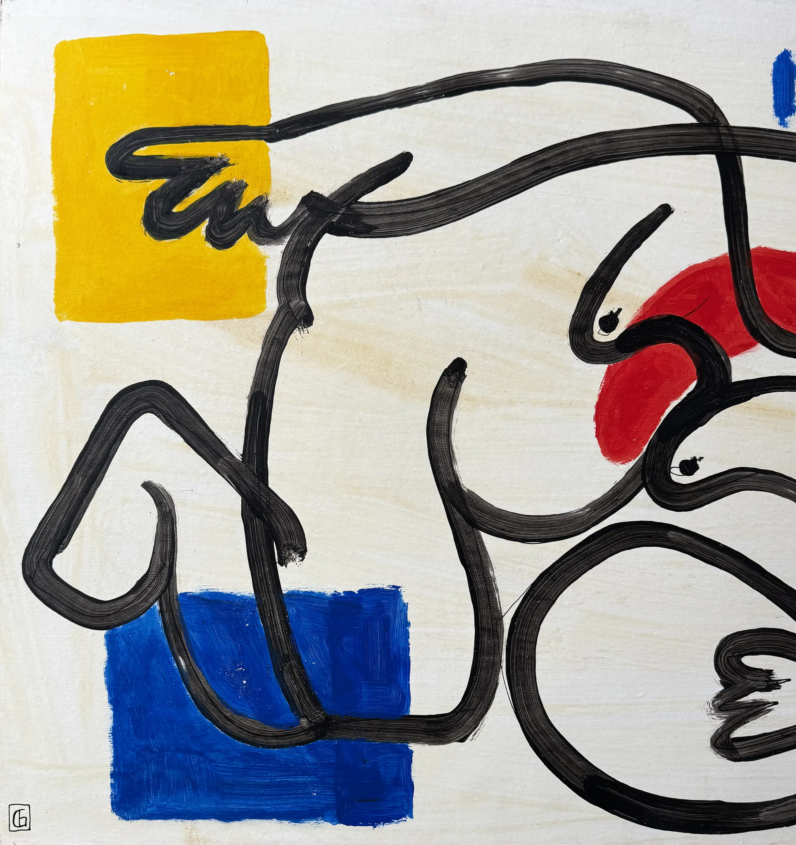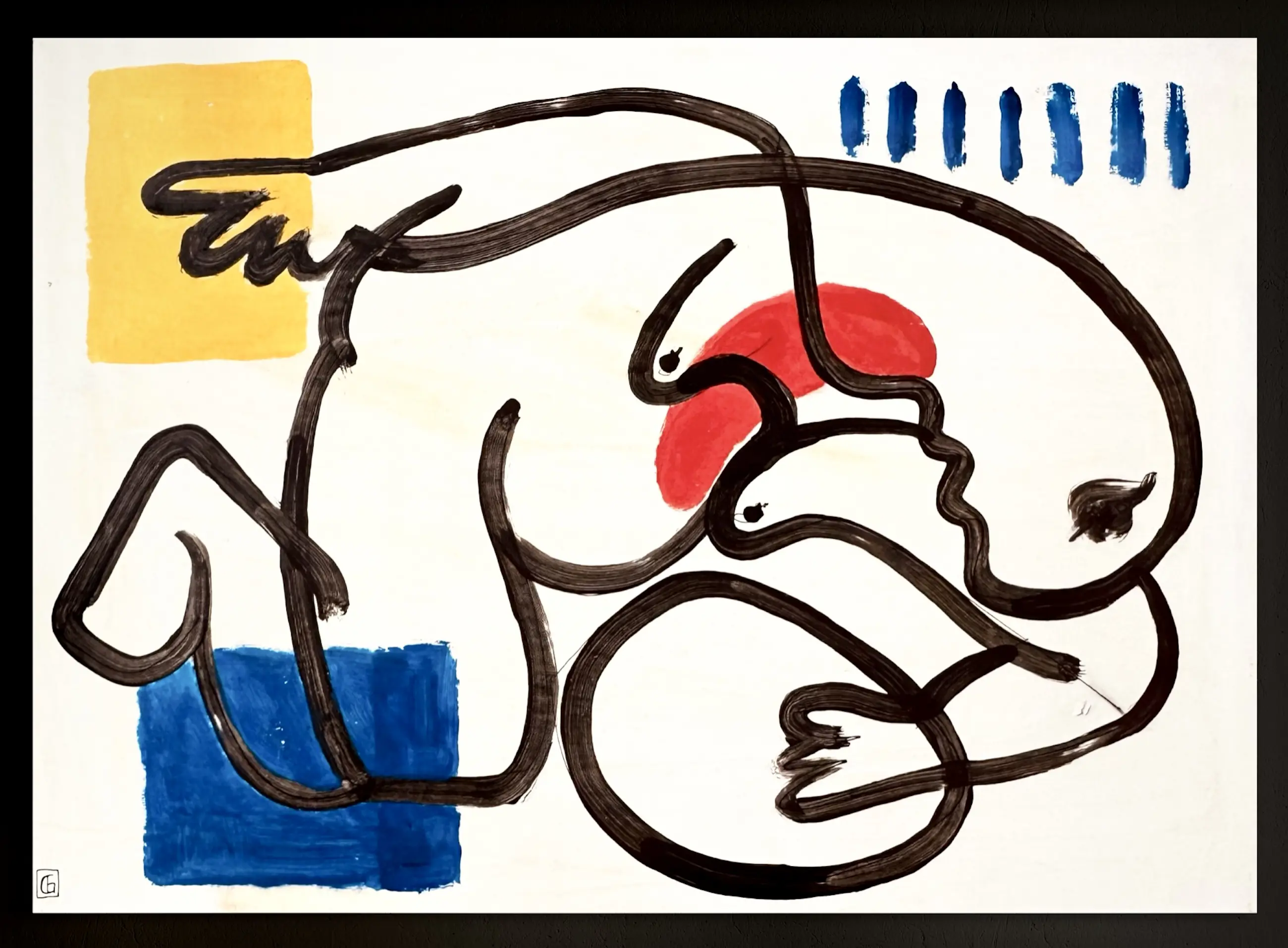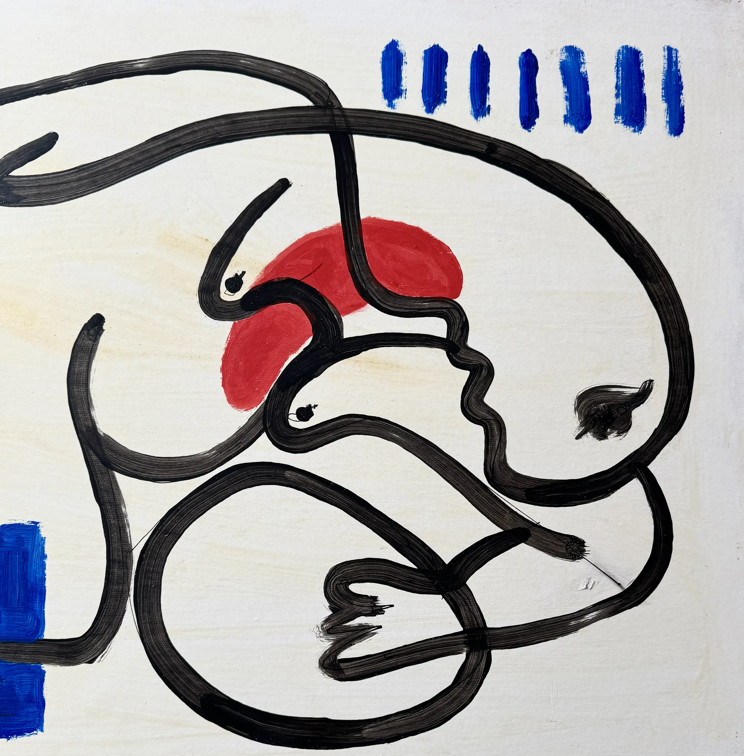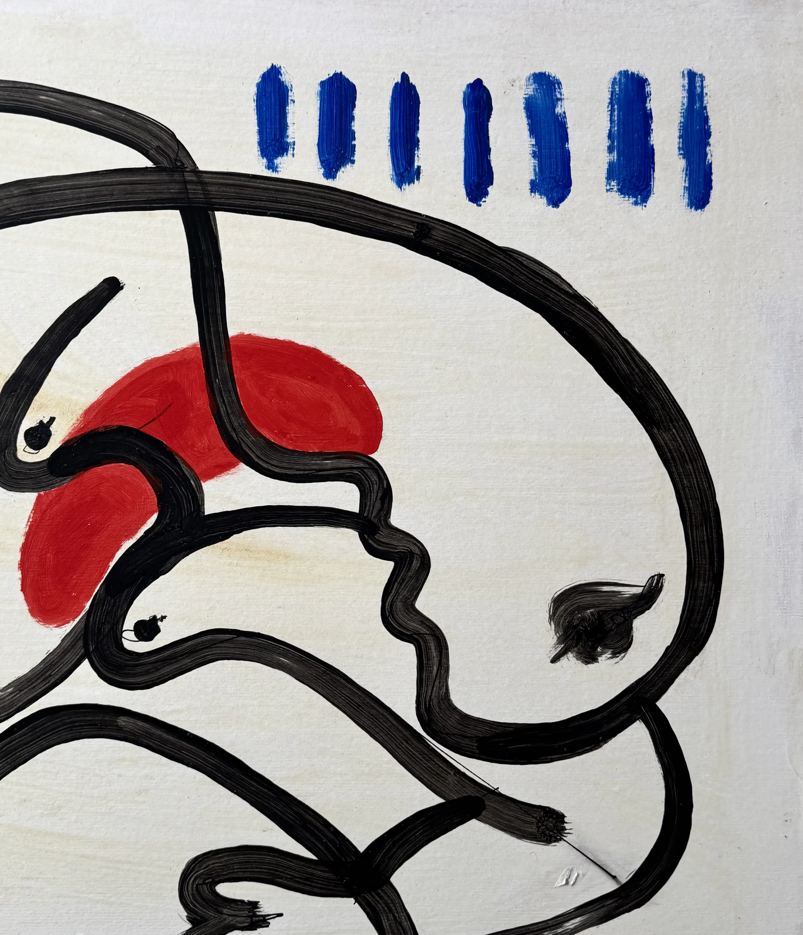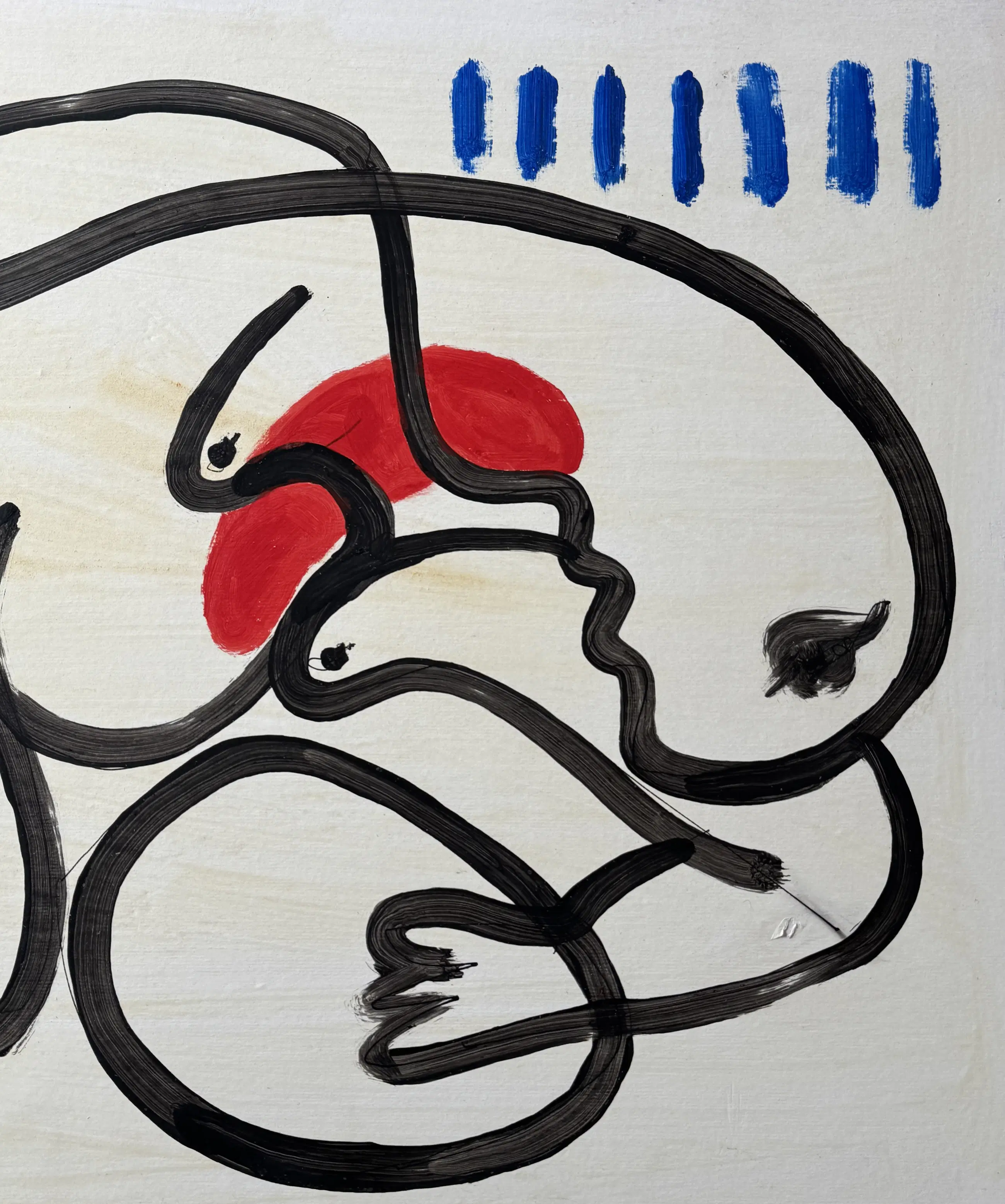 Dit schilderij op paneel, gemaakt in het begin van de jaren 2000, illustreert op krachtige wijze Gundi Falks unieke beeldtaal. De compositie is gestructureerd door een doorlopende, brede en gecontroleerde zwarte lijn die het oppervlak doorkruist en organische vormen creëert die doen denken aan profielen, gefragmenteerde lichamen of figuren in transformatie.