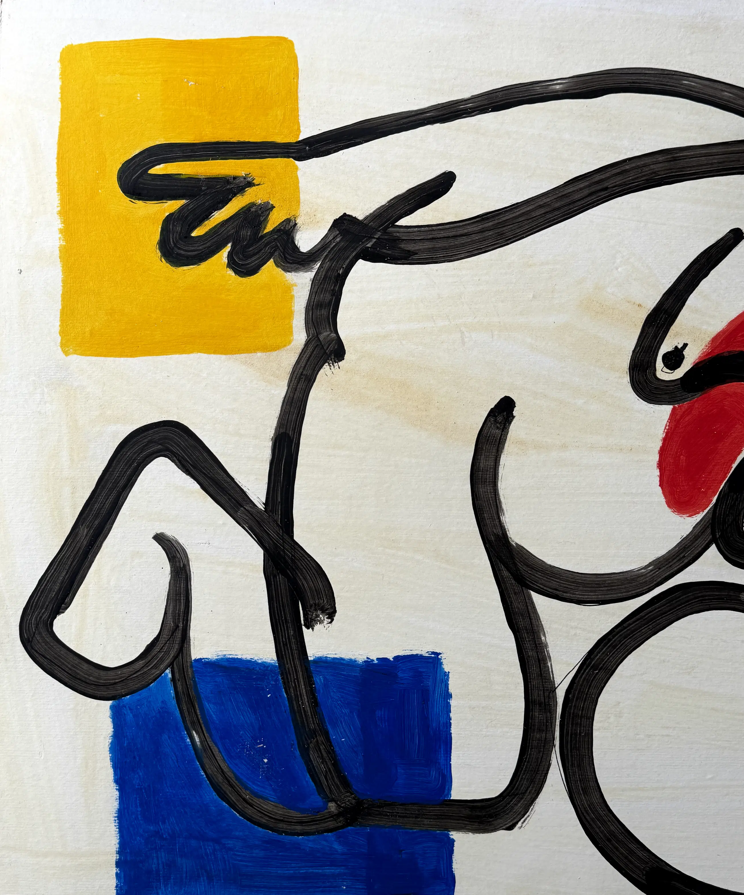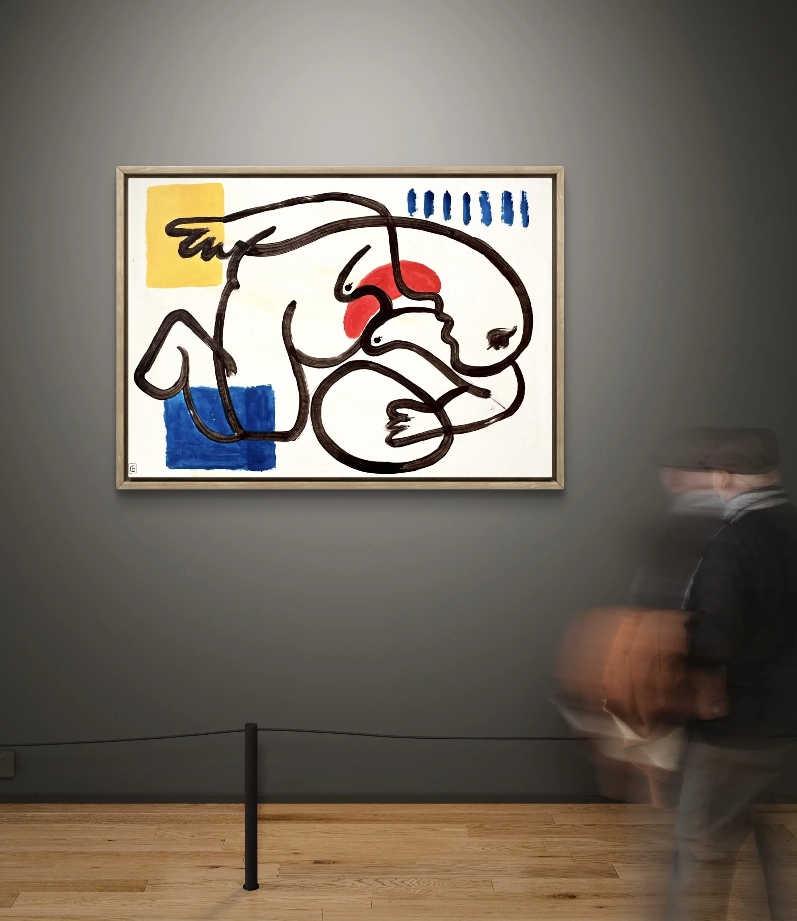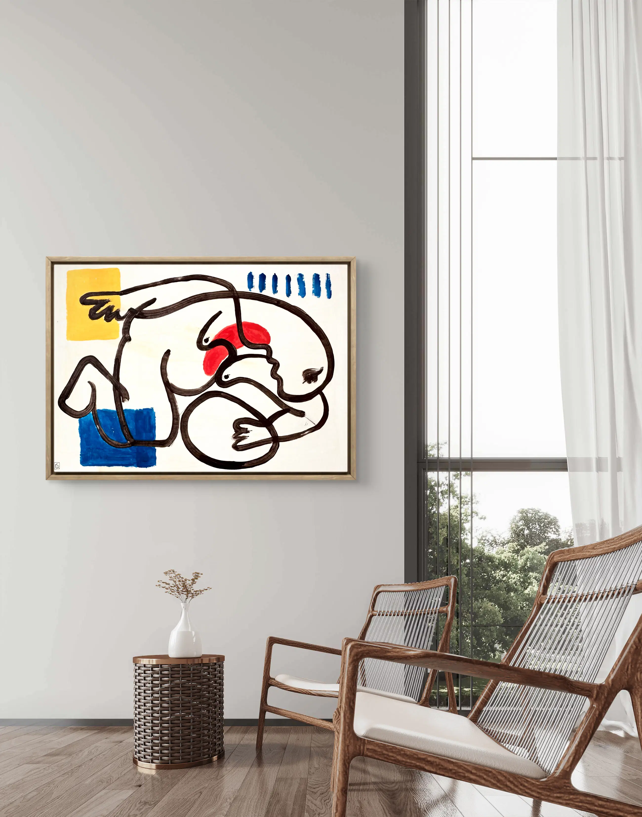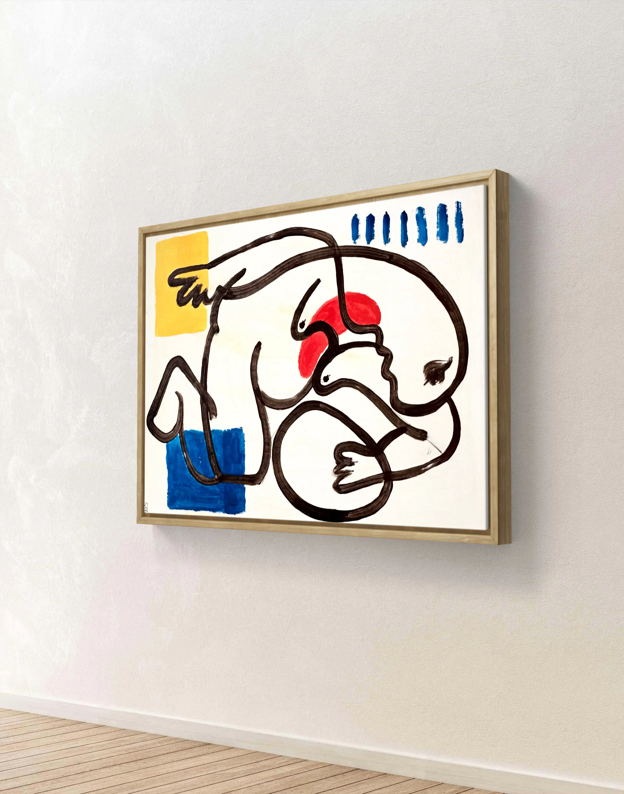 Blokken primaire kleuren – blauw, rood en geel – markeren de ruimte met precisie. Ze creëren een visueel ritme en een gevoel van ademruimte binnen de compositie, terwijl ze tegelijkertijd een wisselwerking aangaan met de neutrale achtergrond. Hier fungeert kleur als een teken, een visueel en mentaal ankerpunt.