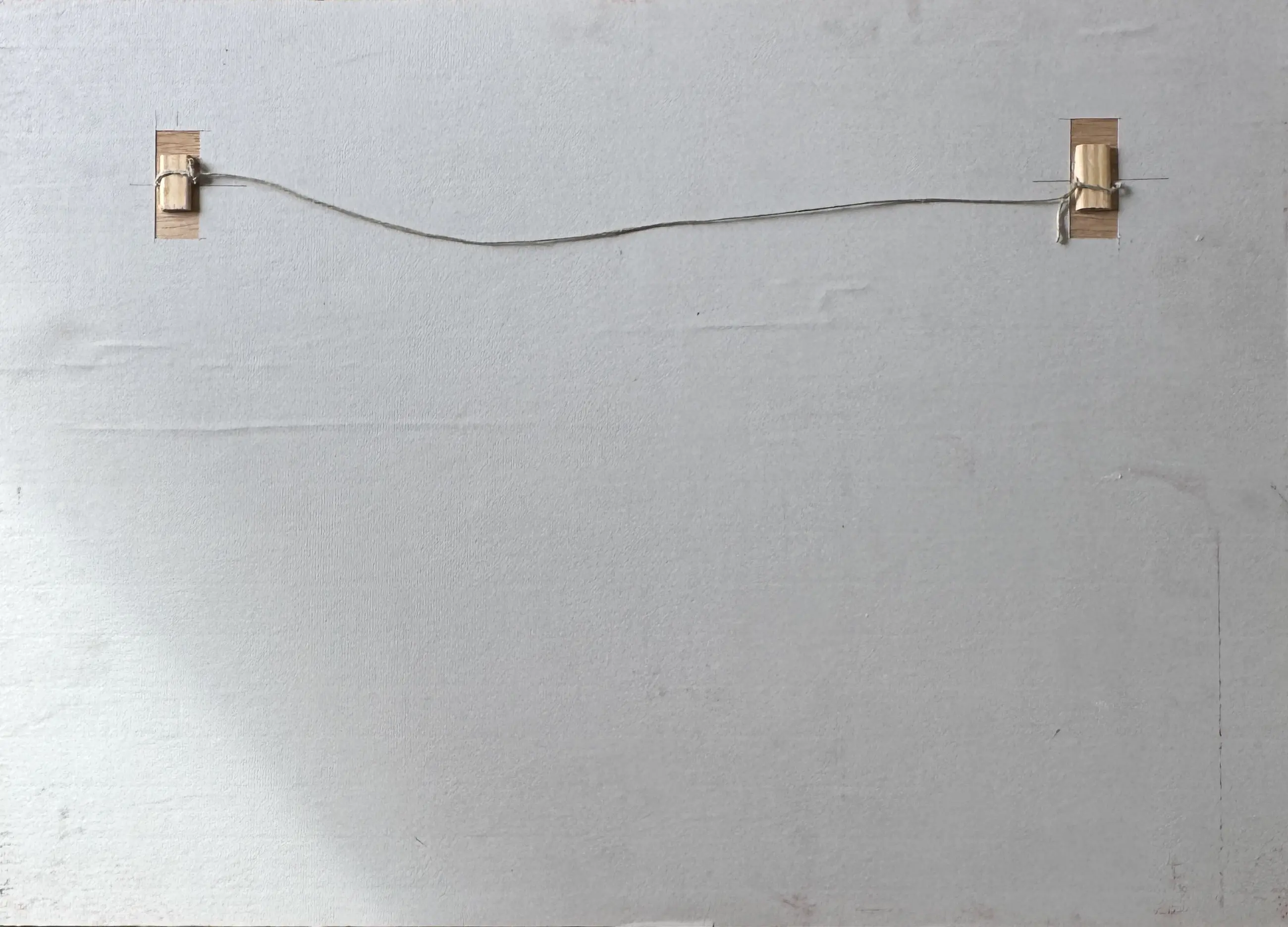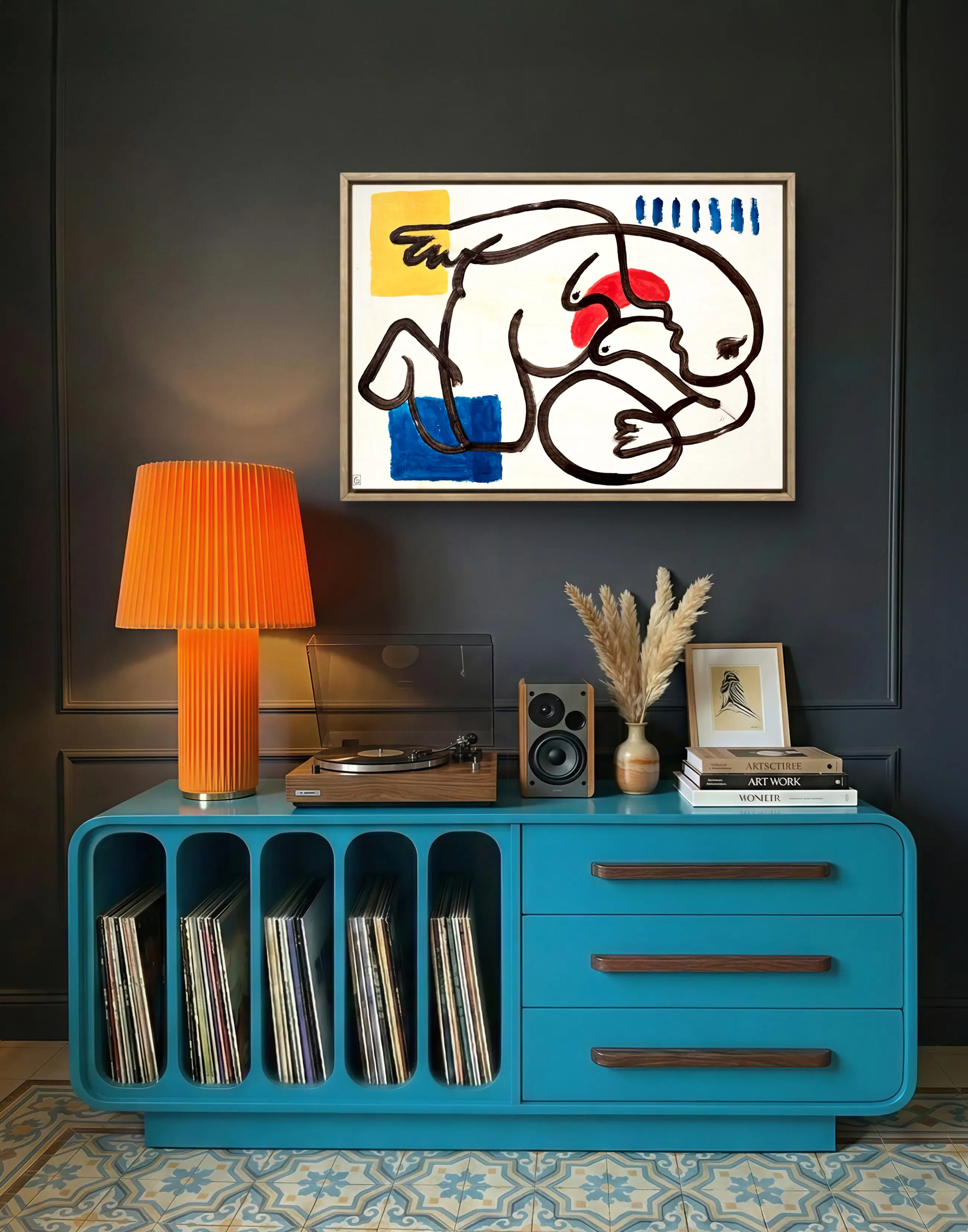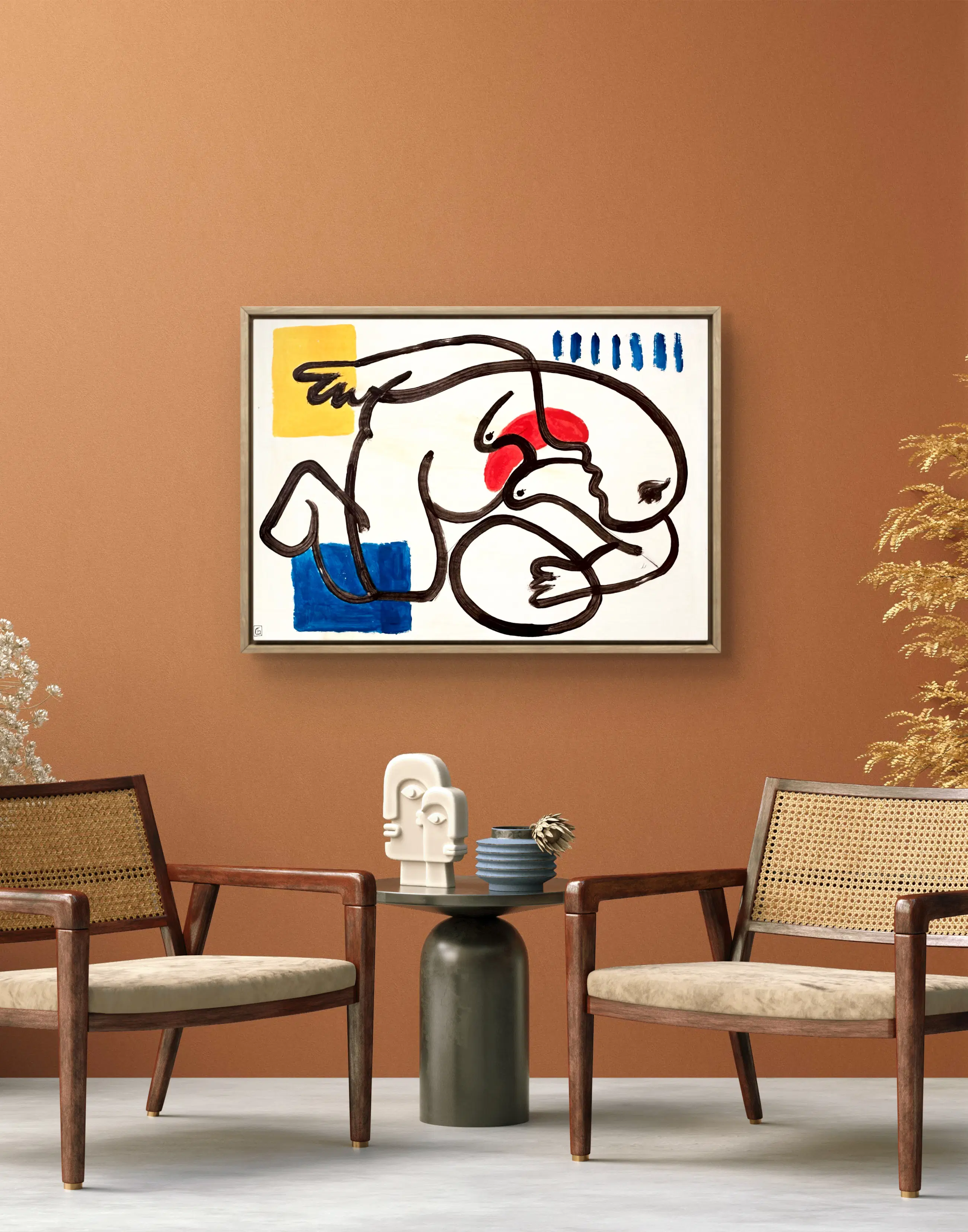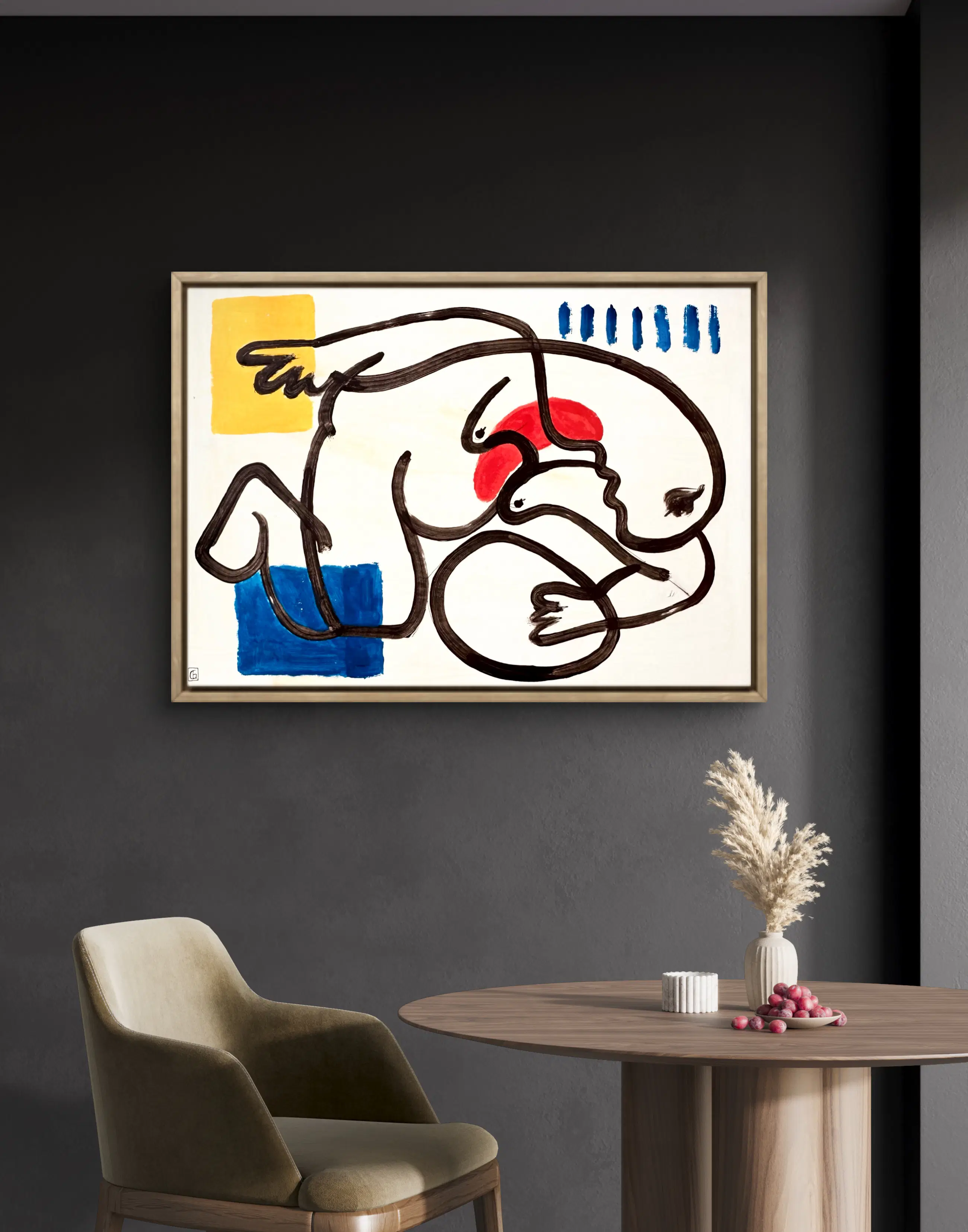 Blokken primaire kleuren – blauw, rood en geel – markeren de ruimte met precisie. Ze creëren een visueel ritme en een gevoel van ademruimte binnen de compositie, terwijl ze tegelijkertijd een wisselwerking aangaan met de neutrale achtergrond. Hier fungeert kleur als een teken, een visueel en mentaal ankerpunt.