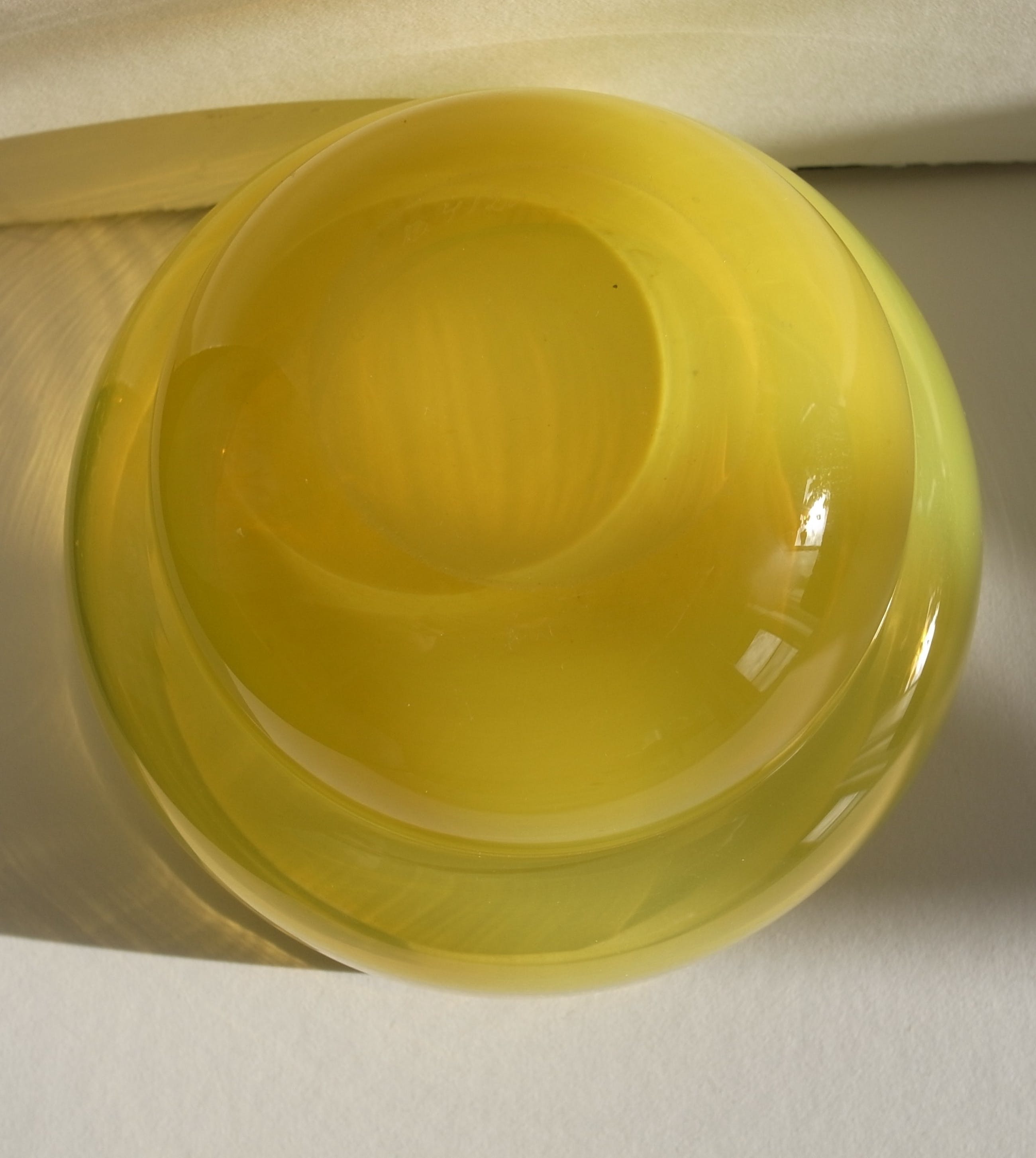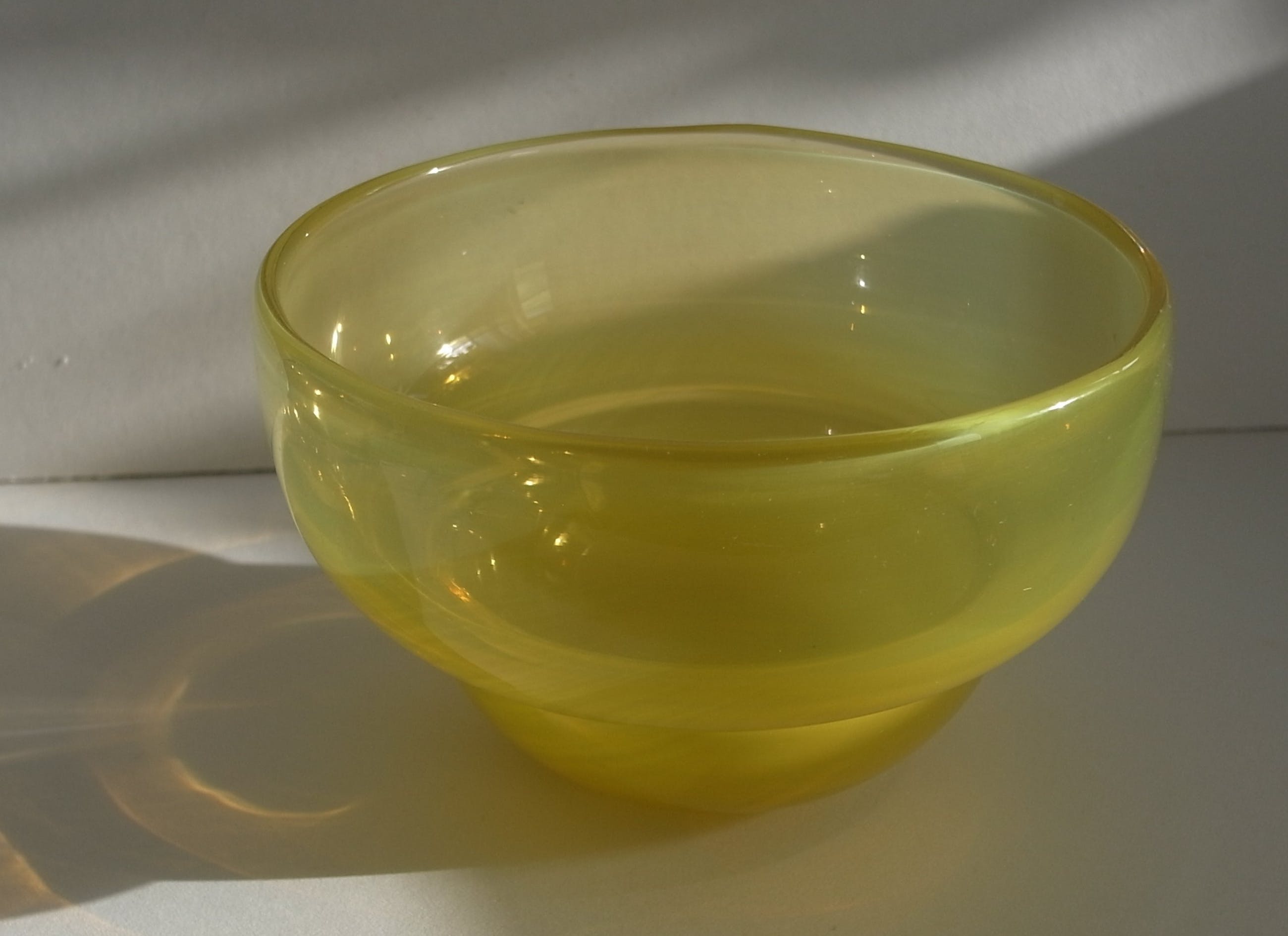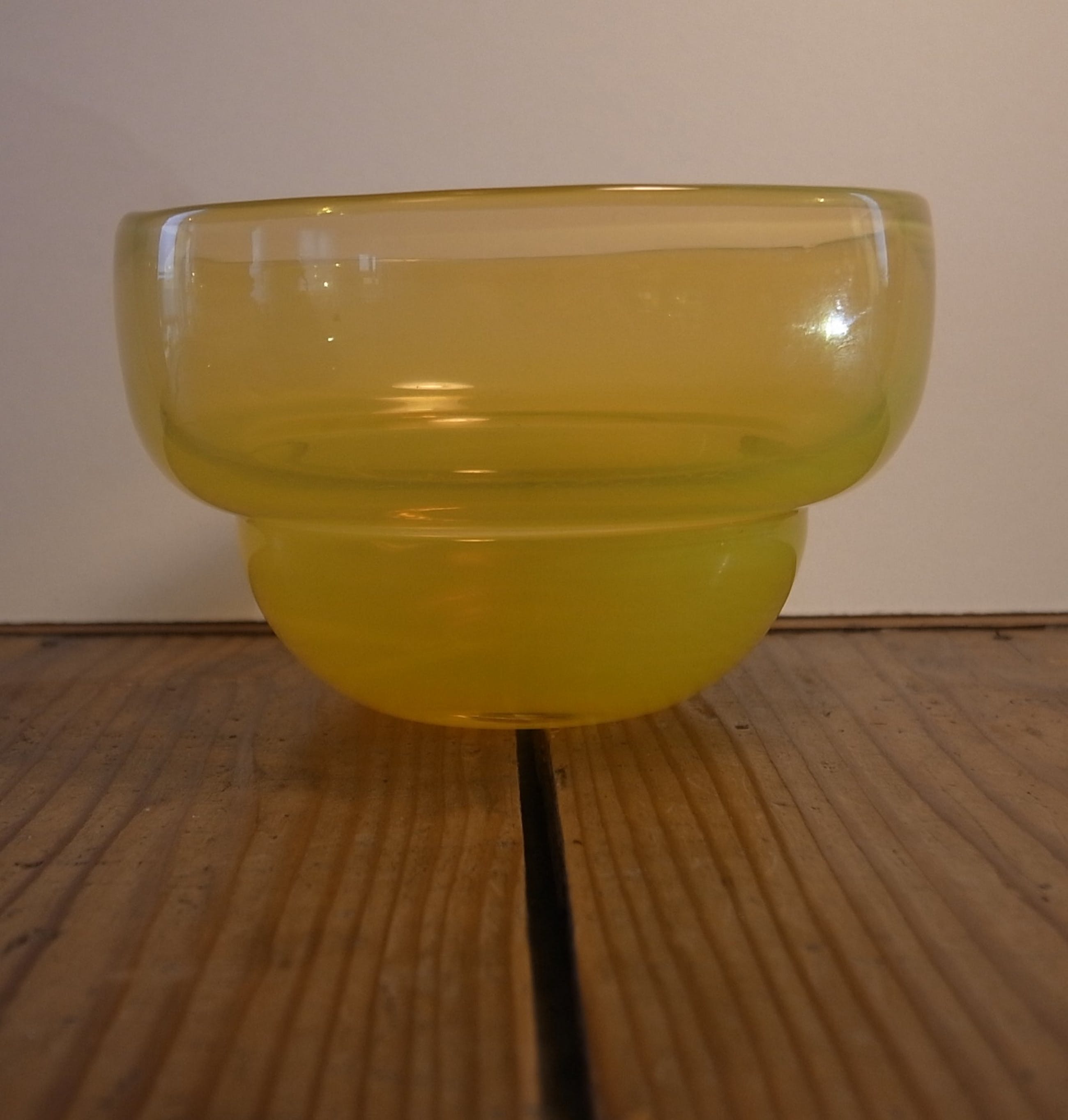 Robuuste ronde geel-glazen schaal met verdieping, in herkenbare jaren-60 stijl. Ontwerper: Gunnar Cyren voor Orrefors, Zweden. Signatuur Gunnar Cyren (moeilijk leesbaar) en nummer B 4125-114 ge-etst in onderkant.