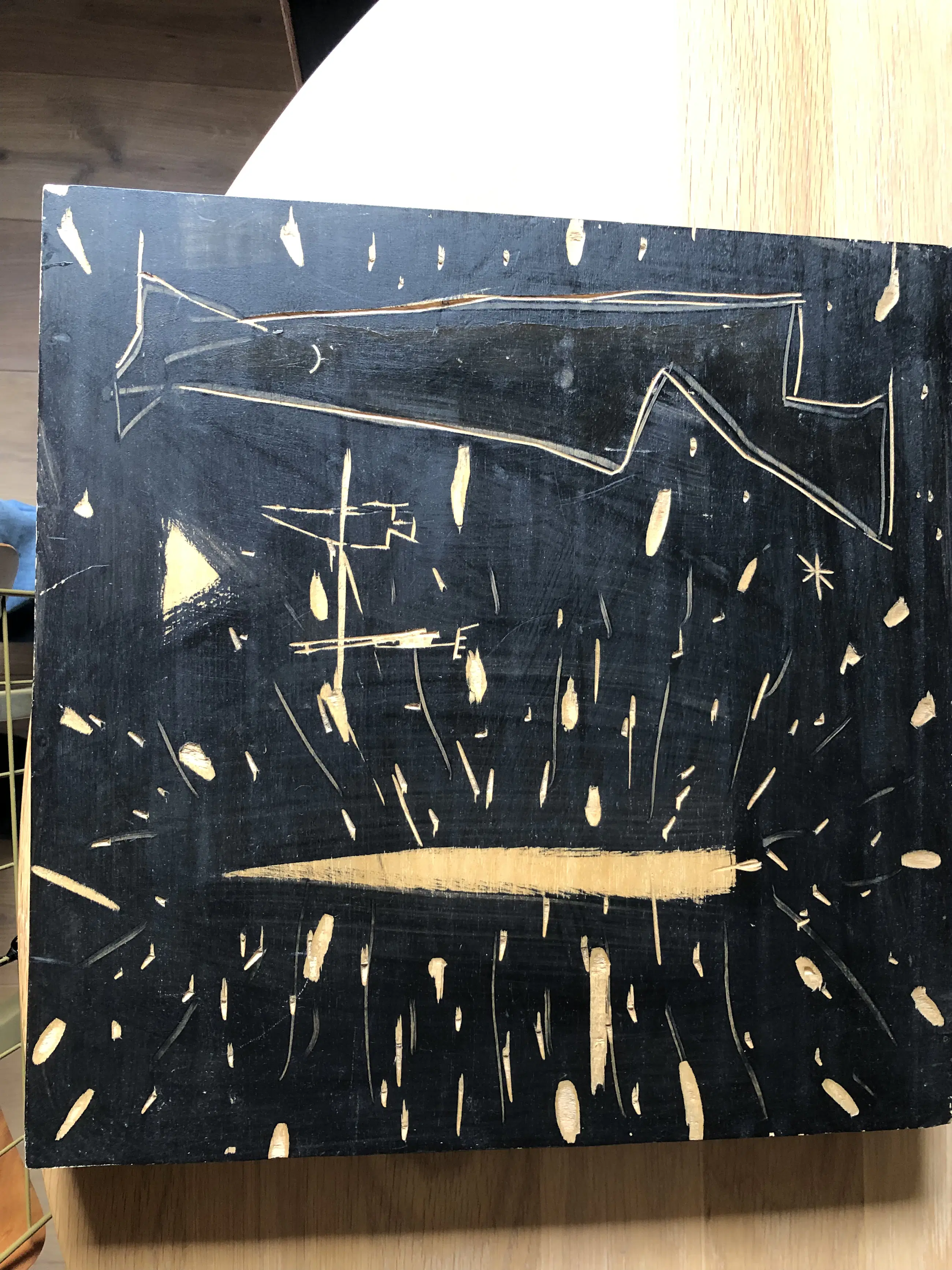 Werk van G. Damisch uit '92. Ongetiteld. Gemengde technieken op papier. Gesigneerd en geframed. Uit een serie van 20, nummer 20, allemaal in houten box. Deze houten doos heeft hij destijds beschilderd en aan de voorkant gekerfd.