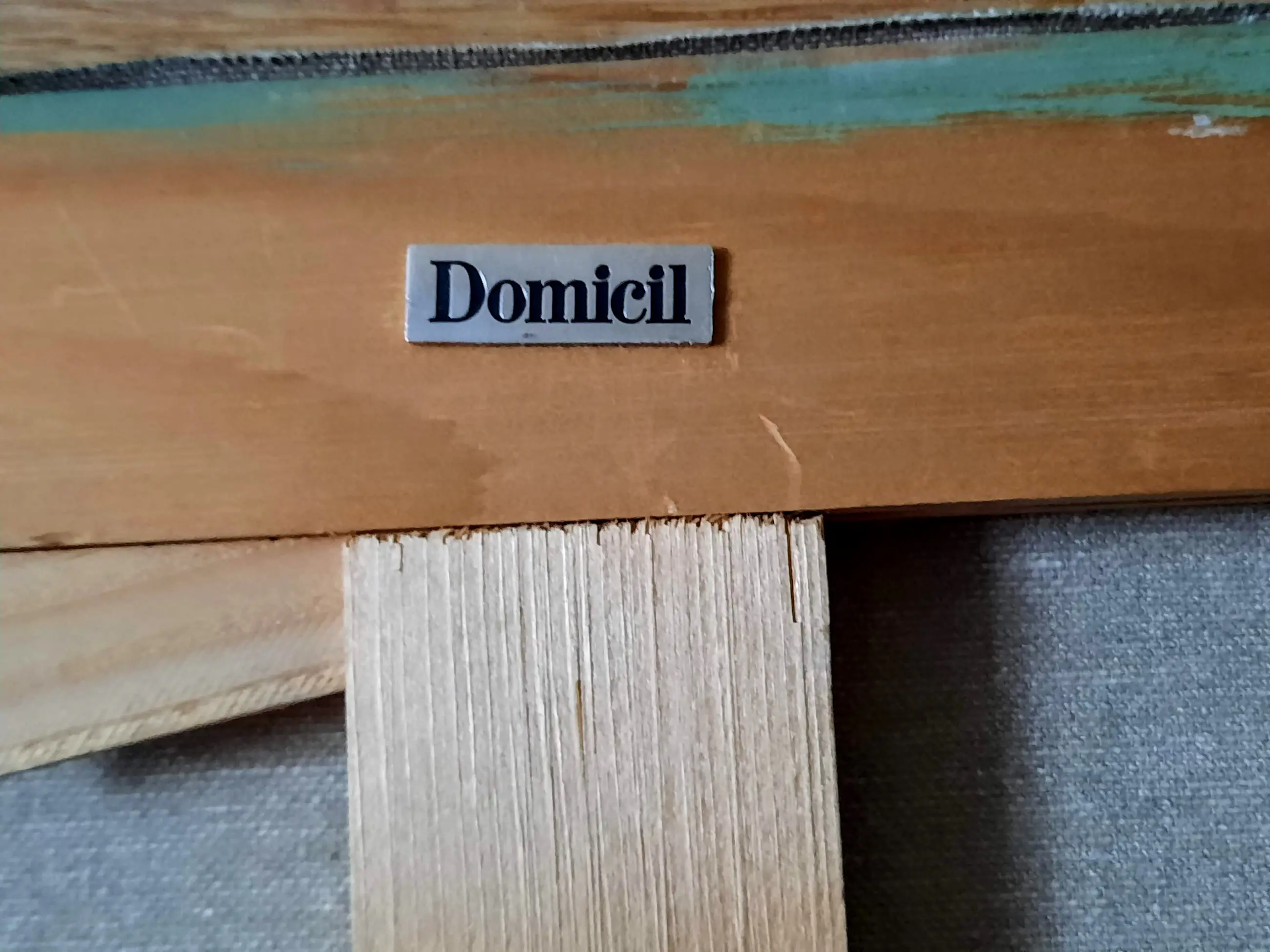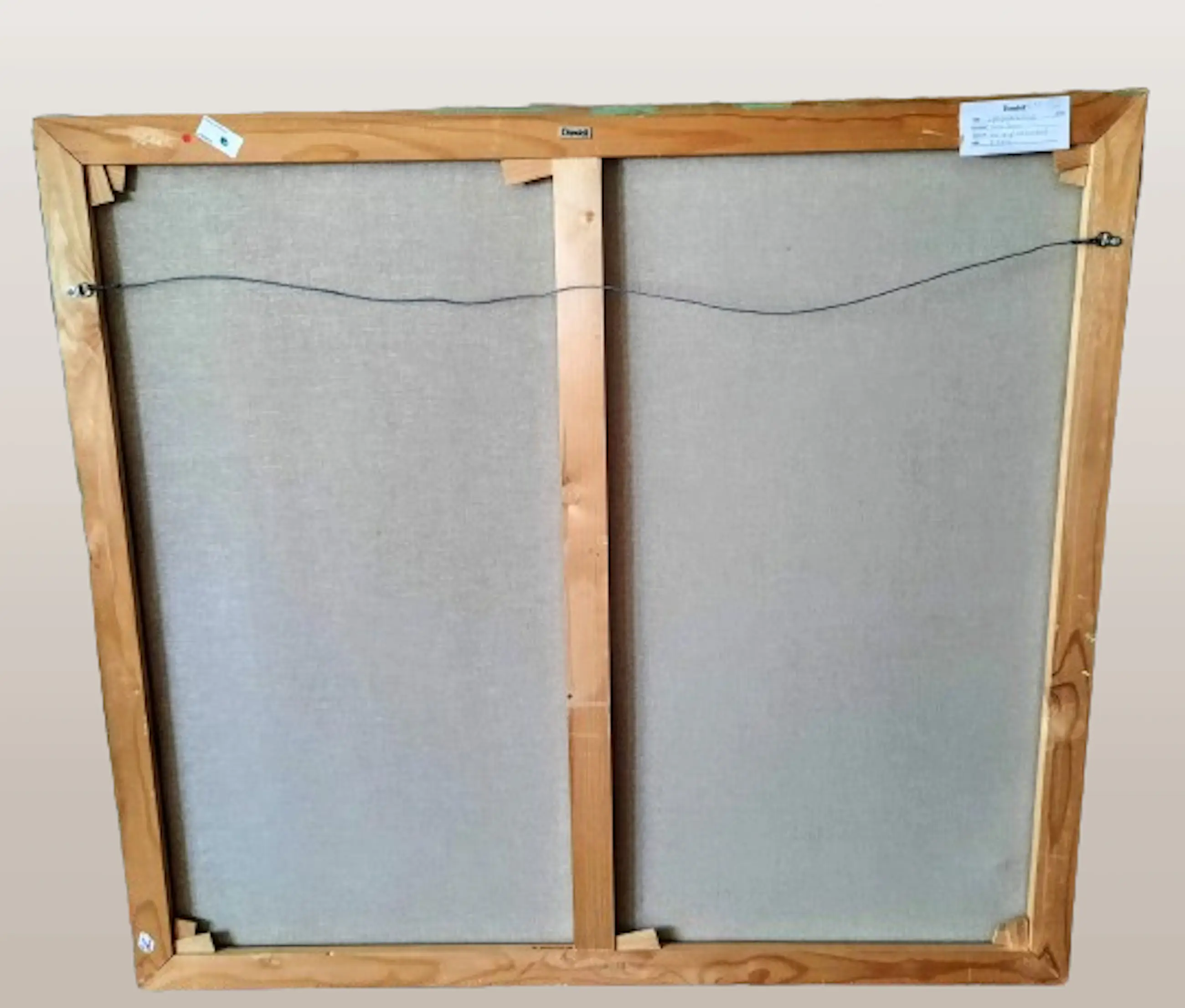 Het schilderij is niet ingelijst, heeft alleen een spieraam met een verticale versteviging in het midden en komt uit de Galerie Domicil -