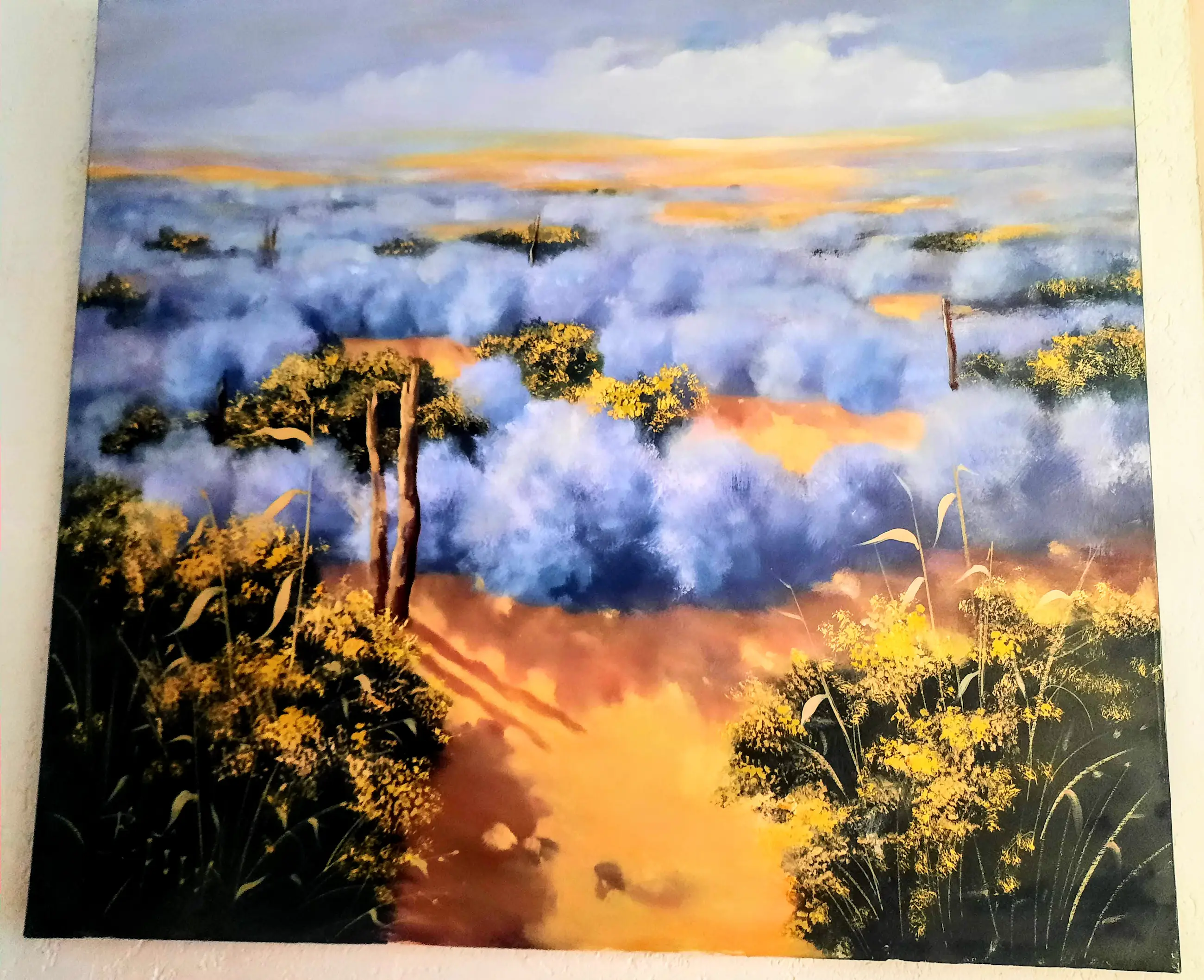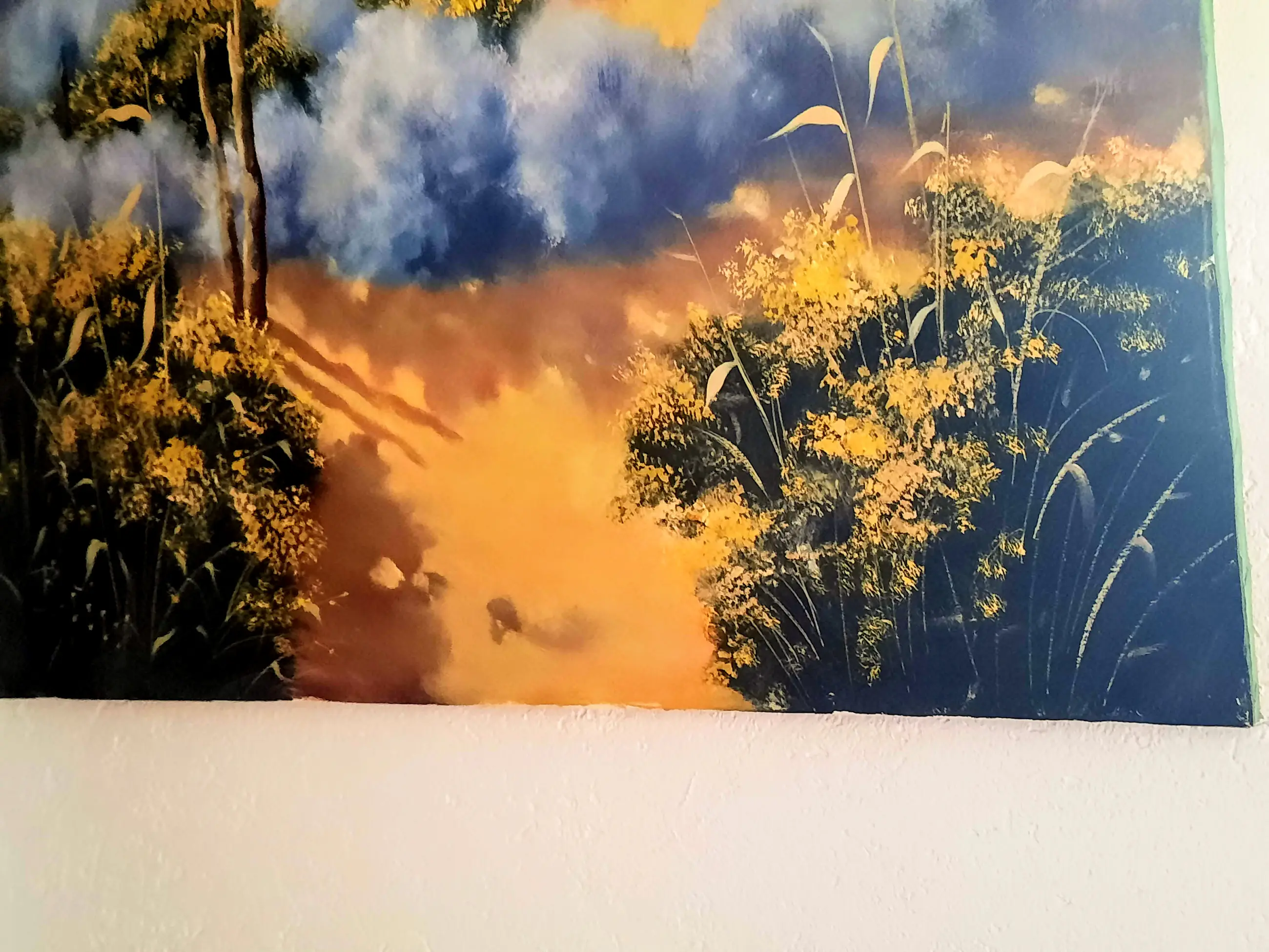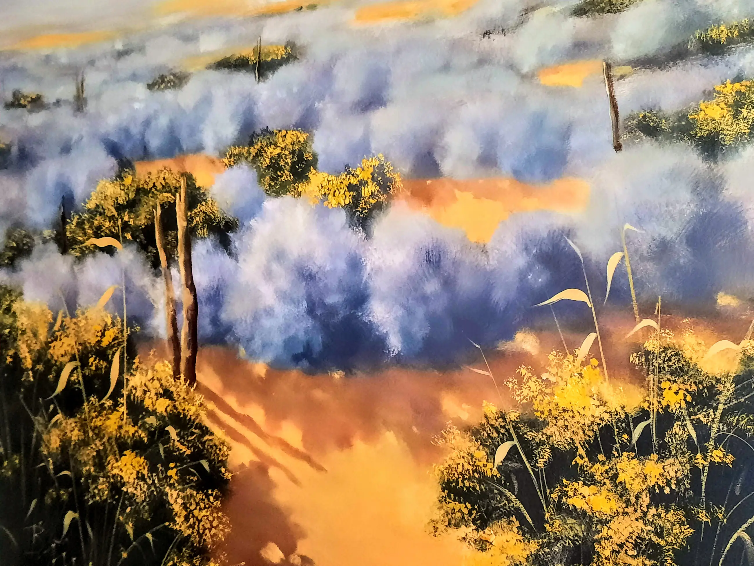 Het schilderij is geschilderd in impressionistische stijl, en in de kleuren blauw, zwart en aardse tinten met gele bloesems op de struiken en bomen -