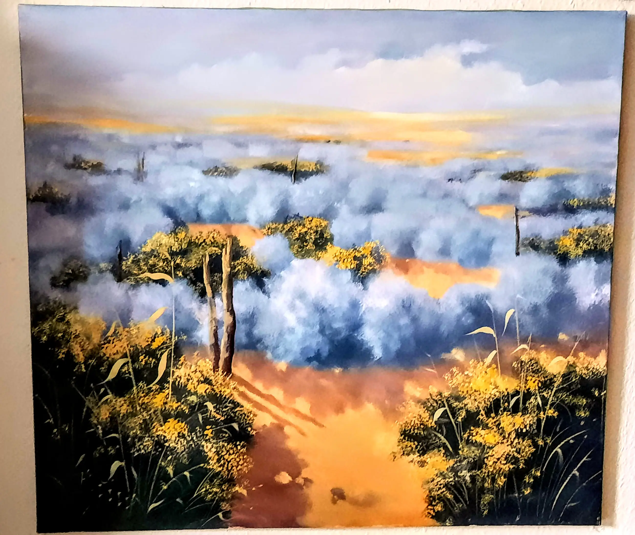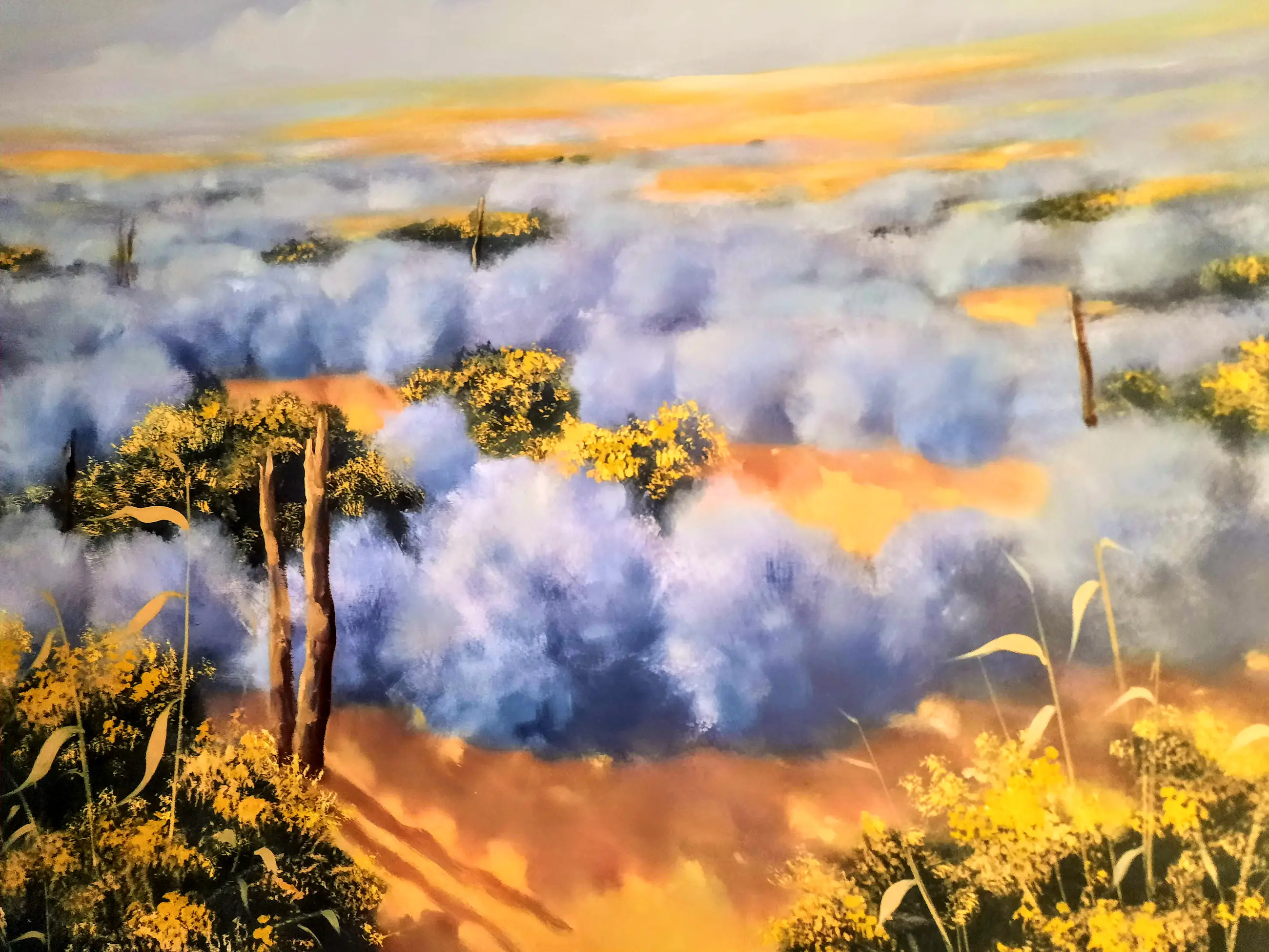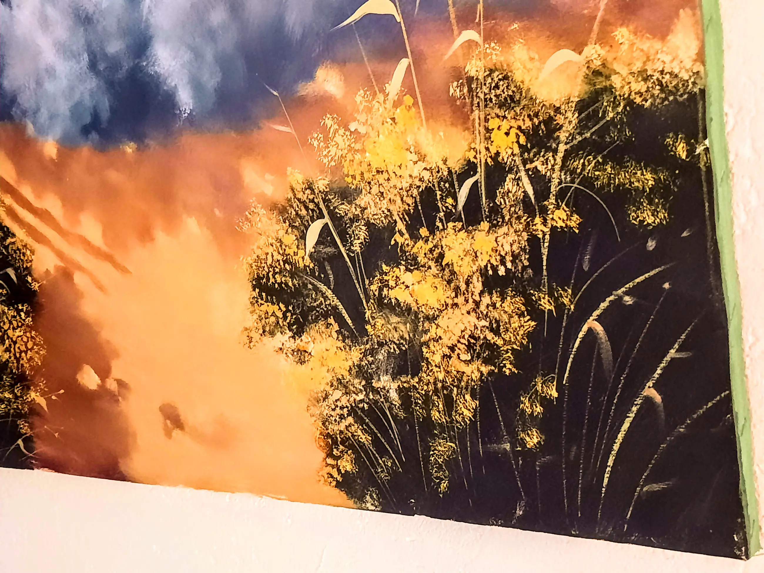Het schilderij is geschilderd in impressionistische stijl, en in de kleuren blauw, zwart en aardse tinten met gele bloesems op de struiken en bomen -