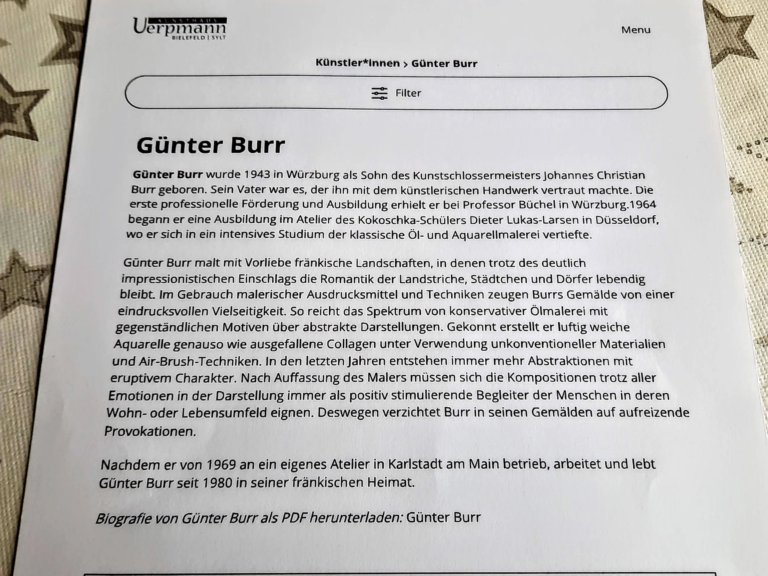 De kunstenaar Günter Georg Burr werd geboren in Würzburg in 1943, kreeg een artistieke opleiding van professor Büchel in Würzburg en werd verder opgeleid in het atelier van Kokoschka-student Dieter Lukas-Larsen in Düsseldorf -