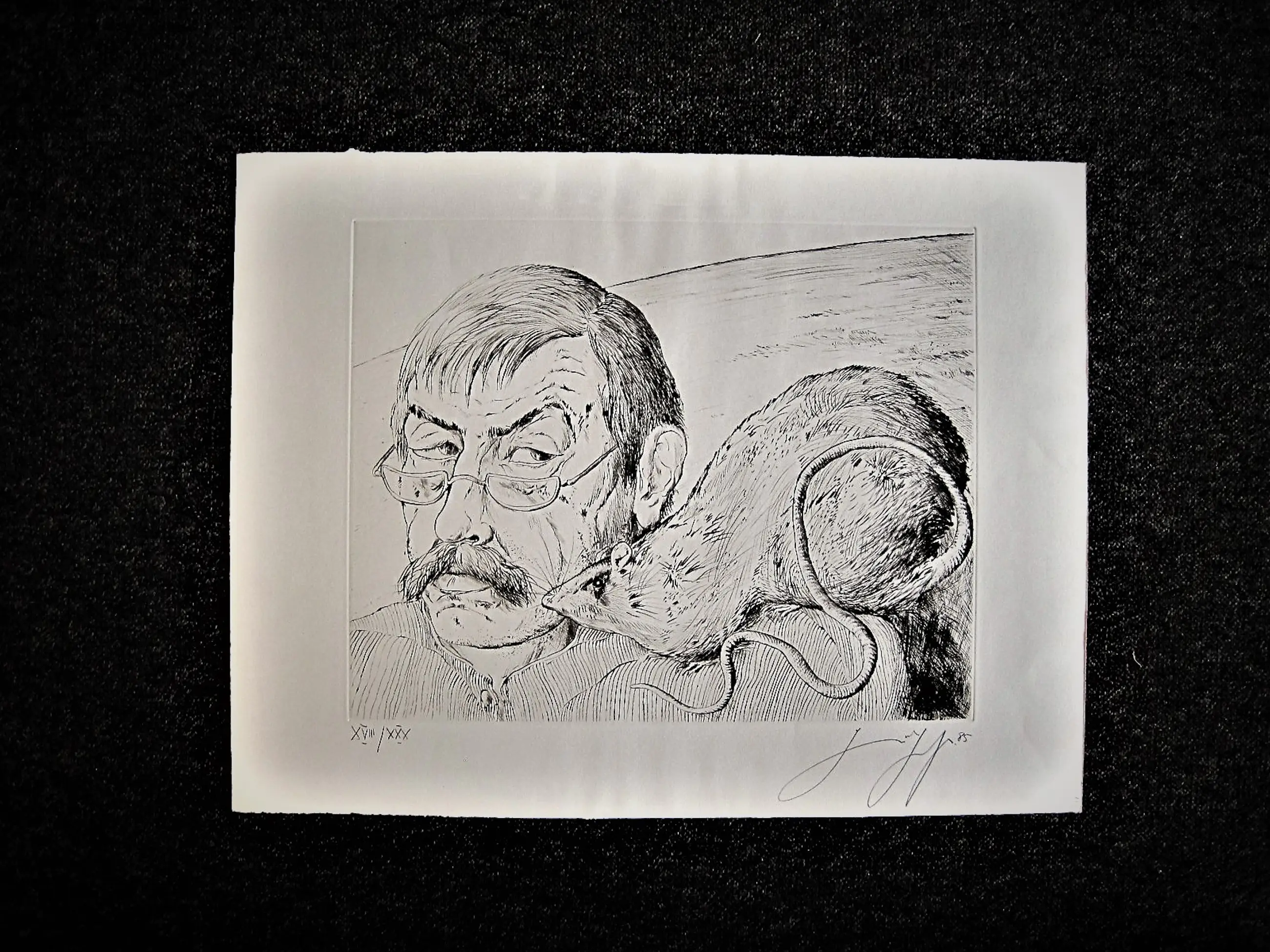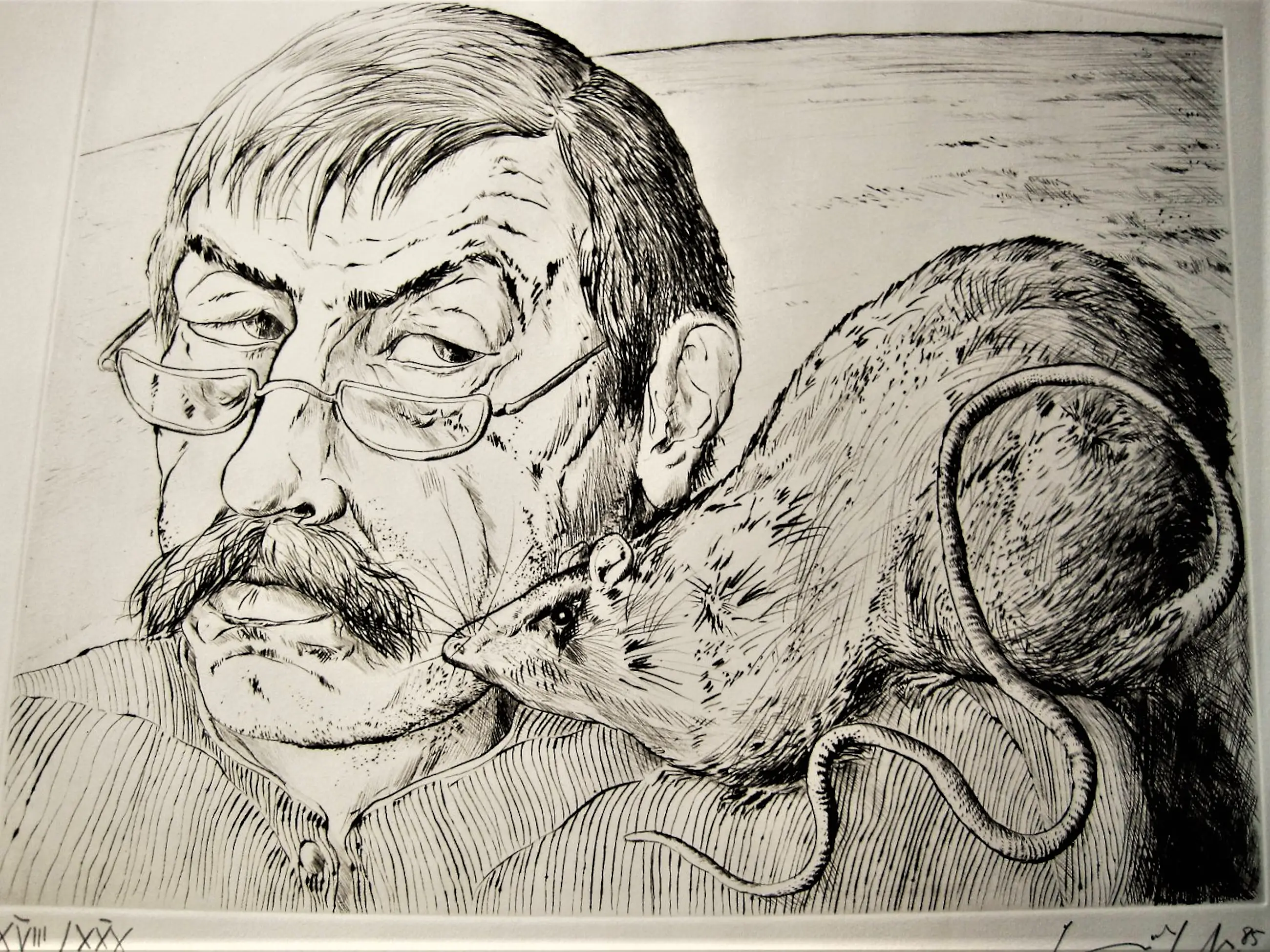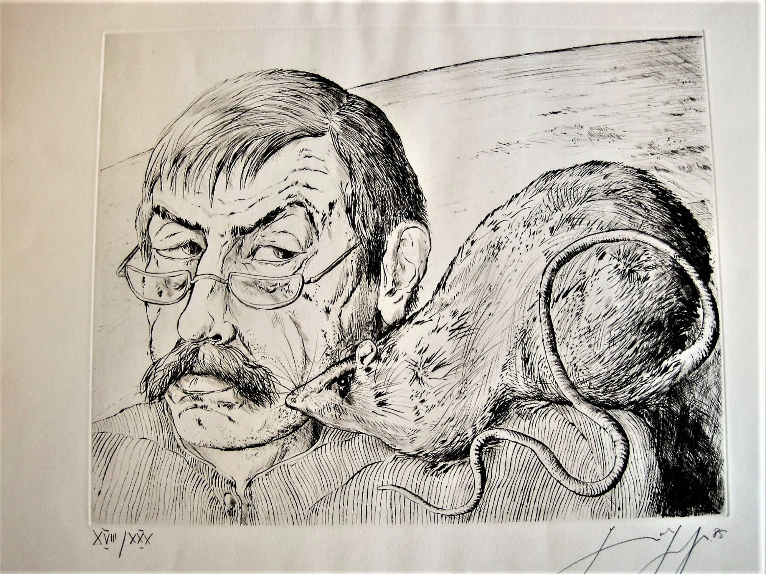 Große und besondere Kaltnadelradierung "Self -Portrait mit Ratte", die 1985 in einer sehr kleinen Auflage von nur 30 von Gunter Grass hergestellt wurde. Das Ätzen ist in sehr gutem Zustand und wird vom Künstler mit Bleistift unterschrieben und nummeriert. - Nicht gerahmt.