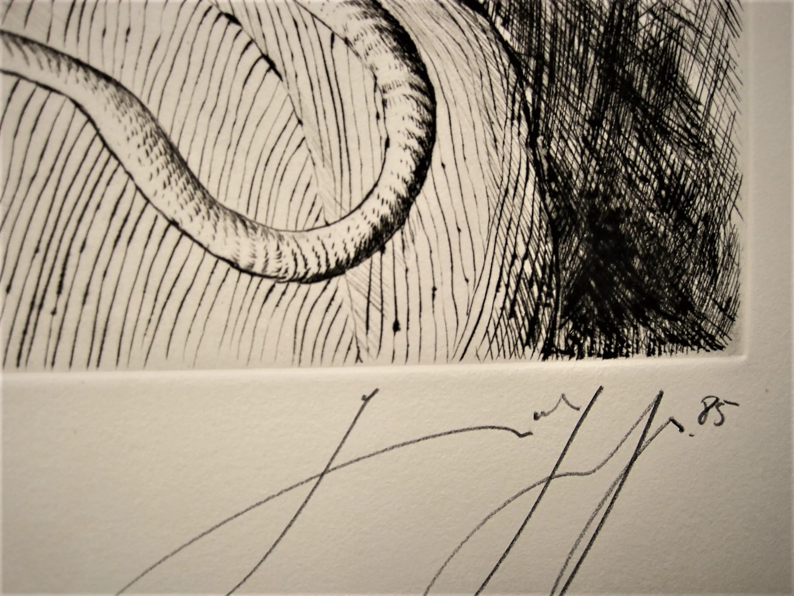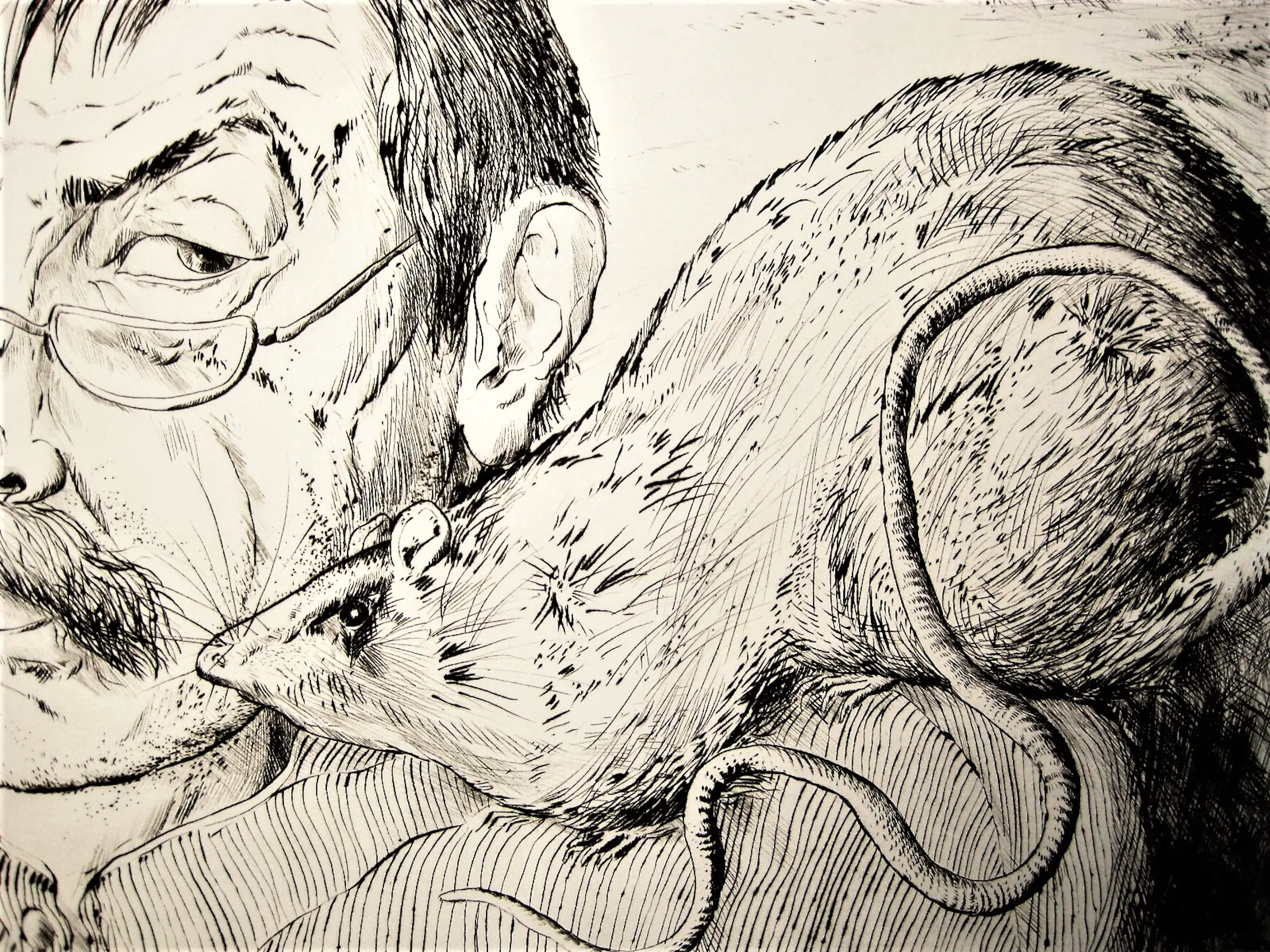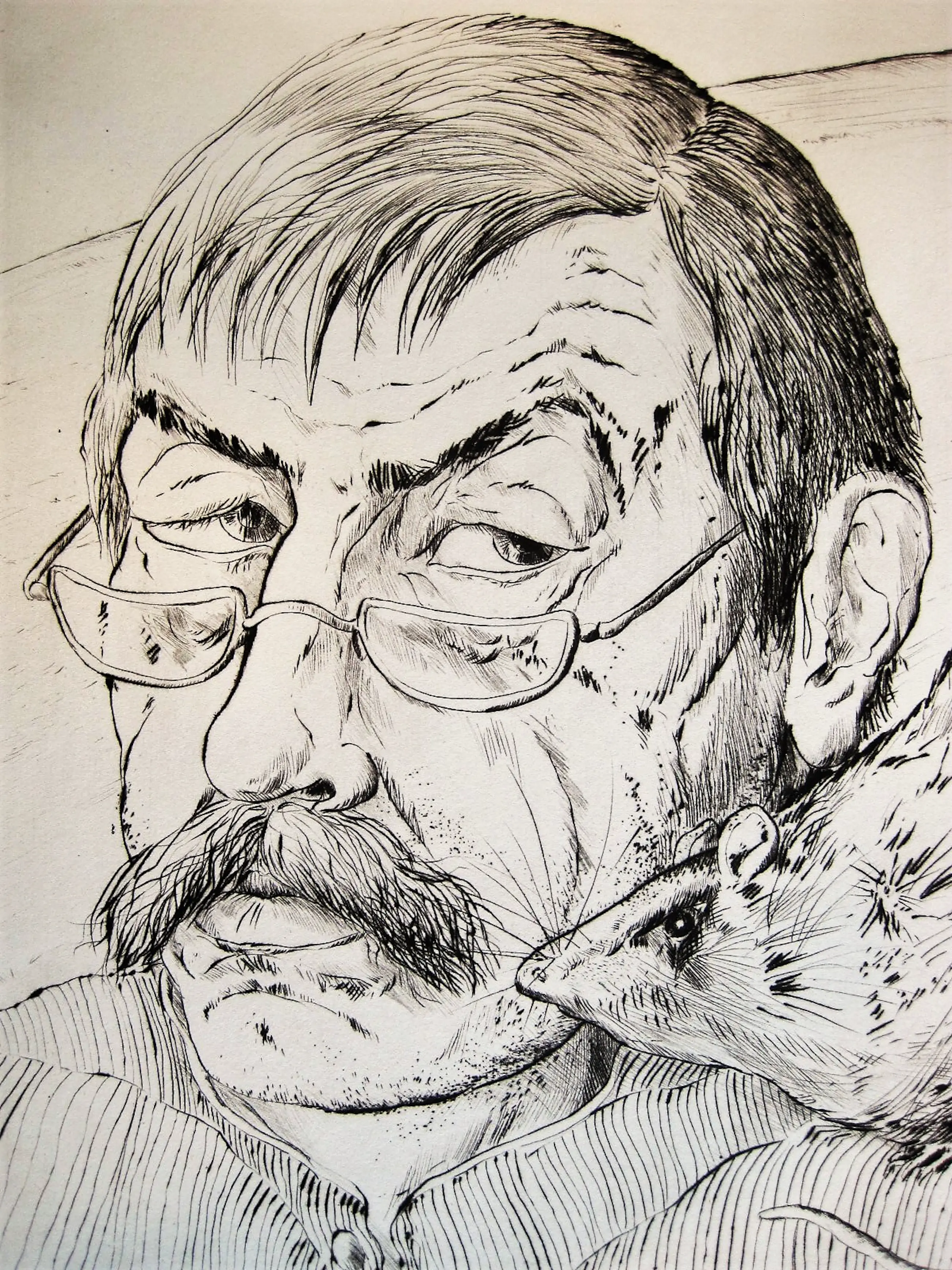 Große und besondere Kaltnadelradierung "Self -Portrait mit Ratte", die 1985 in einer sehr kleinen Auflage von nur 30 von Gunter Grass hergestellt wurde. Das Ätzen ist in sehr gutem Zustand und wird vom Künstler mit Bleistift unterschrieben und nummeriert. - Nicht gerahmt.