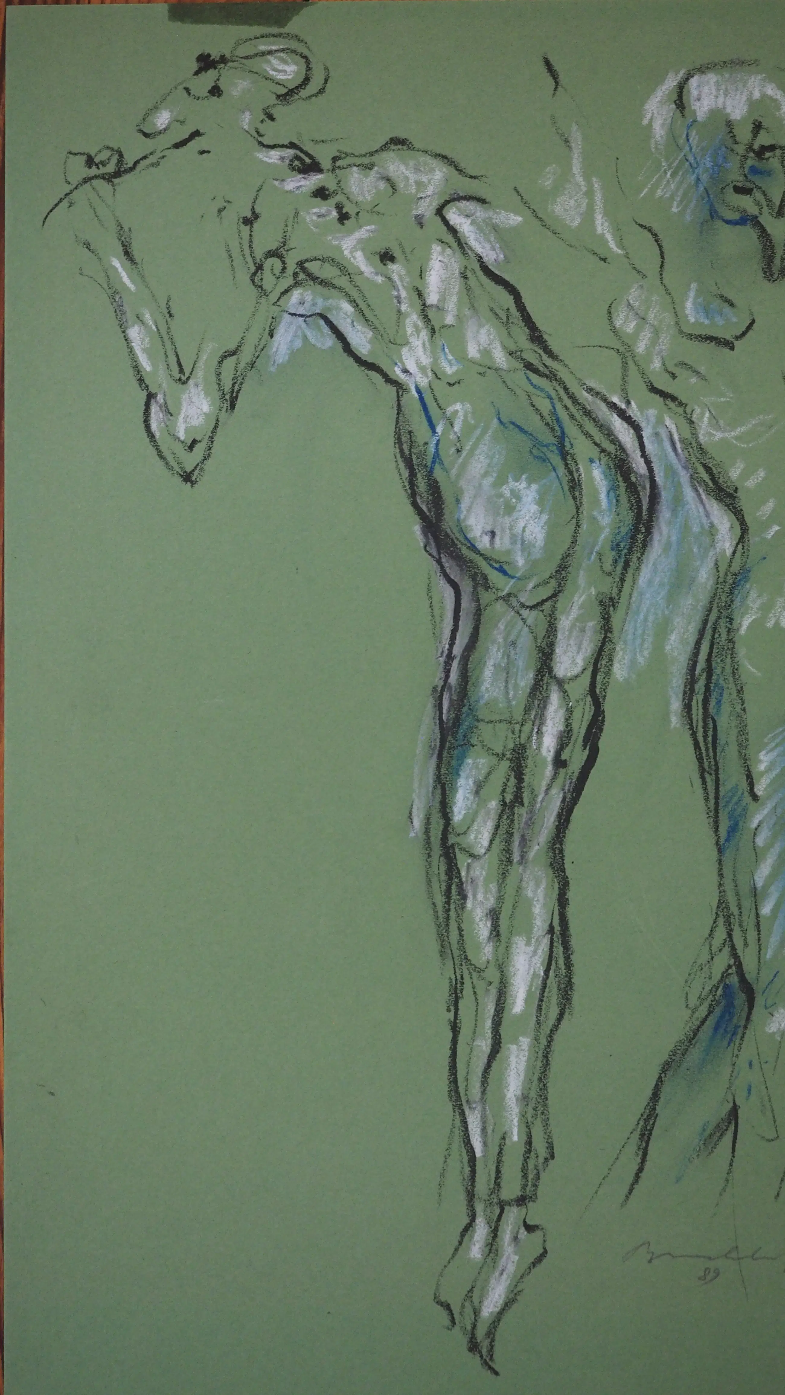 Man en vrouw, naakt, krijttekening op groen papier, aan de bovenrand van het blad 2 verkleuringen van het papier door het op de achterkant aangebrachte plakpapier