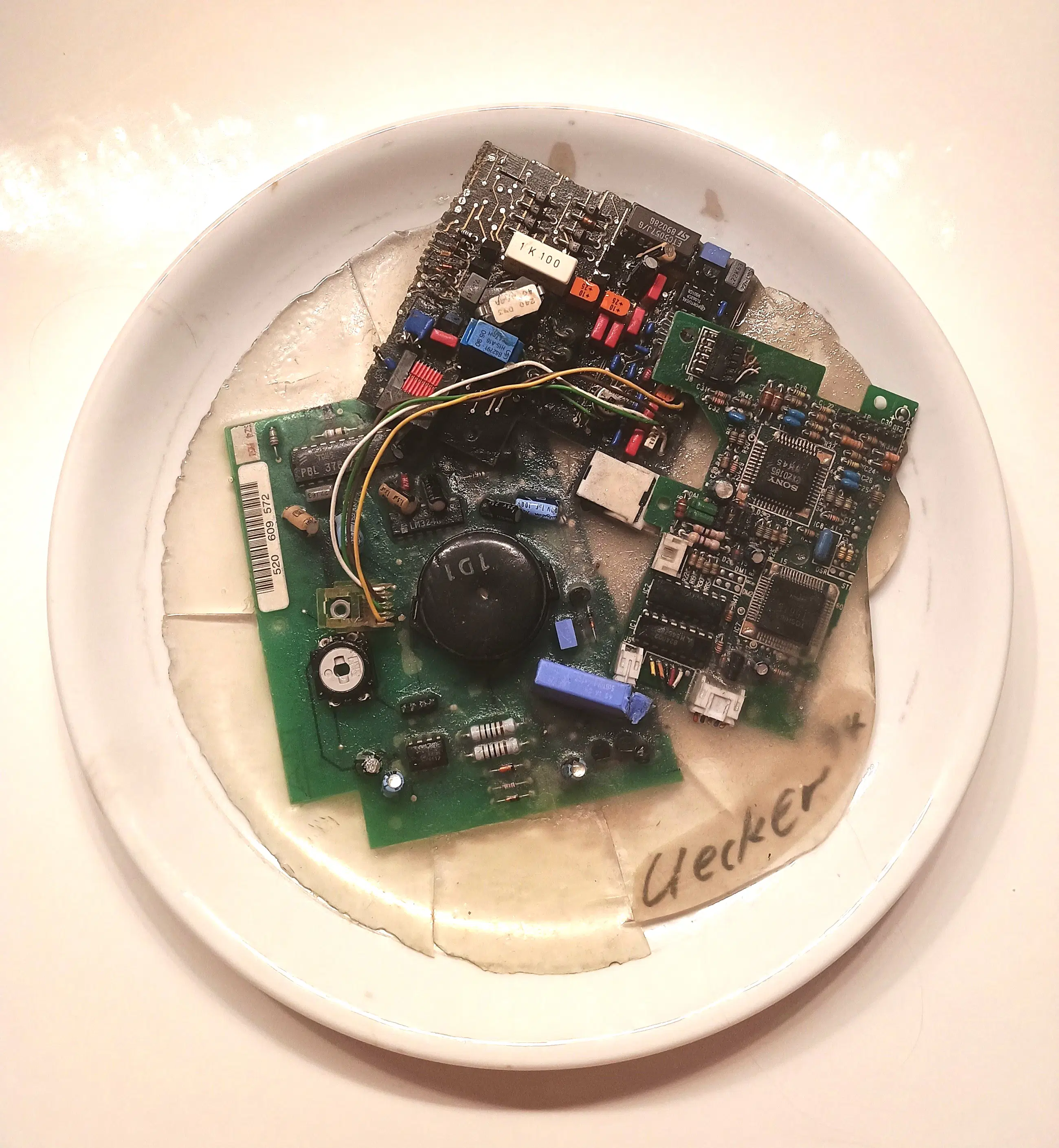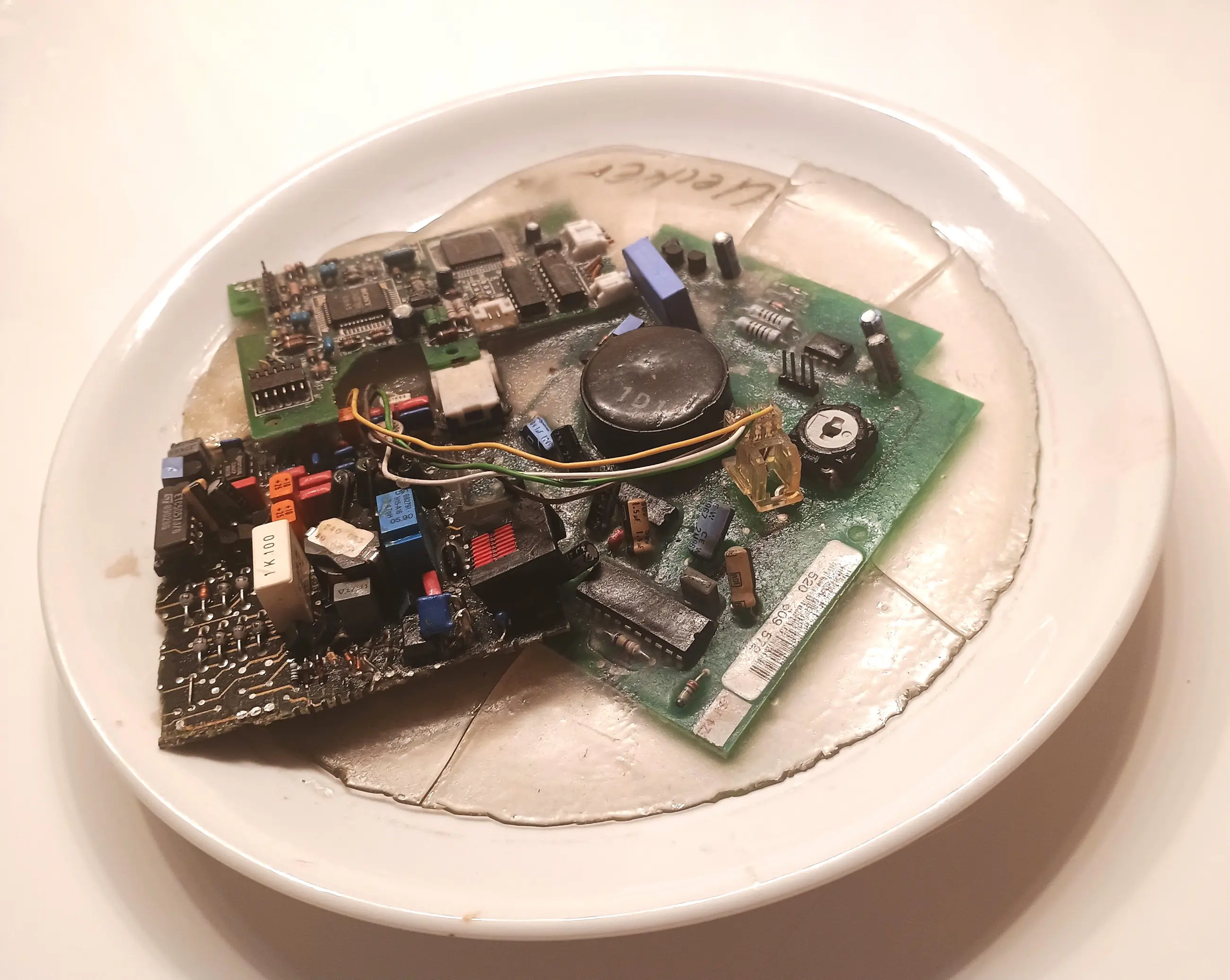 Technologie: Elektronische componenten gegoten in kunsthars, gemonteerd op een plaat.