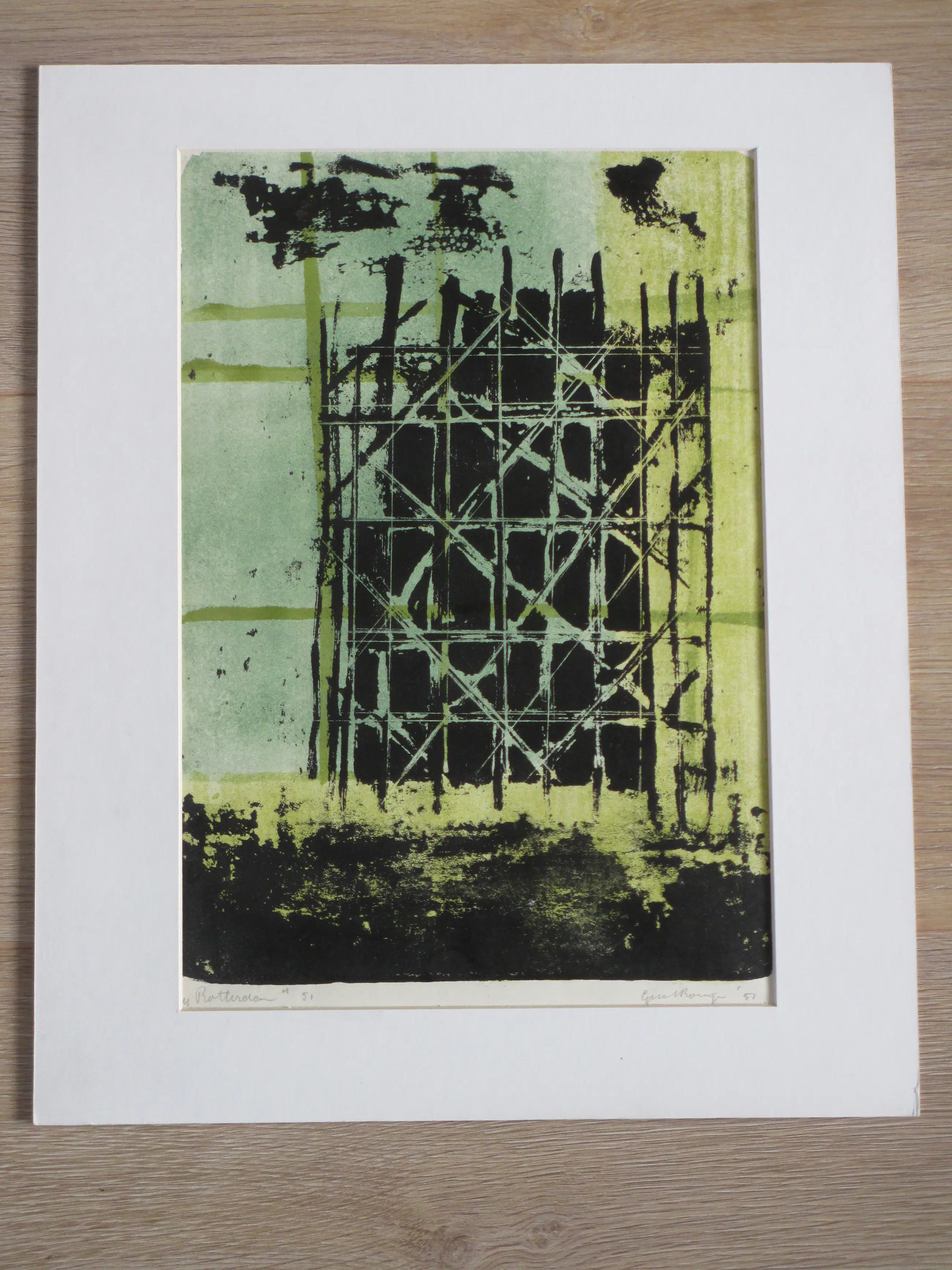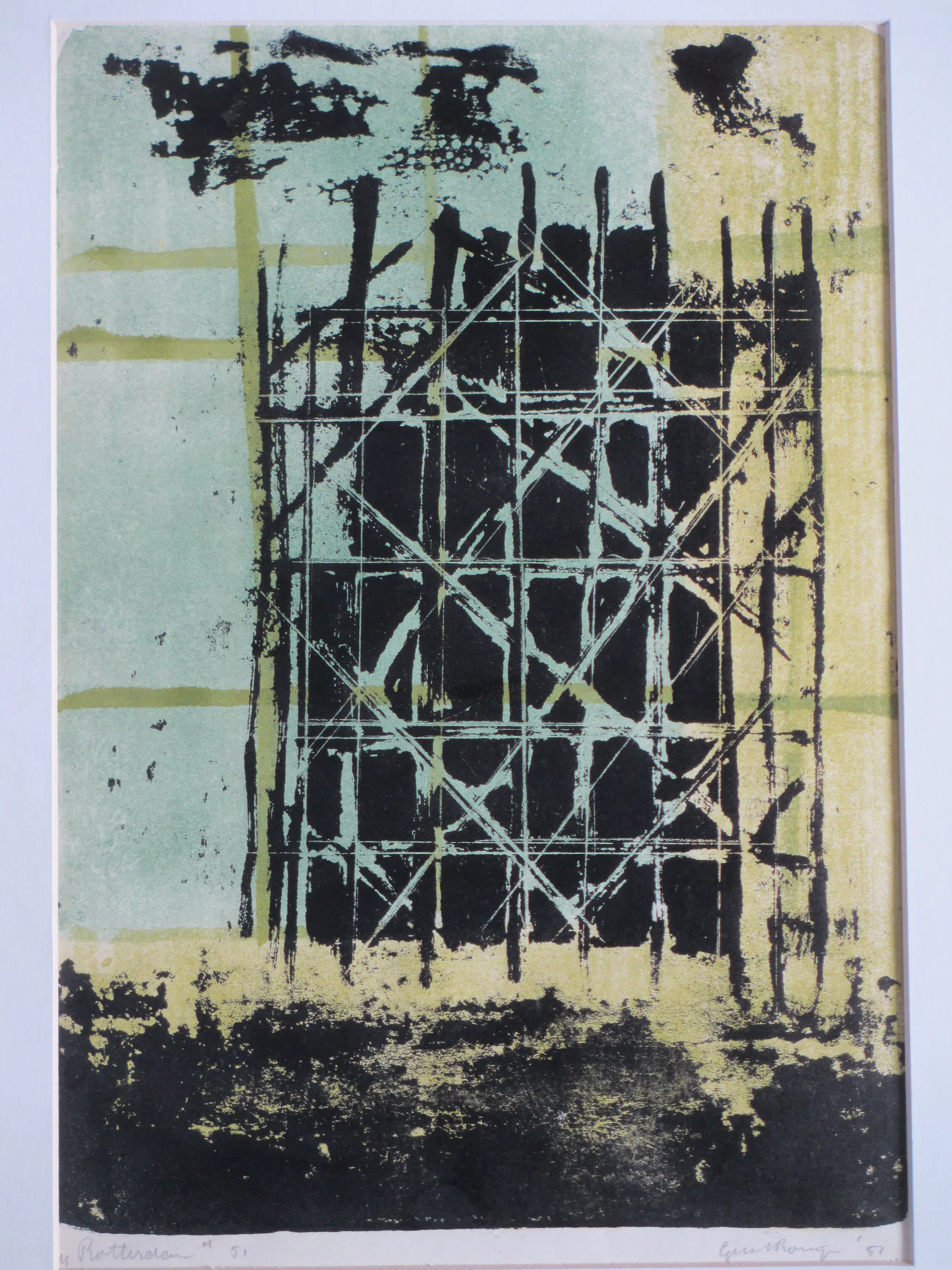 Kleurlitho door Gust Romijn Constructivistische voorstelling van Rotterdam Losbladig, beeldmaat 37x26, bladmaat 45x34 Gesigneerd en gedateerd in potlood r.o.: 'Gust Romijn '51' Getiteld en gedateerd in potlood l.o.: "Rotterdam" en '51' Authenticiteit volledig gegarandeerd